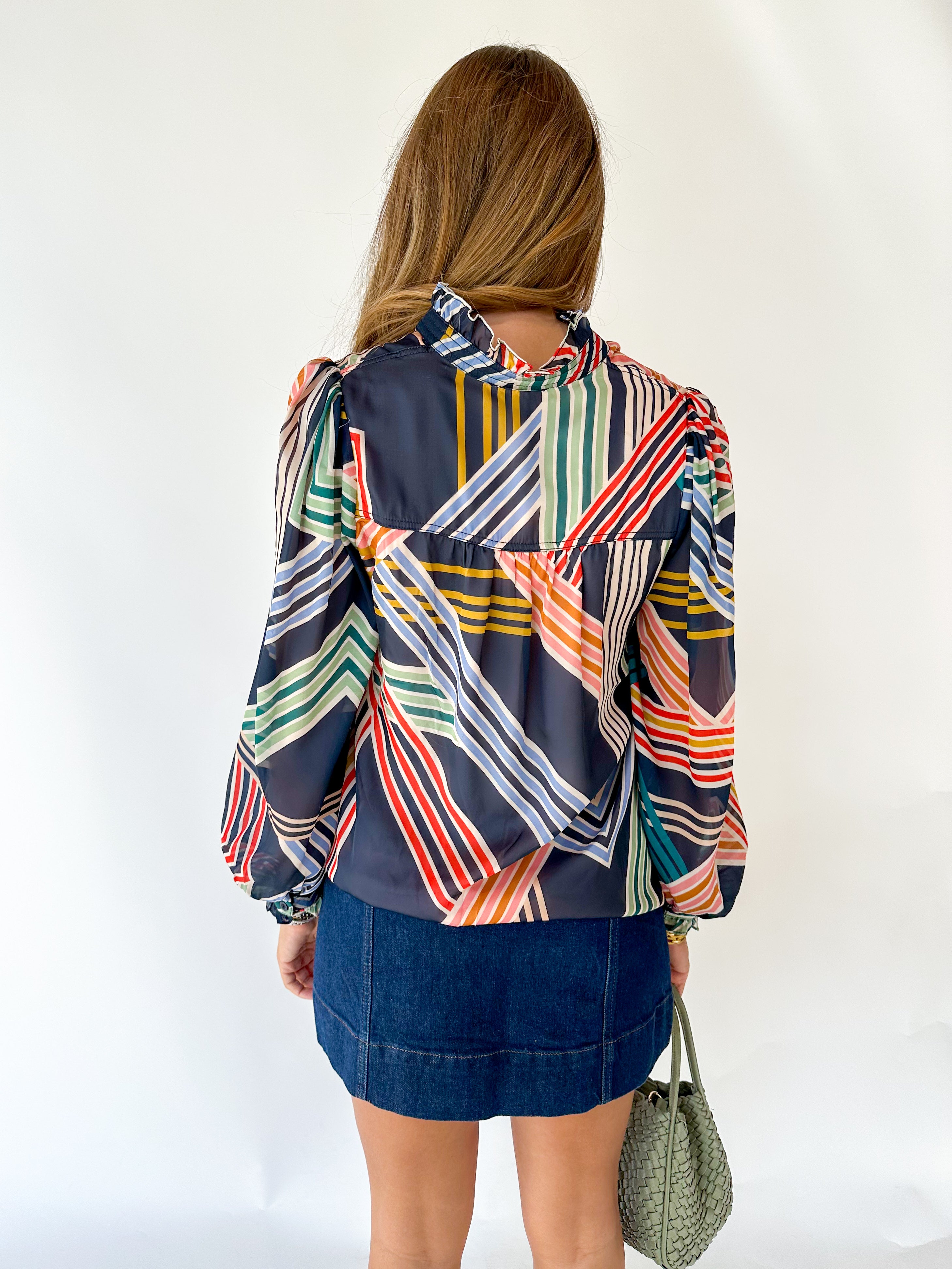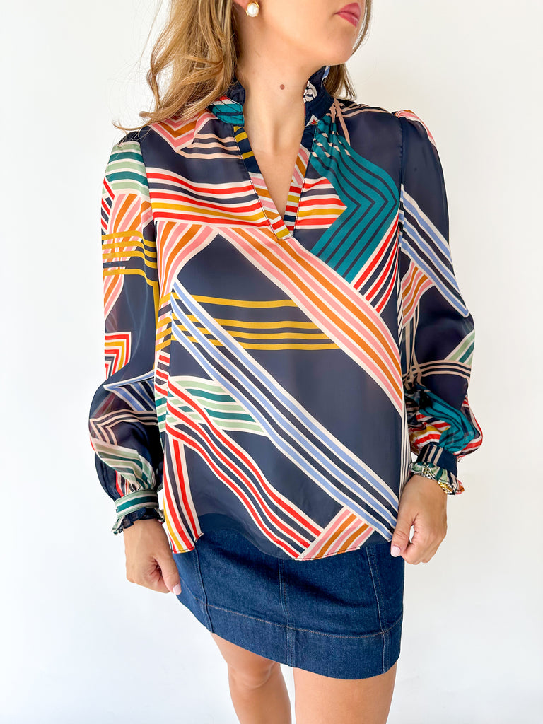 Elevate your wardrobe with this Geometric Top, featuring a flattering split V-neck that adds a touch of sophistication. The long sleeves end in delicate ruffle trims that perfectly complement the neckline, creating a harmonious and chic look. Its bold geometric print ensures you stand out while offering versatility for both casual and dressy occasions. Embrace effortless style and comfort with this eye-catching blouse.