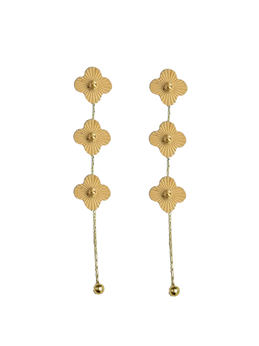 Add a sleek and modern touch to your everyday wardrobe with these easy and on-trend gold plated stainless steel earrings. Featuring three delicate clover charms that swing and sparkle with every movement, these weightless earrings are the perfect easy, update to pair with both neutrals and prints. Best of all, the 3.5” duster style is basically weightless!