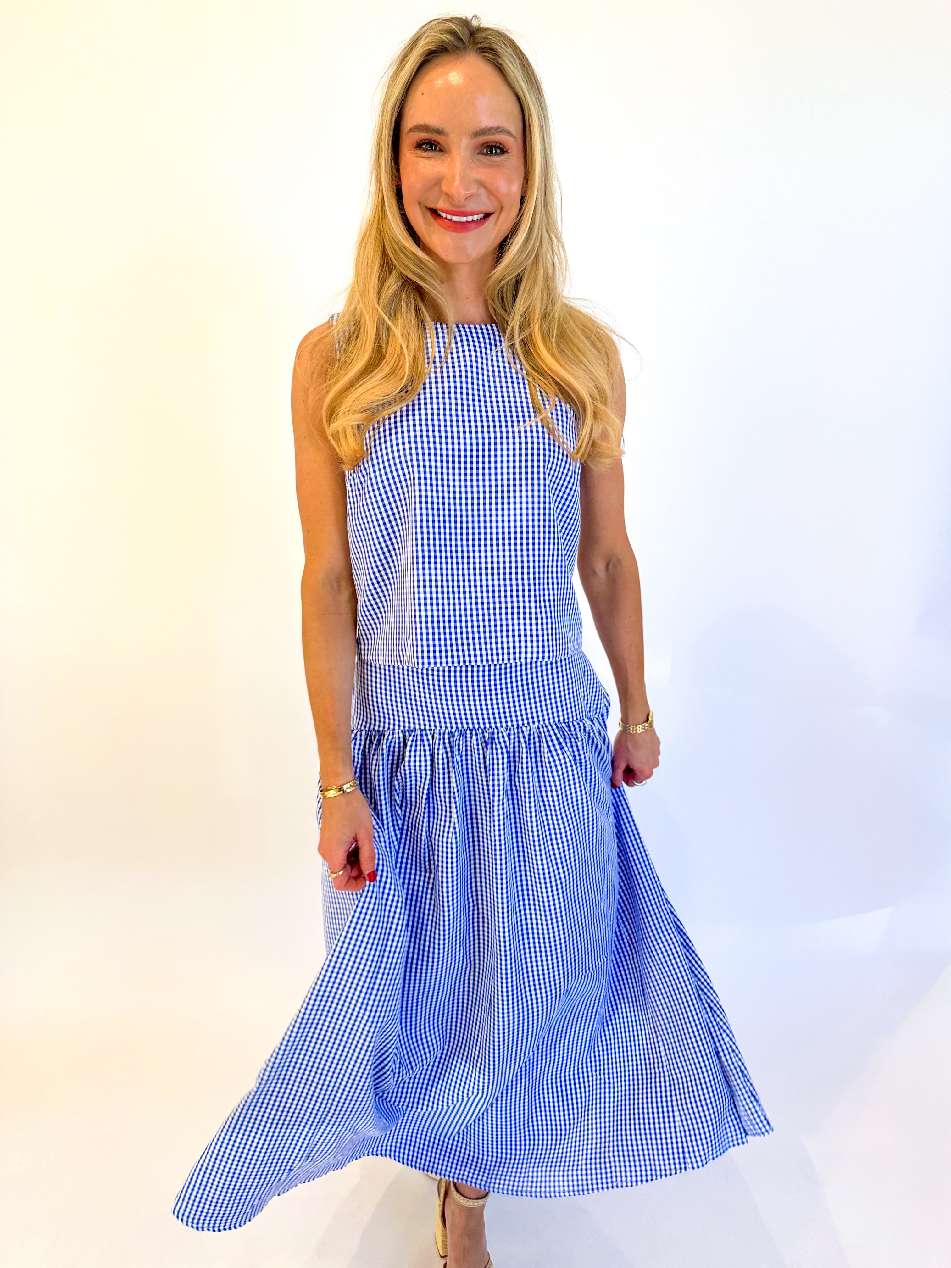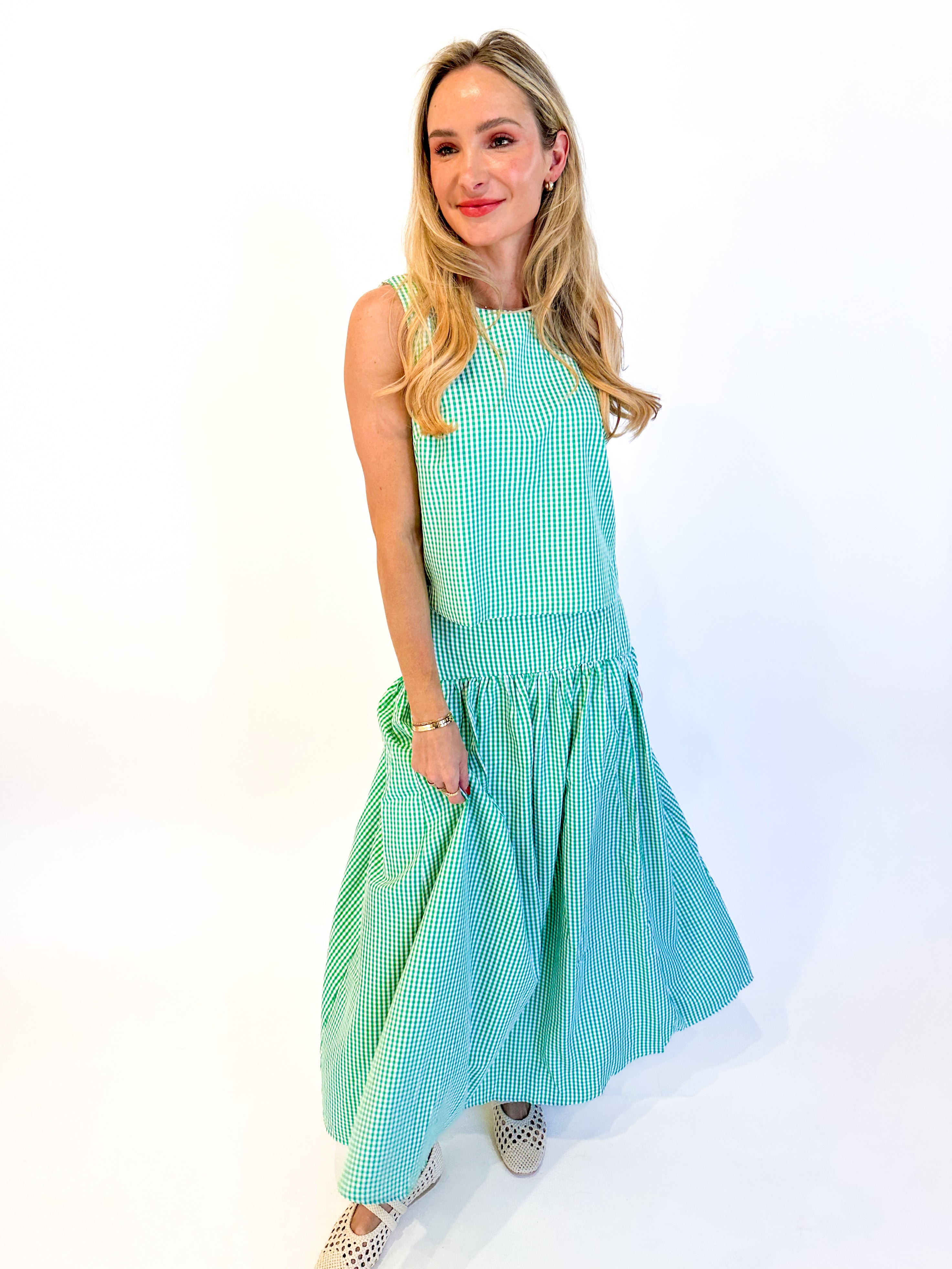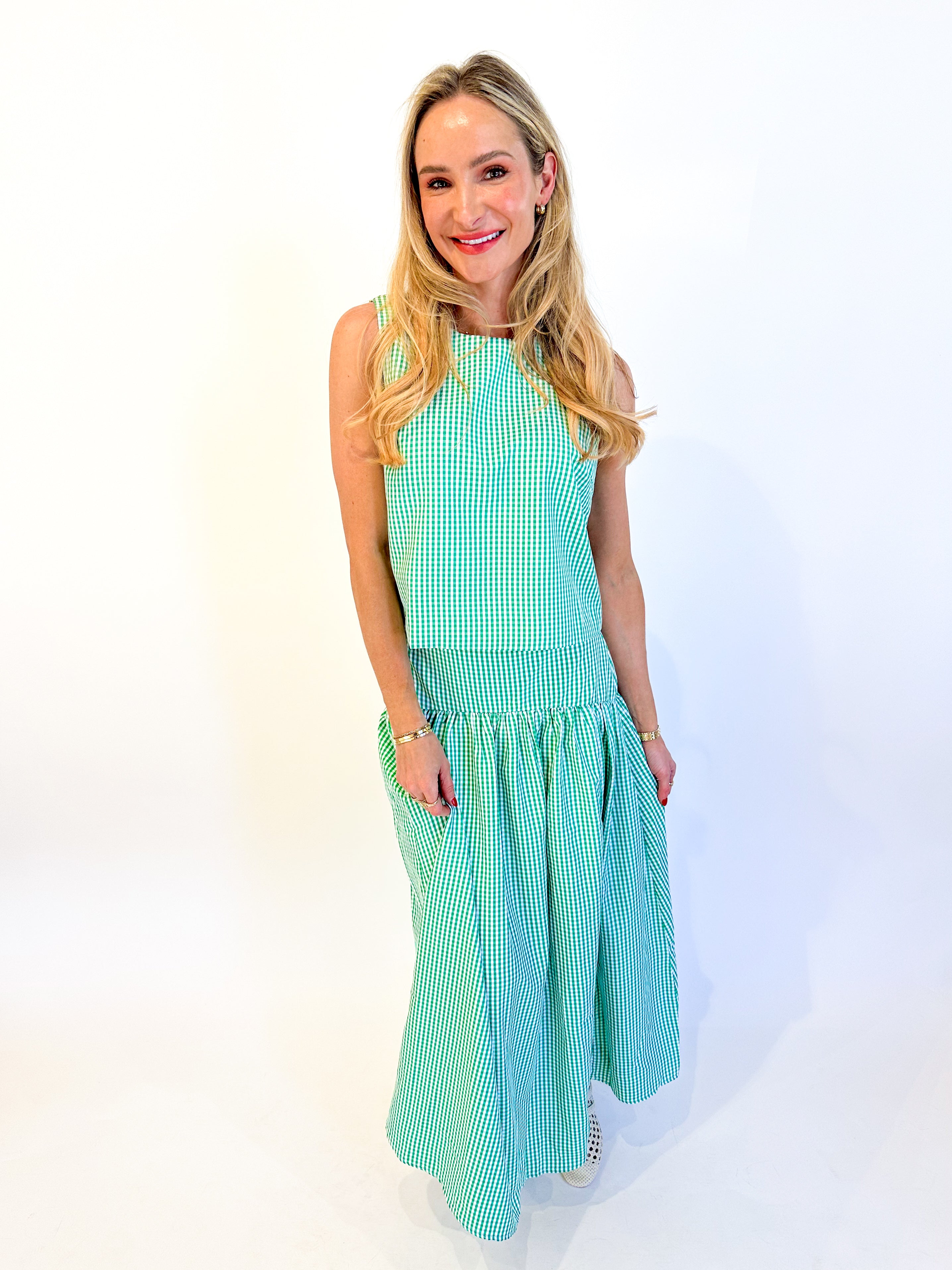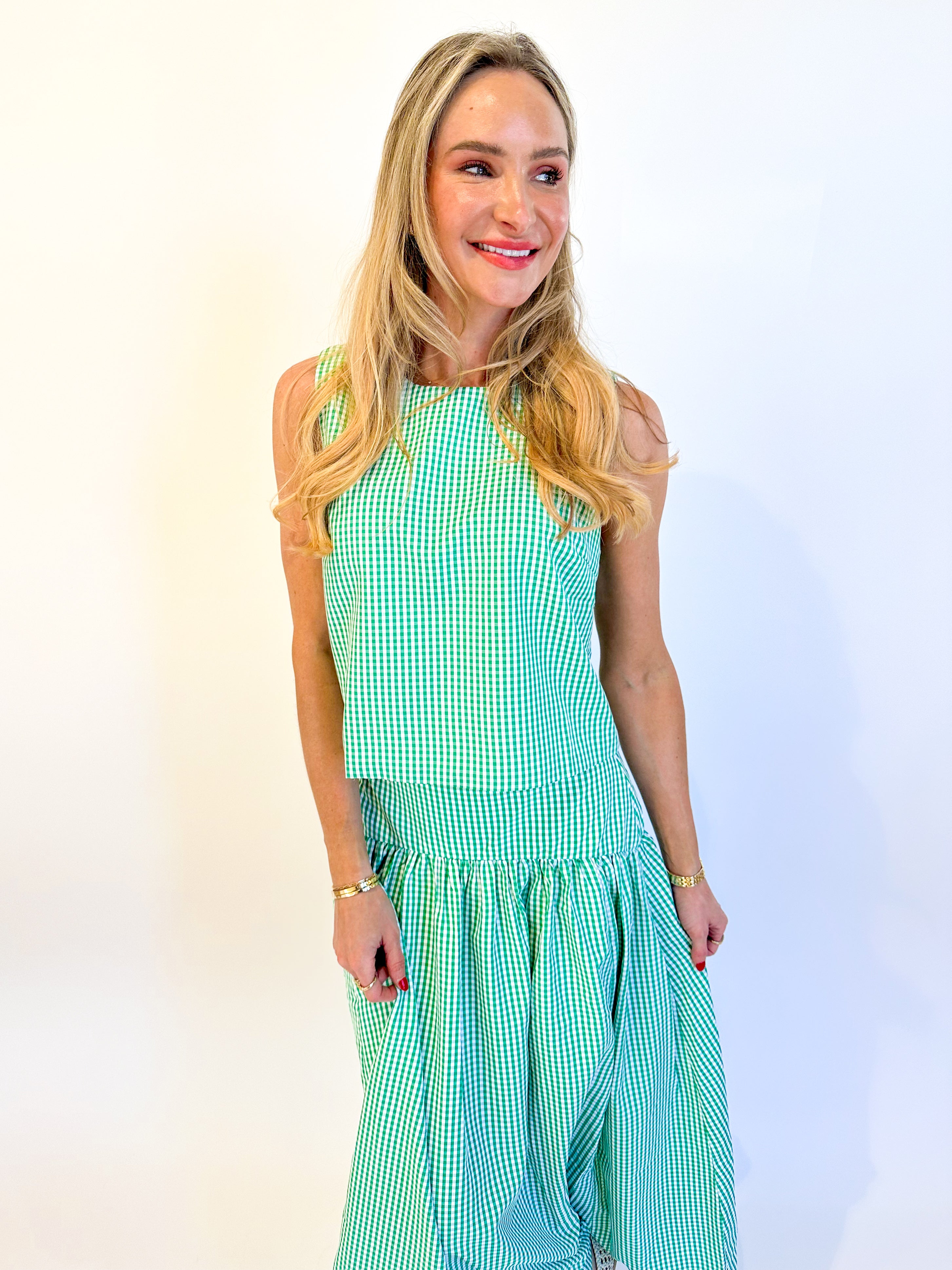 Effortless spring style starts here. This sleeveless gingham top features a flattering scoop neck and straight fit in crisp blue or green. Layer it solo or pair with our matching midi skirt for a coordinated look that's perfect for garden parties, brunches, and every warm-weather occasion ahead.