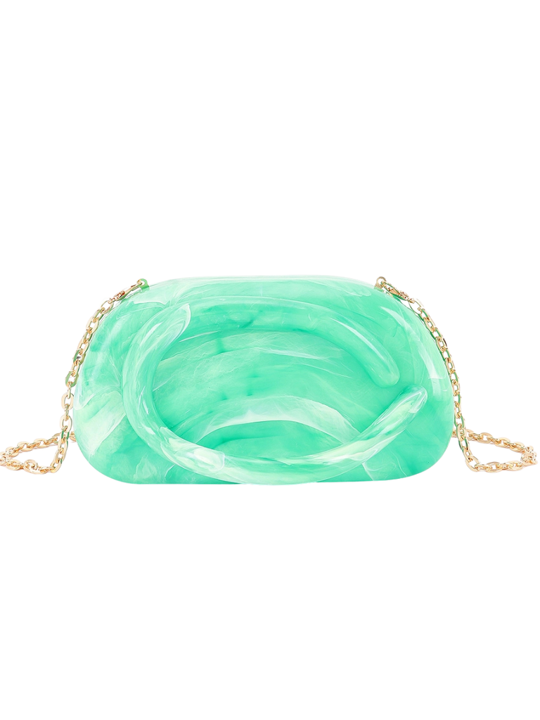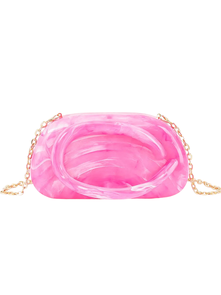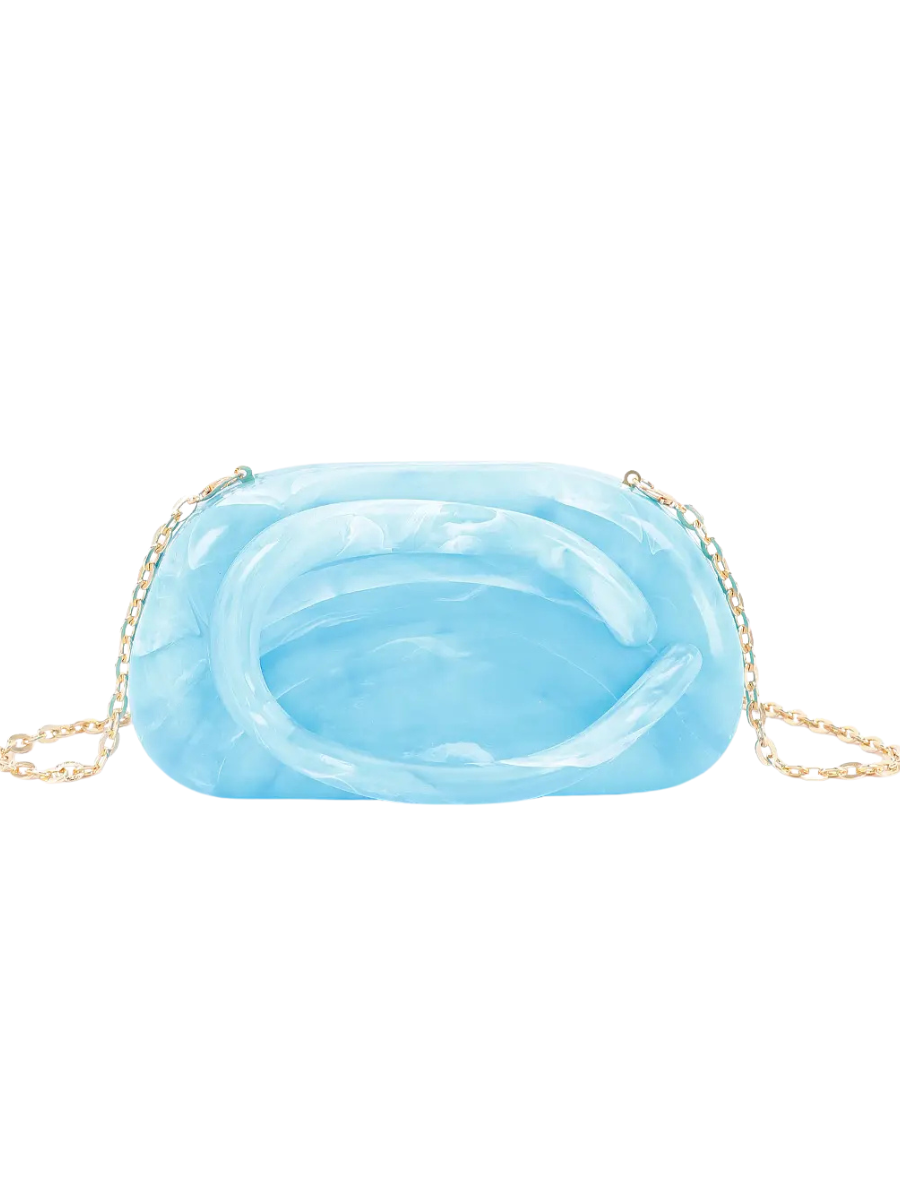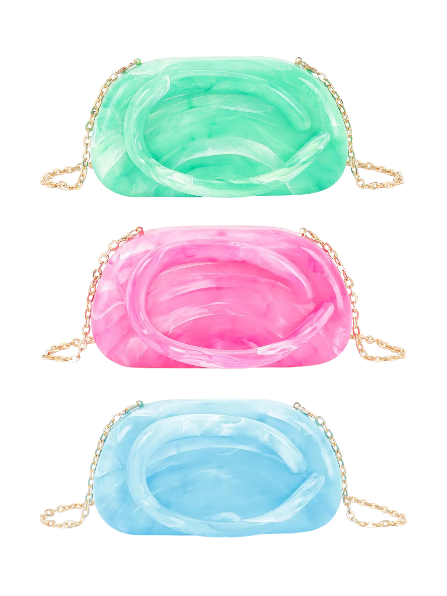 Elevate your holiday ensemble with this stunning acrylic marbled handle clutch—a show-stopping accessory that brings instant glamour to any outfit. Featuring a chic gold chain strap for versatile carrying and a gorgeous marbled acrylic handle, this clutch is the perfect pop of personality your festive looks need. Choose from three gorgeous color options to match your style and make a statement at every celebration this season.