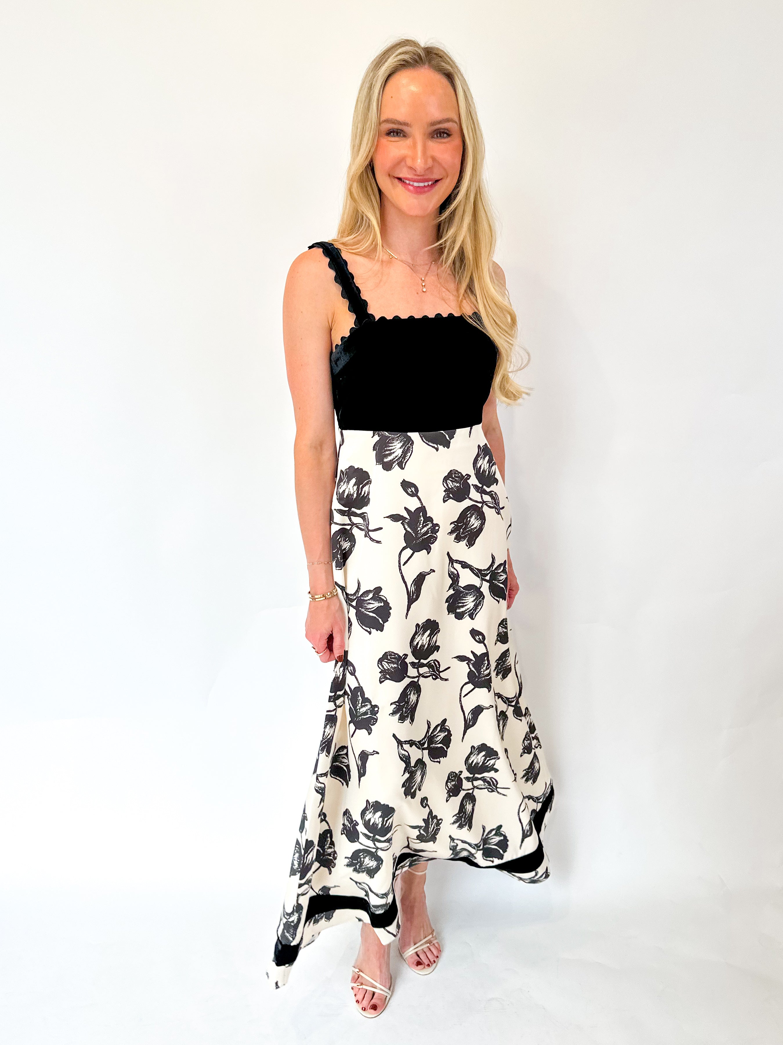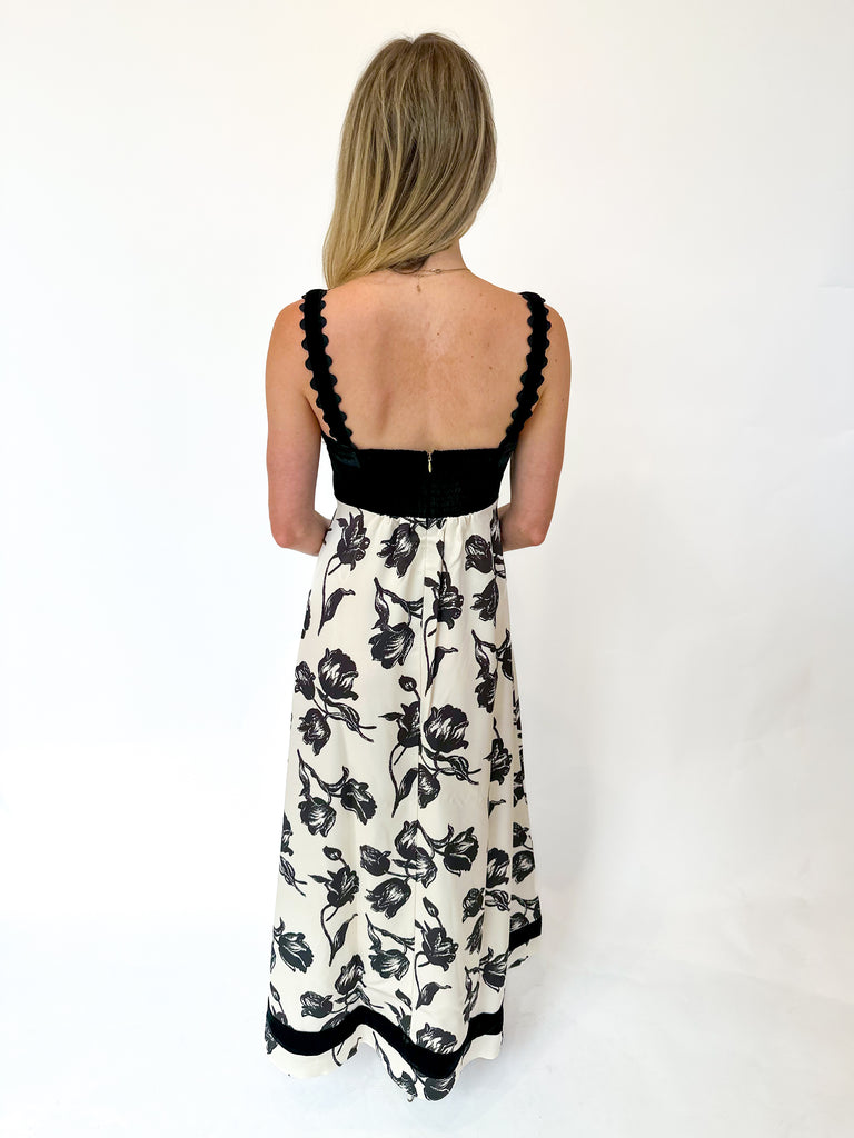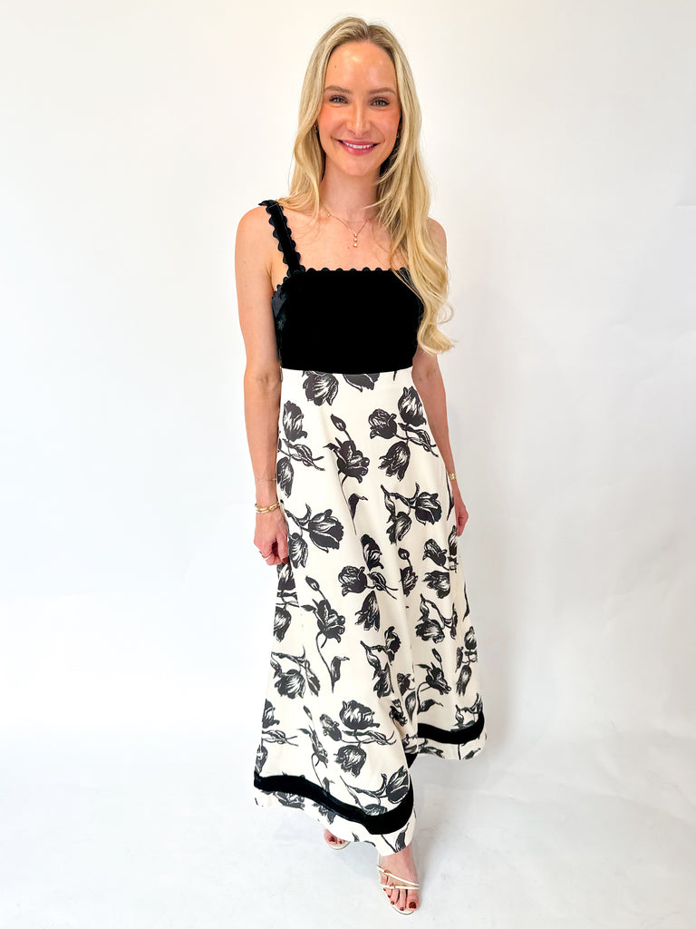 Effortlessly elegant, this fan-favorite maxi dress combines luxe black velvet straps and bust with a stunning black and white floral skirt. Finished with plush velvet trim at the hem, it's the perfect piece for making a sophisticated statement at any occasion.