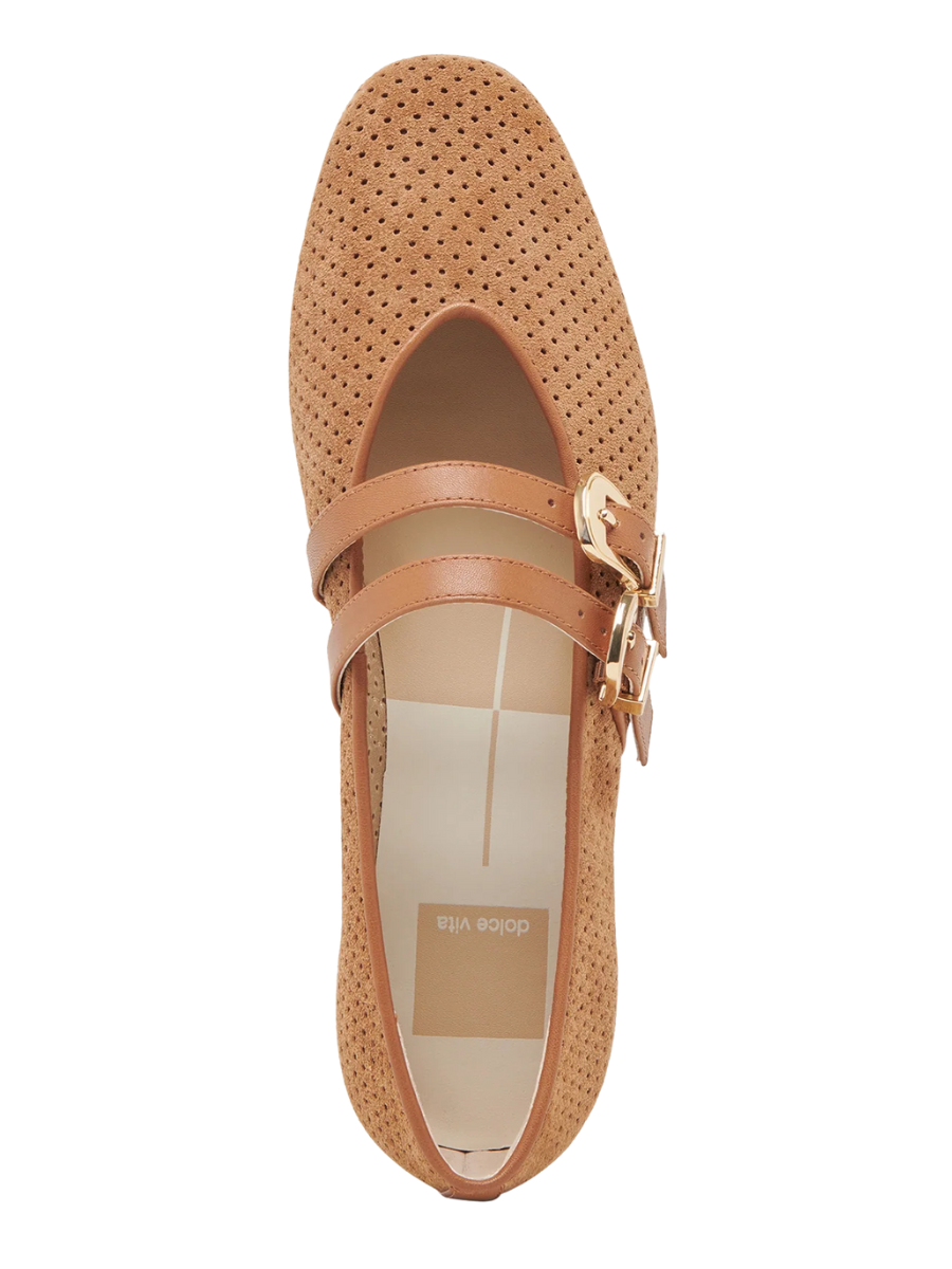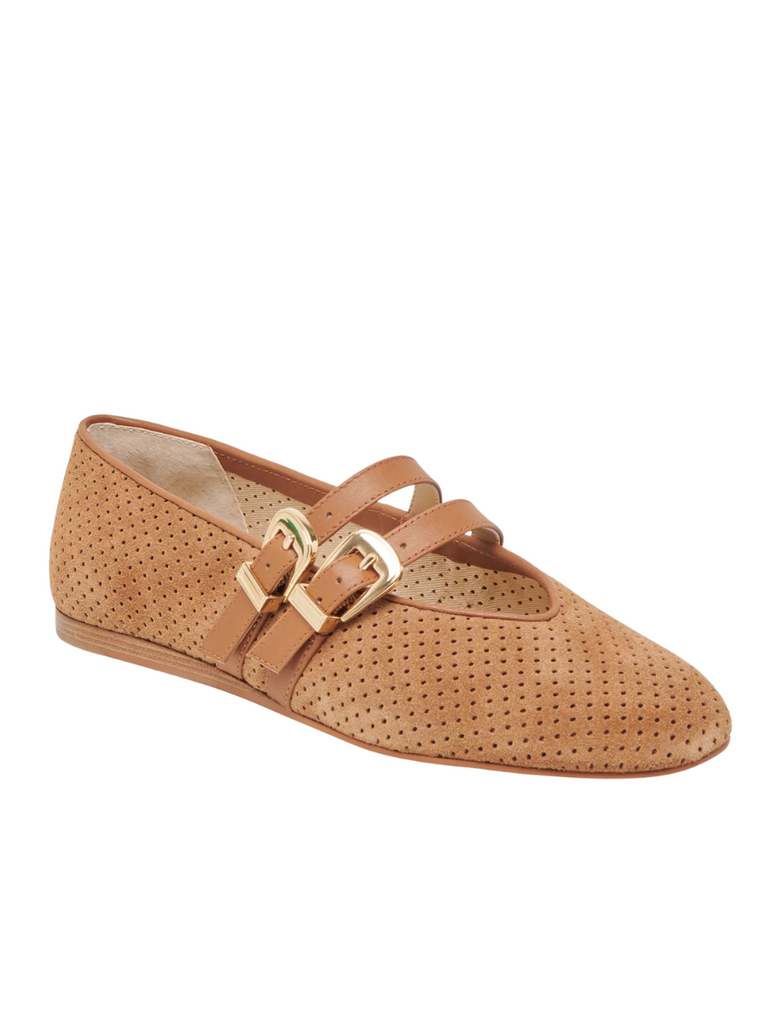 Step into effortless style this fall with the Baylee Ballet Flat. Crafted in pecan-colored suede, these flats feature delicate perforated details for breathability and charm. A double leather strap with a gold buckle adds secure fit and a touch of elegance. Perfect for everyday wear, they combine comfort and sophistication to complement your seasonal wardrobe seamlessly.