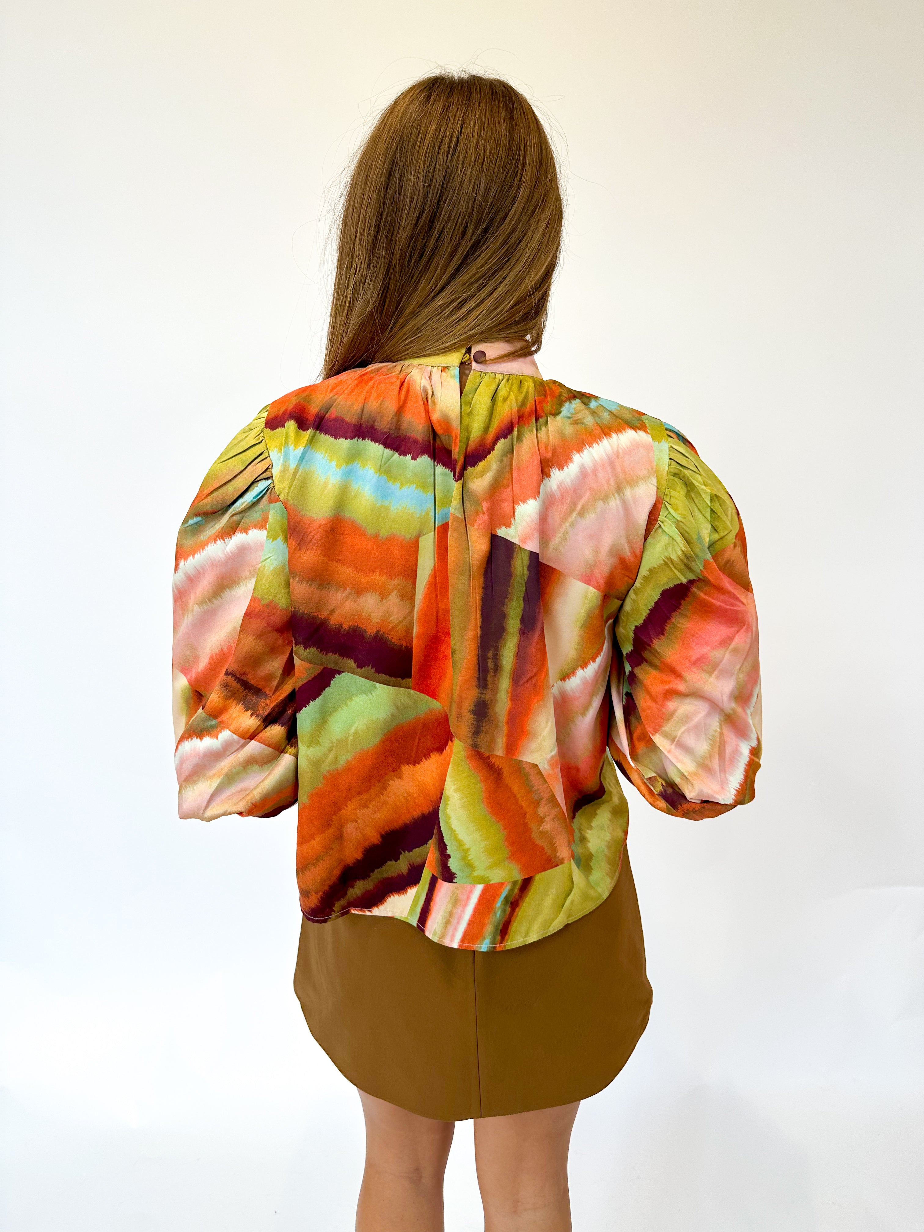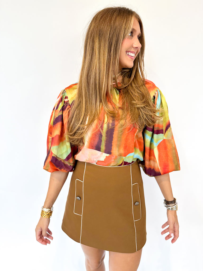 Elevate your seasonal wardrobe with the Carmen Top in Agate. Featuring a high neckline and a flowing silhouette, this top showcases a vibrant autumn print that captures the essence of the season. The delicate tie at the back adds a subtle, elegant detail. Versatile by design, wear it with the matching skirt for a coordinated look or pair it with deep brown denim to effortlessly transition from casual to chic throughout autumn.