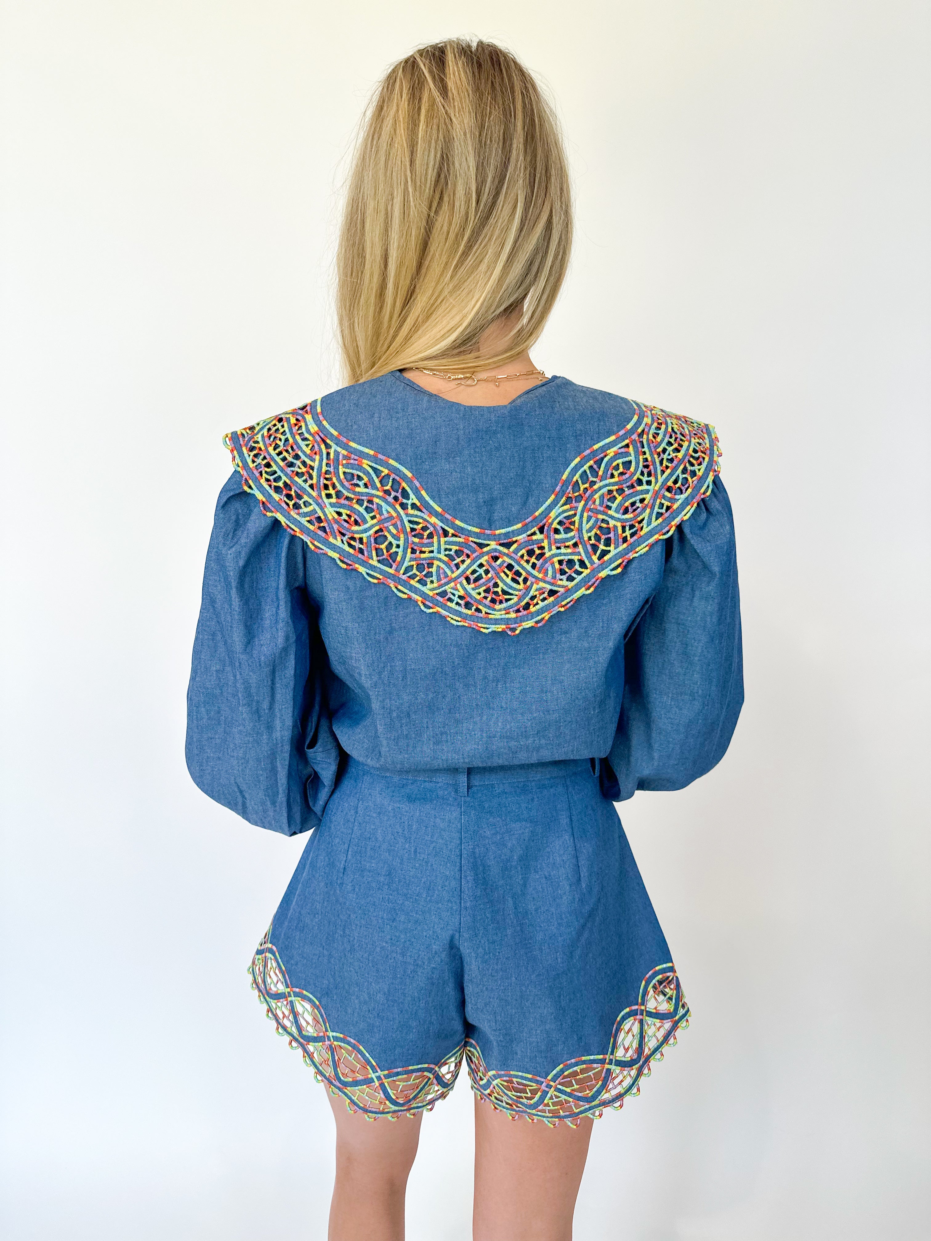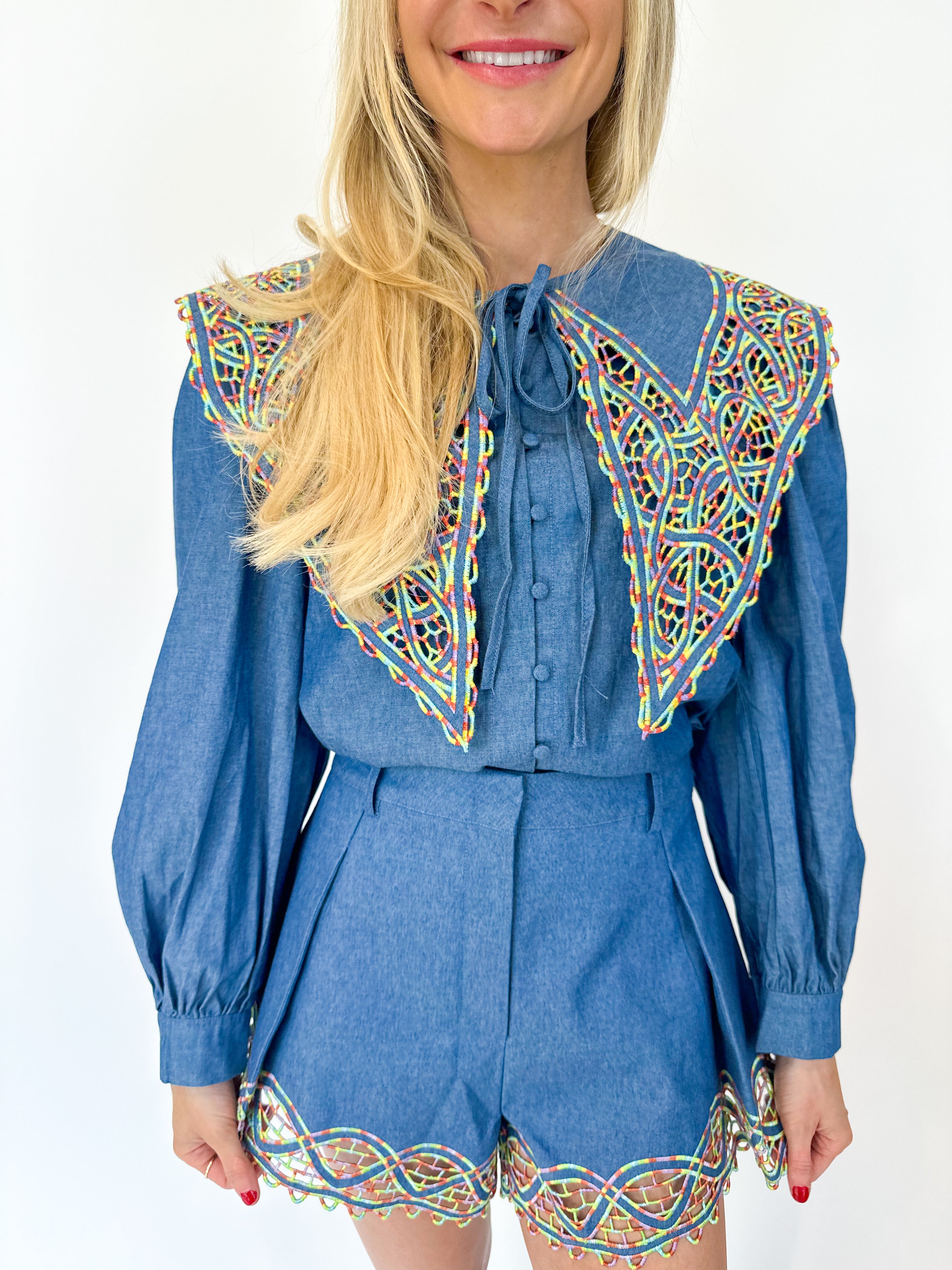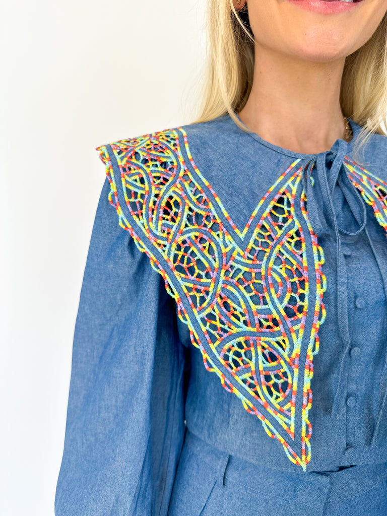 The classiest of blouses, the Begoña Top is crafted from soft denim color and finished with an oversized embroidered collar in greens, yellows and oranges that steals the spotlight. Voluminous sleeves and a delicate tie-neck detail add romantic flair to this structured yet playful silhouette