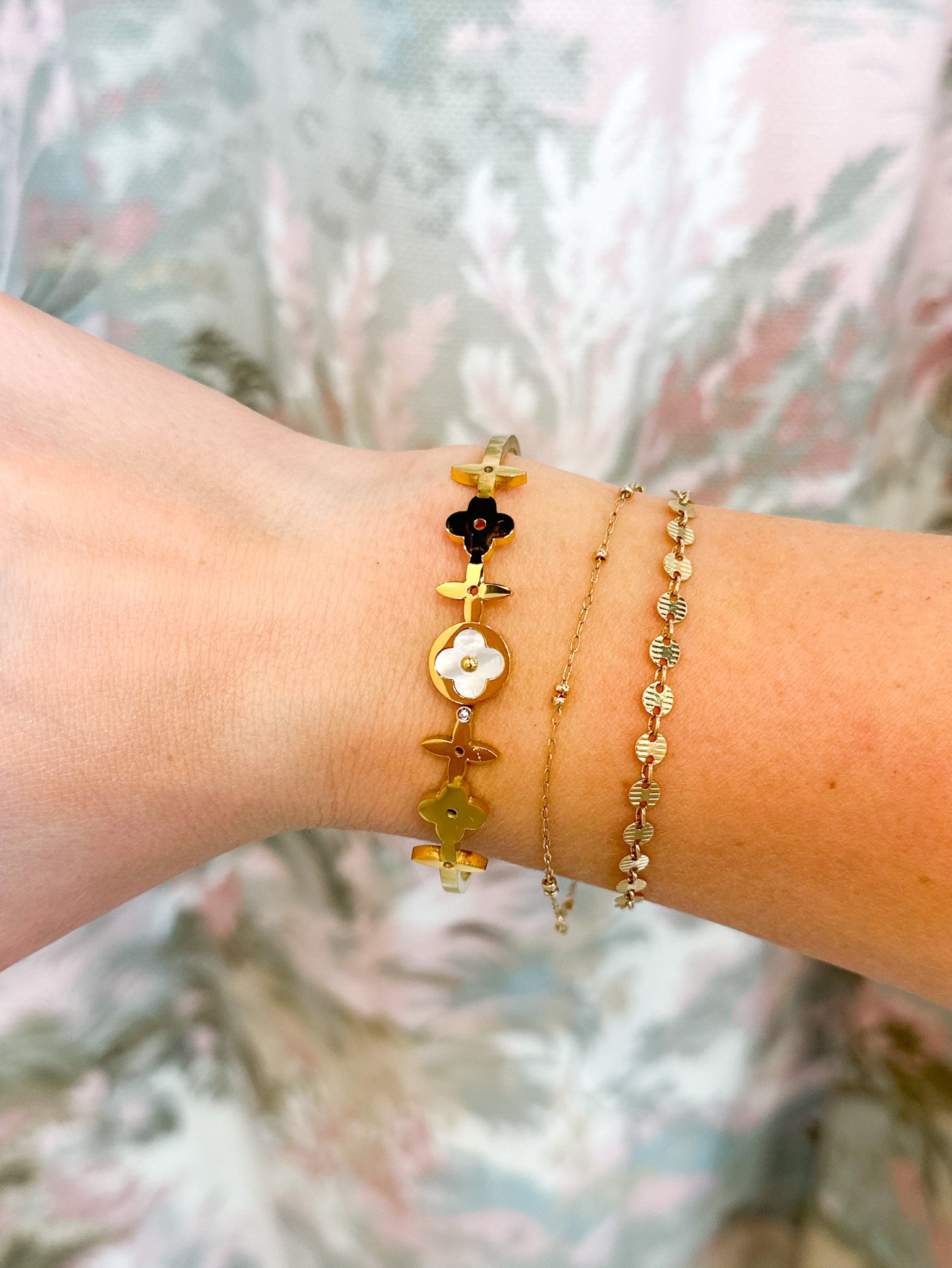 This stunning gold clover cuff bracelet adds a touch of luck and style to any outfit. Its intricate clover design is sure to catch the eye and bring some extra charm to your day. Elevate your look with this must-have accessory!