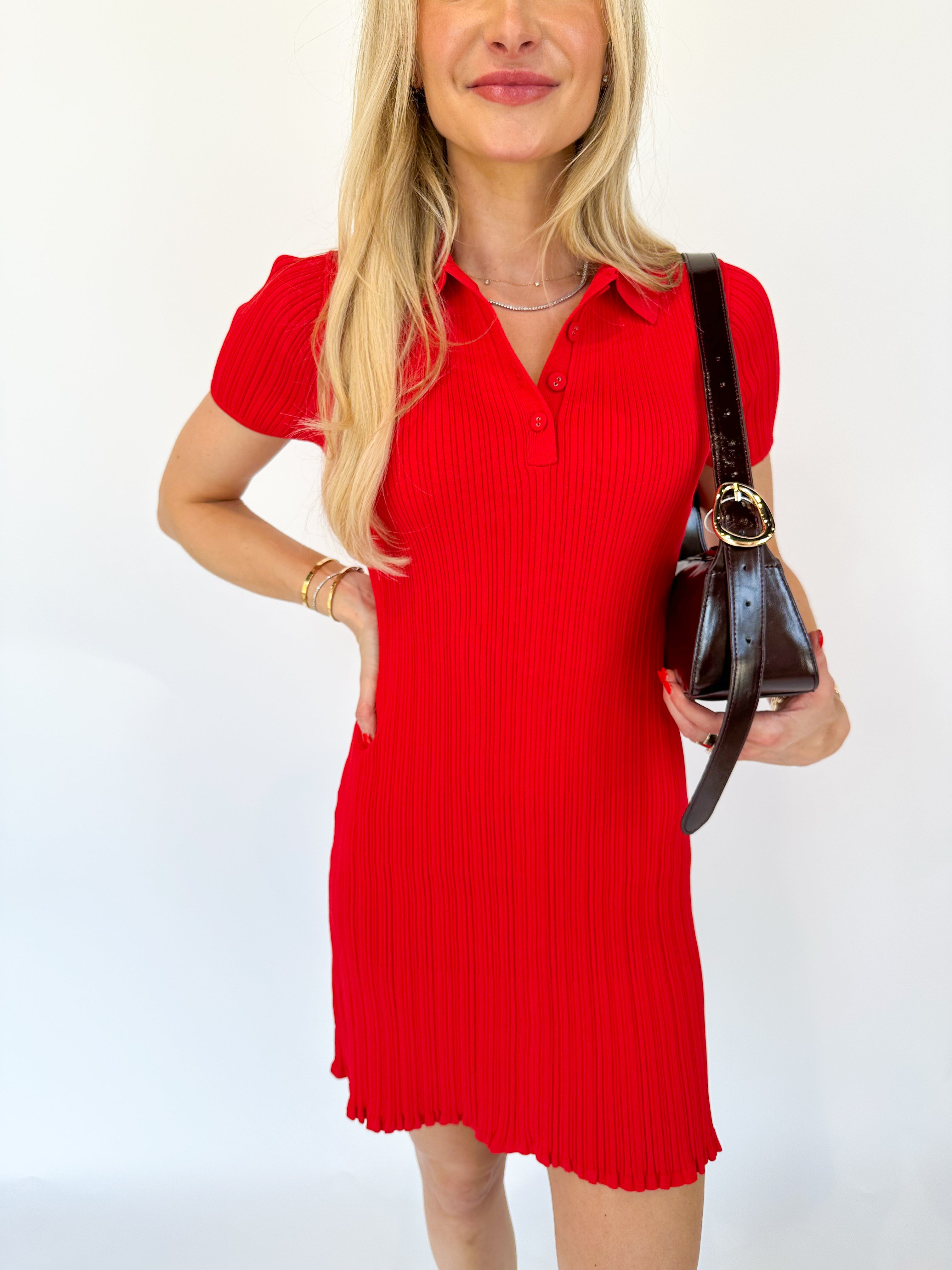 The Crinkle Knit Short Sleeve Mini Dress is a fresh take on sporty chic. Made from lightweight rib knit, it features an easy A-line silhouette, short sleeves, and a classic polo collar—perfect for days when you want to look put together without trying too hard.