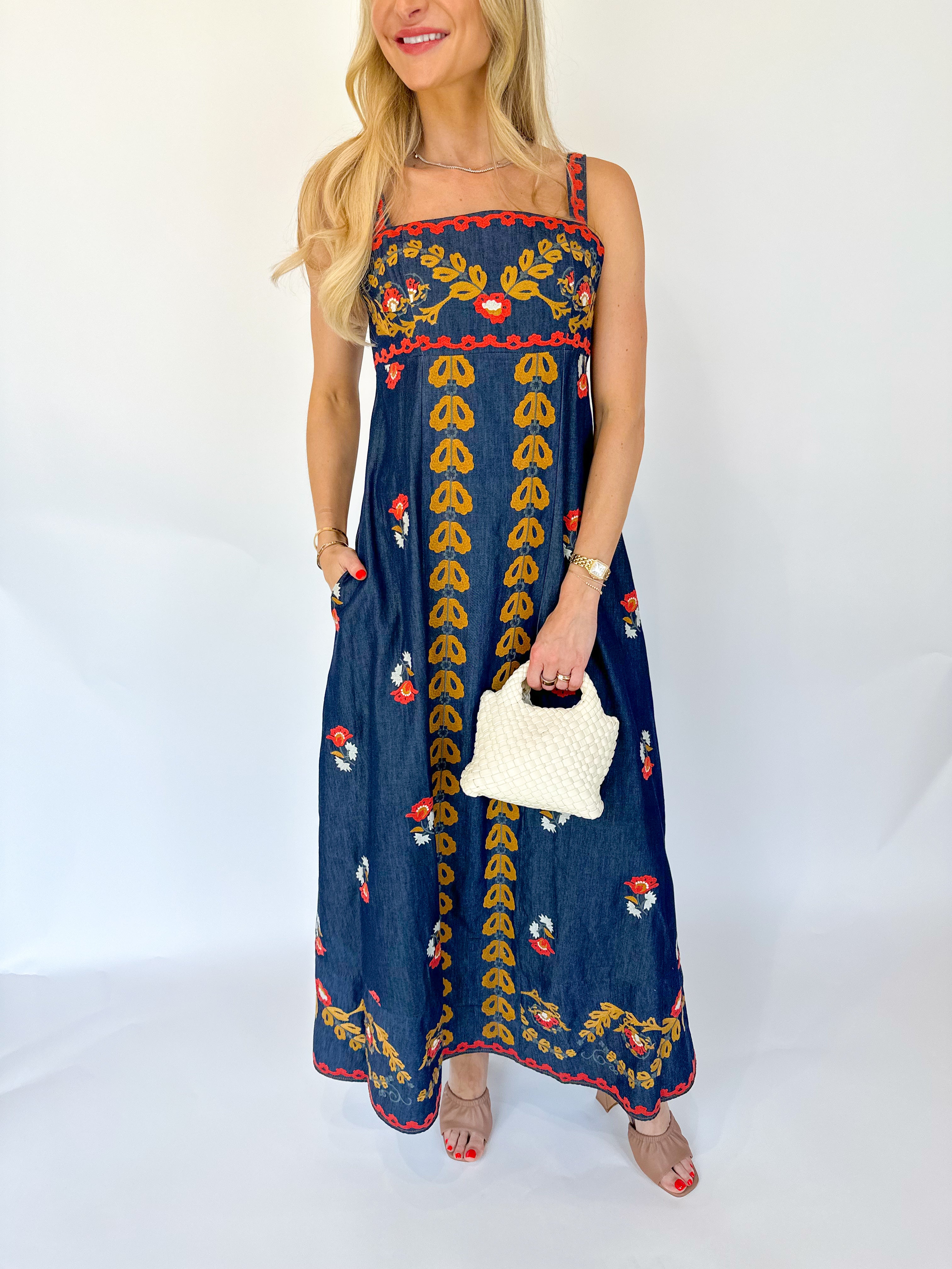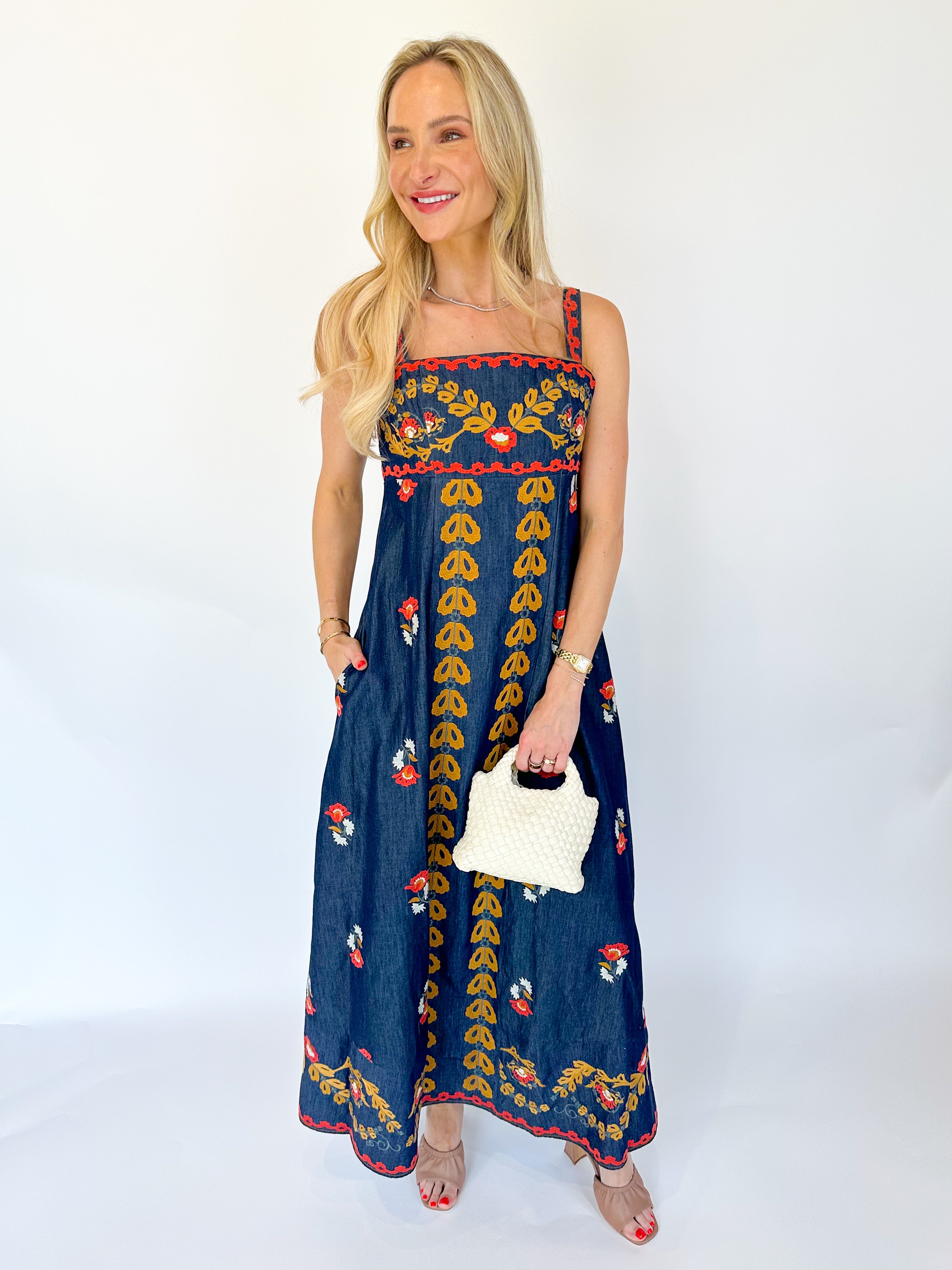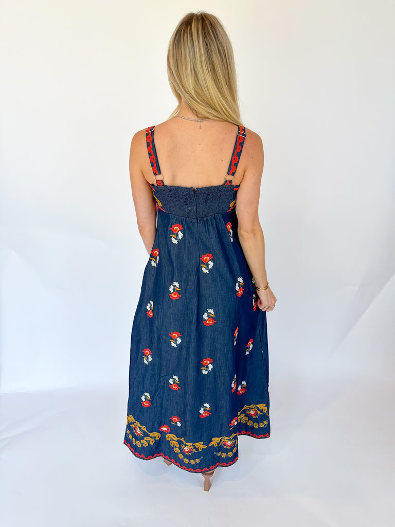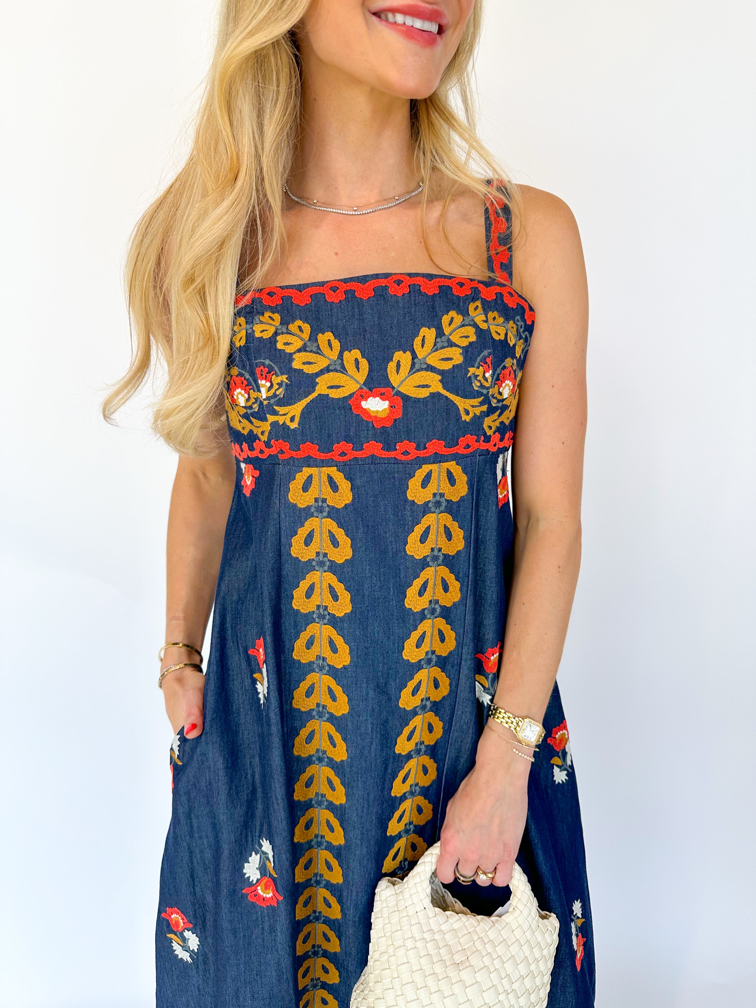 With this denim material and gorgeous embroidery detailing, the beloved Annalisa Dress is ready for the Fall season! She features a fitted empire bodice and A-line skirt, elevated with gorgeous handkerchief motif embroidery. Adjustable straps and a smocked back offer a comfortable fit for the perfect midi dress.