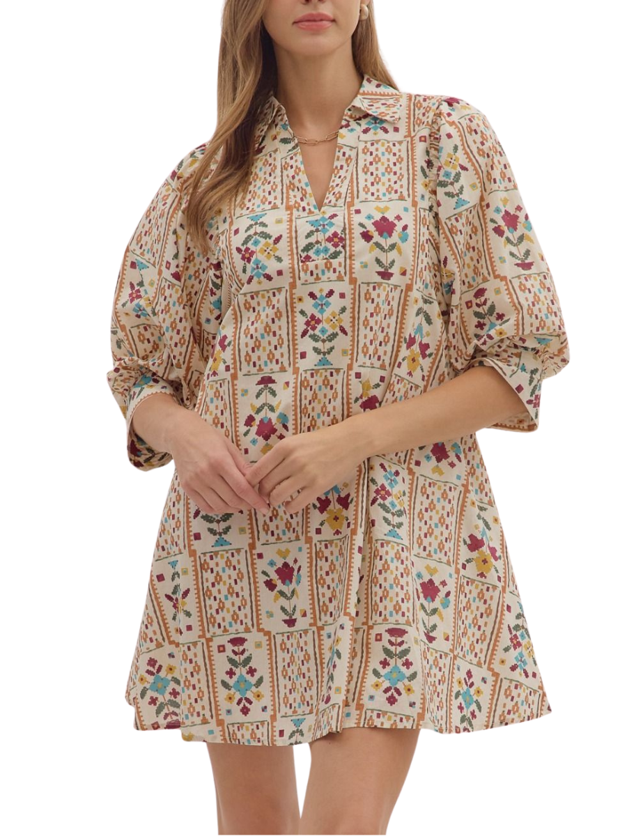 This mini dress combines a flattering puff 3/4 sleeve with a chic floral print and a stylish collared V-neckline. The self-tie detail at the back waist adds a personalized fit, creating an effortlessly feminine look perfect for any occasion.