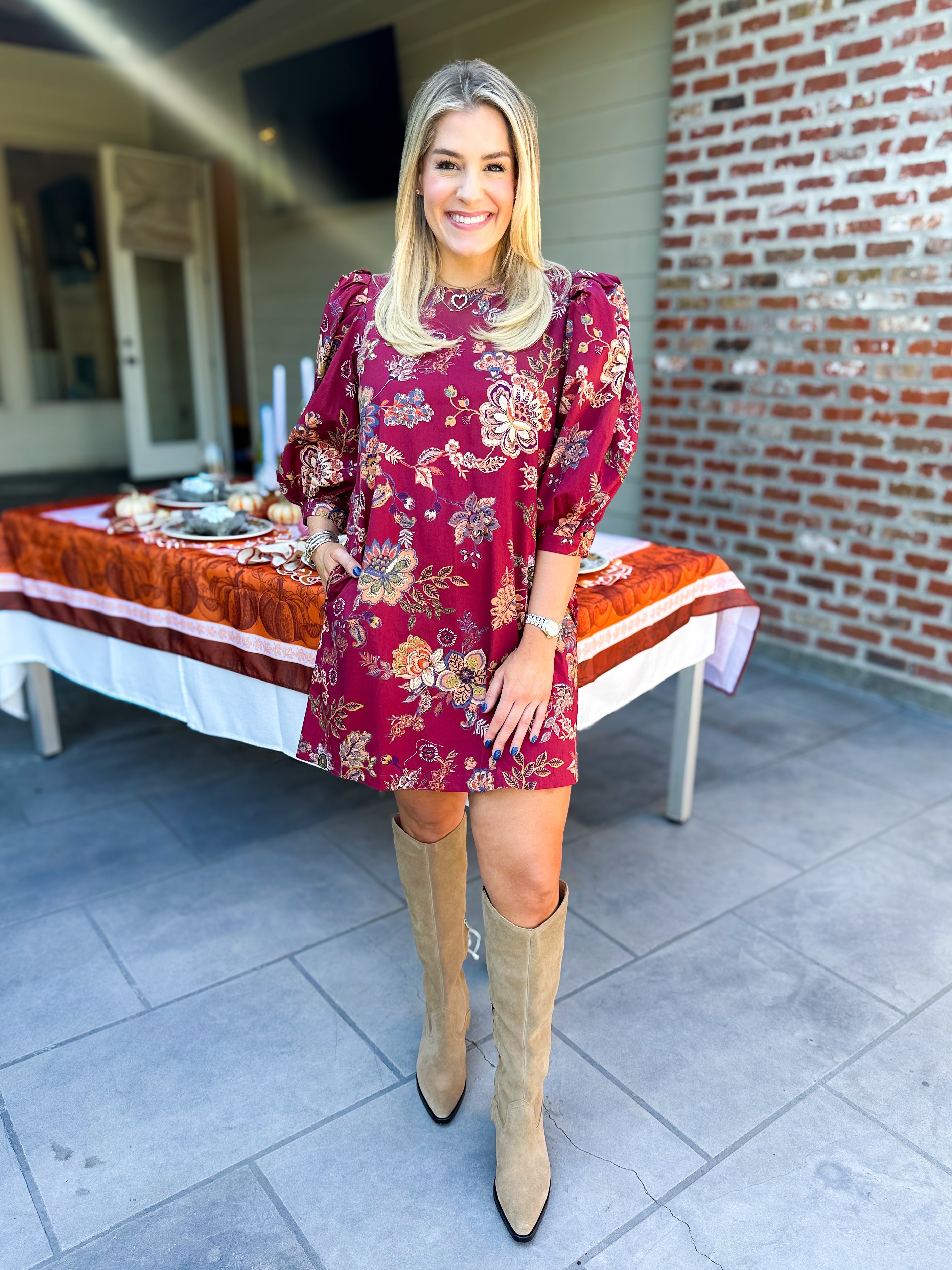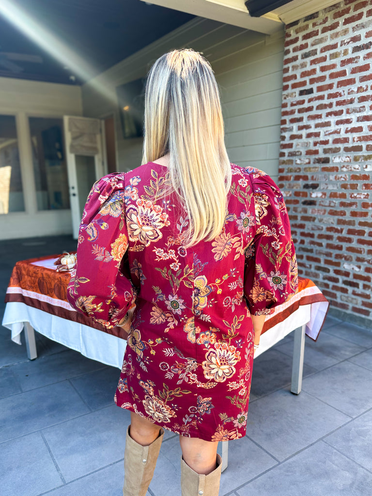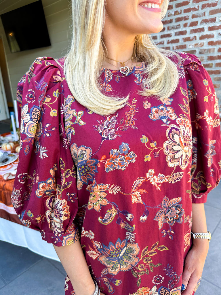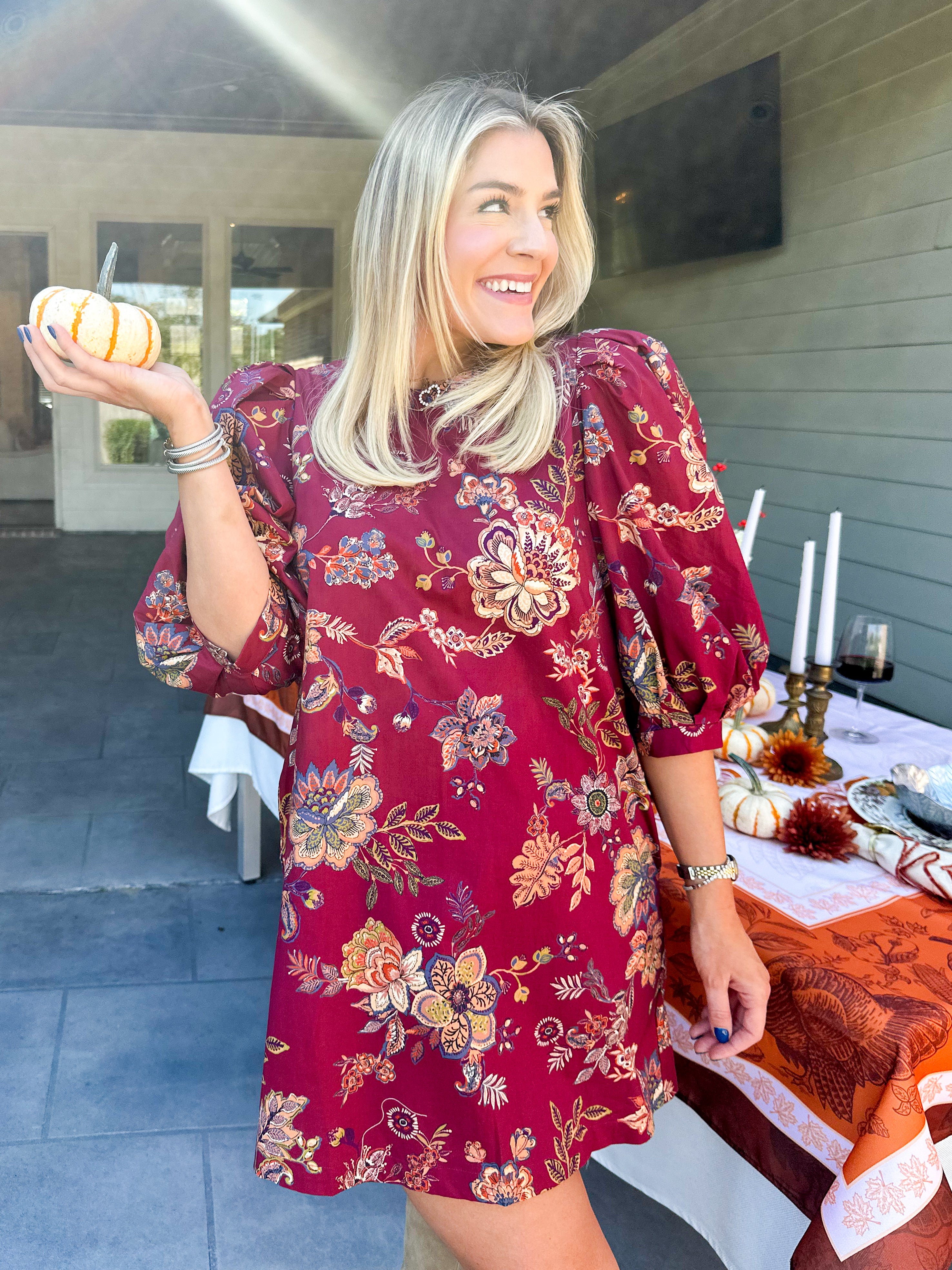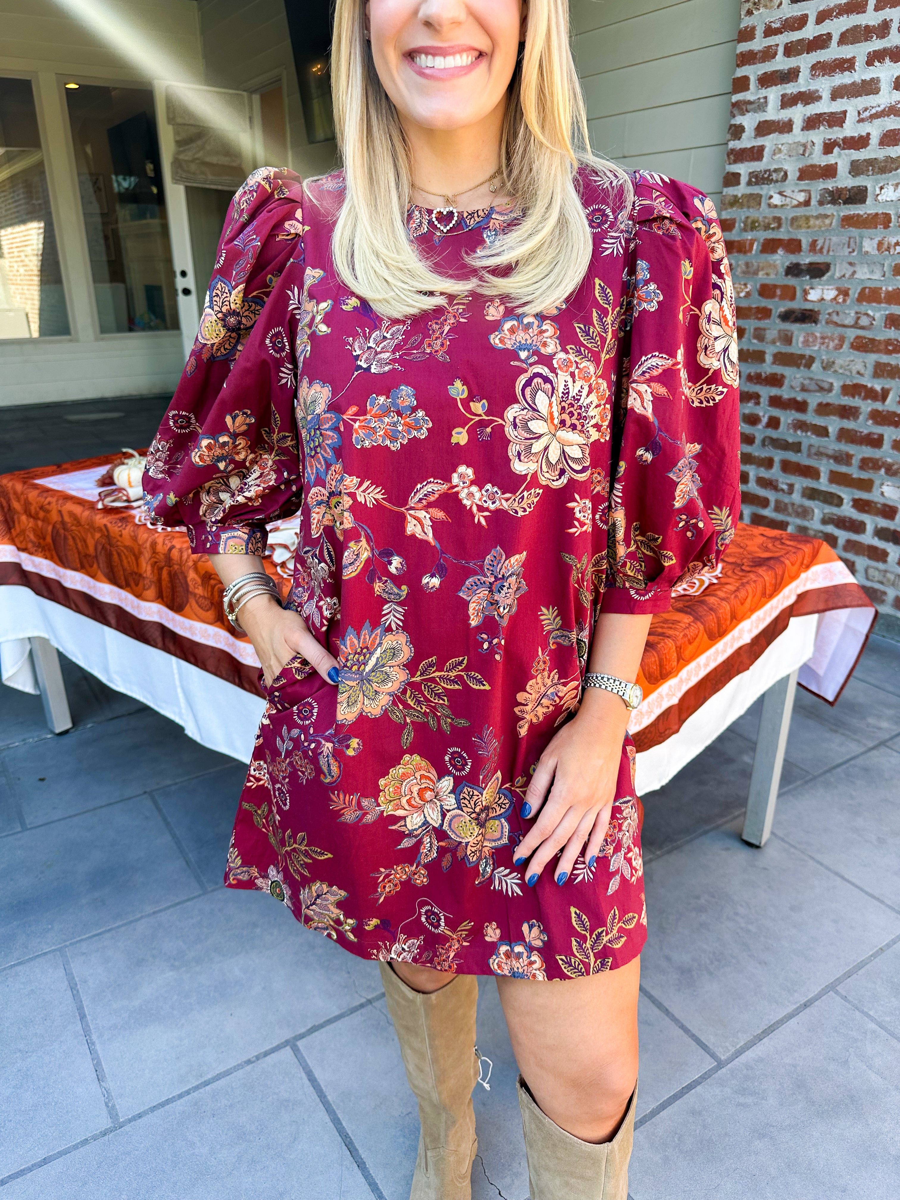 Effortlessly chic, this burgundy floral shift dress transitions seamlessly from season to season. The flattering 3/4 puff sleeves add a touch of elegance, while the mini length keeps things fresh and modern. Style it with heels for evening sophistication, boots for cozy autumn vibes, or flats for casual everyday wear. One dress, endless possibilities.