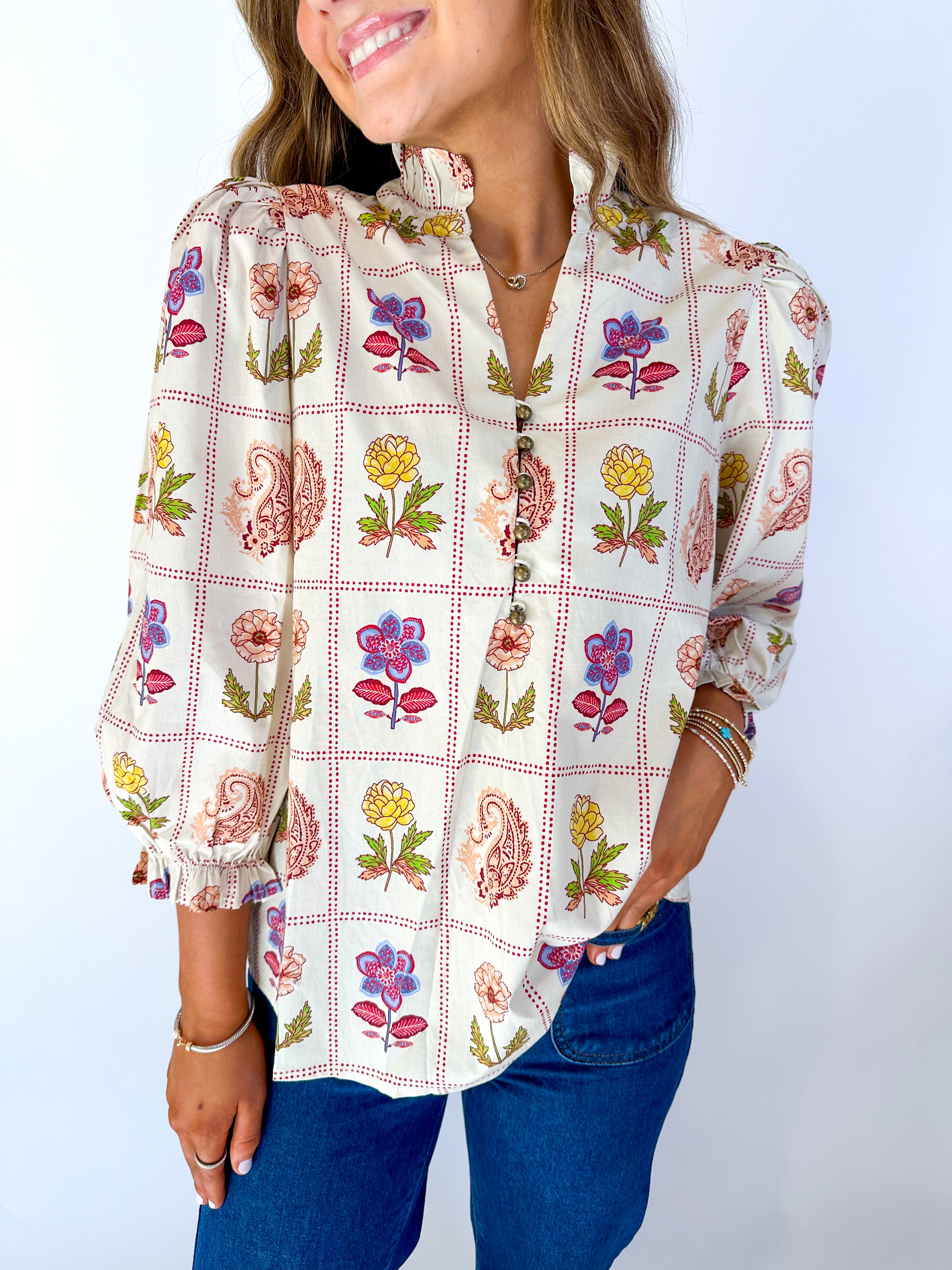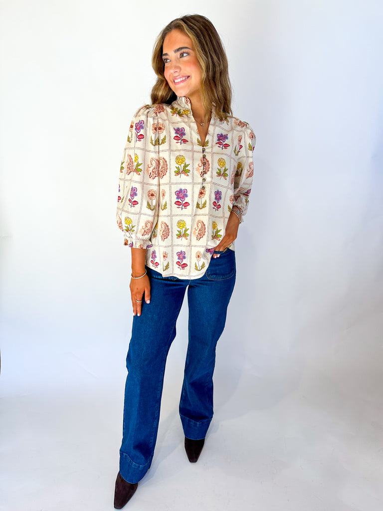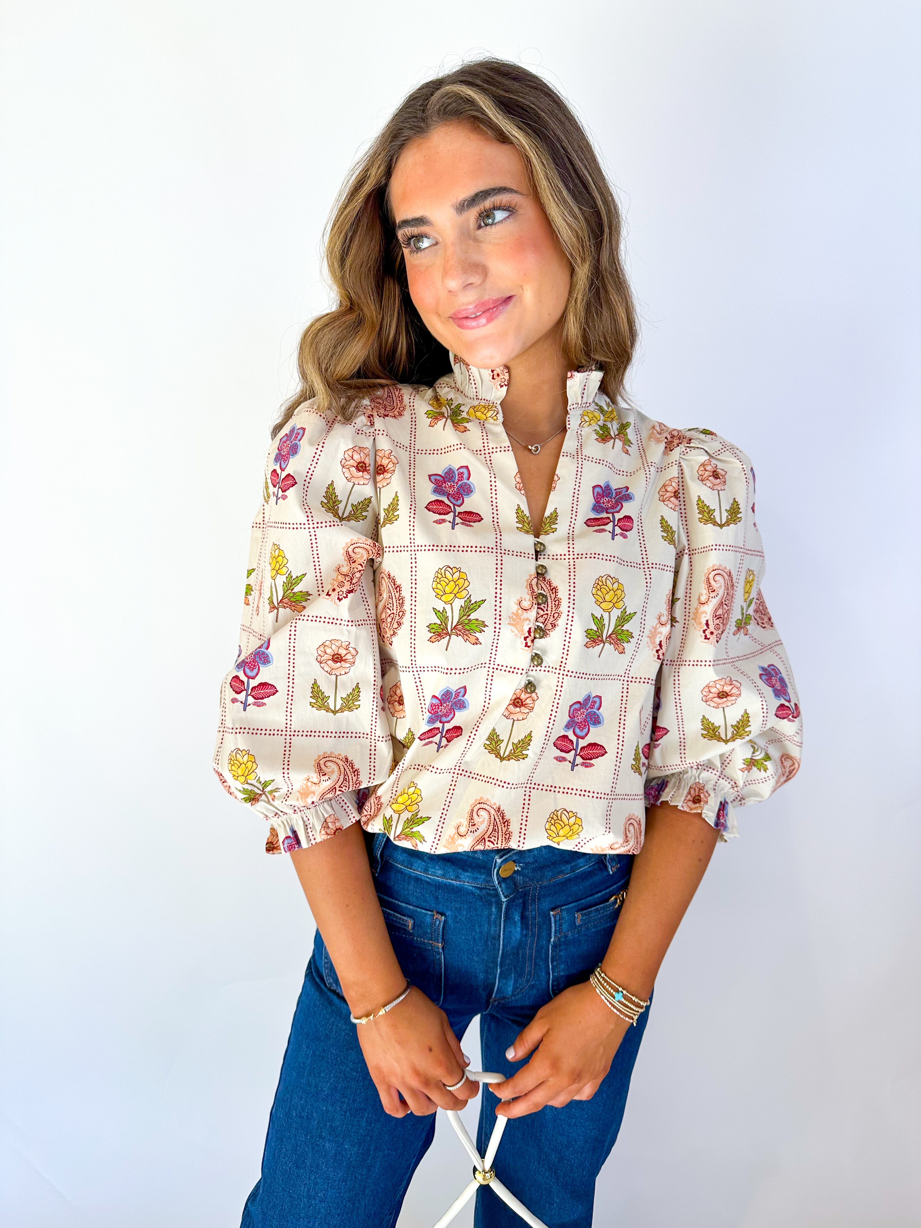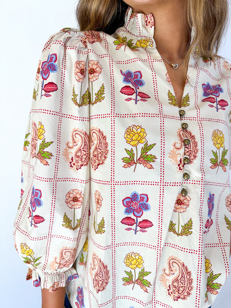 The Ameile Blouse features a charming floral and paisley print with stylish 3/4 puff sleeves. A ruffled high neck and delicate loop button closure add feminine detail, while elasticated sleeve openings with ruffle trim ensure a comfortable, flattering fit. Perfect for elevating any outfit with effortless elegance.