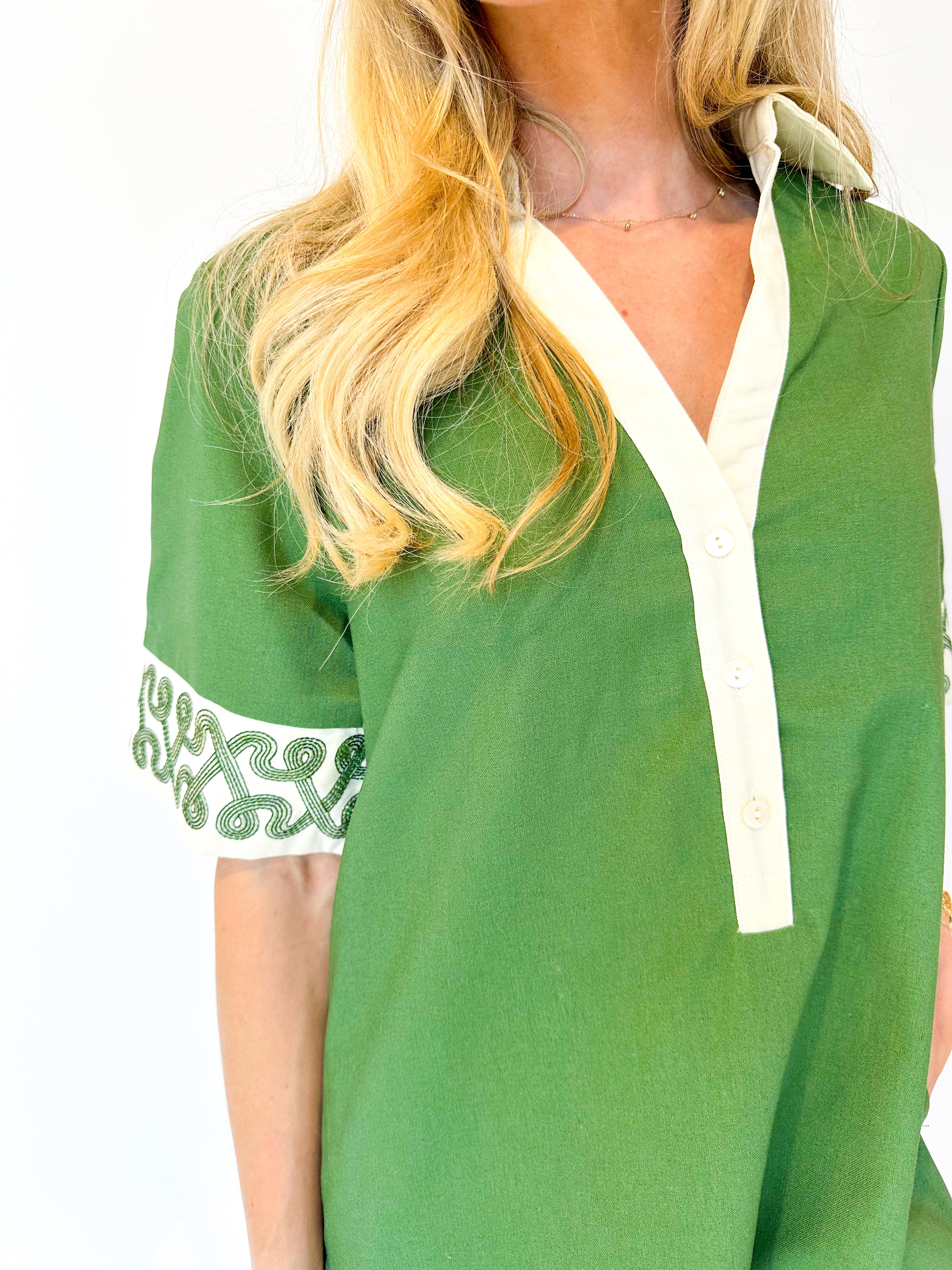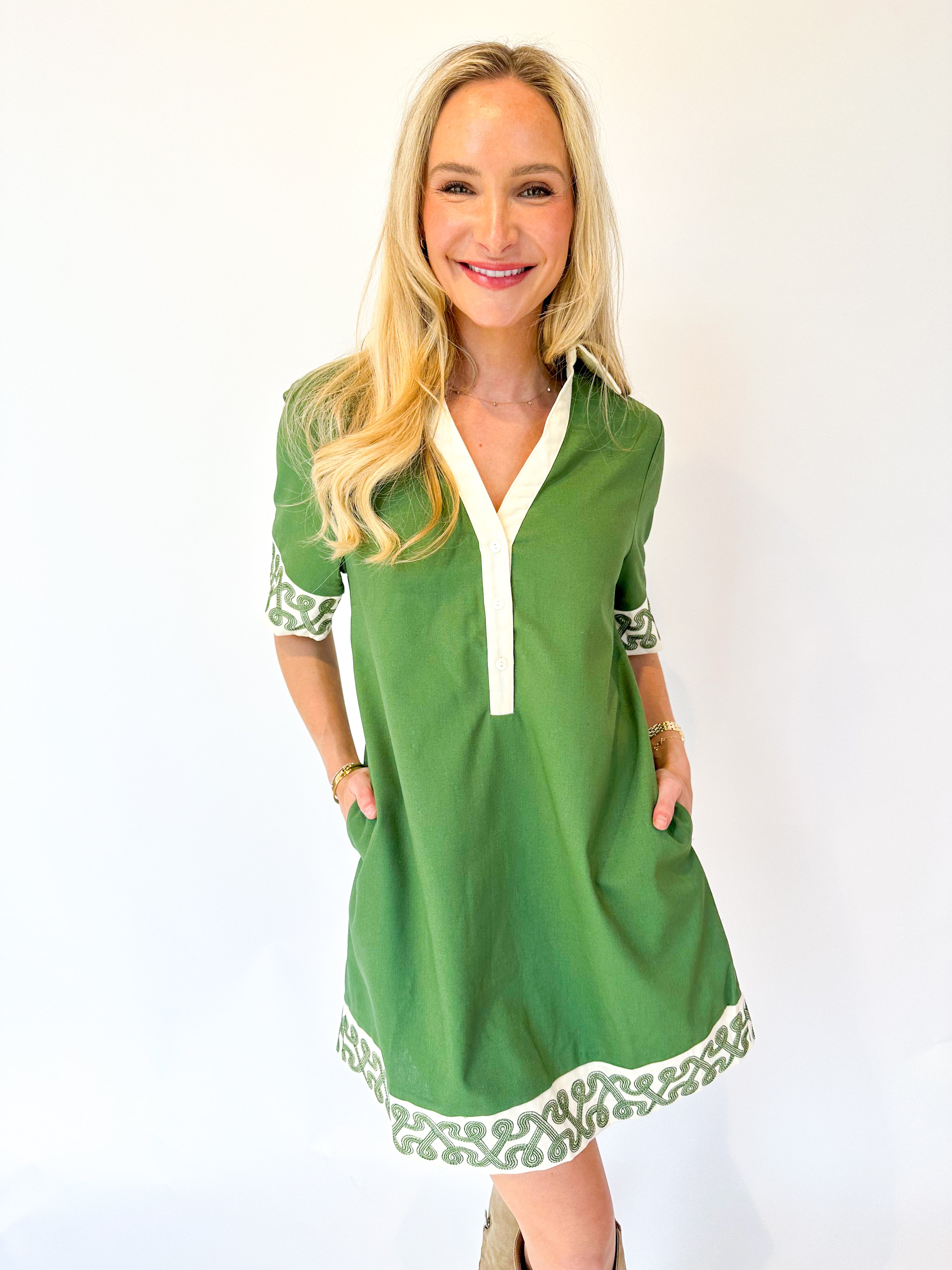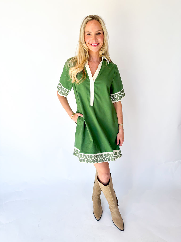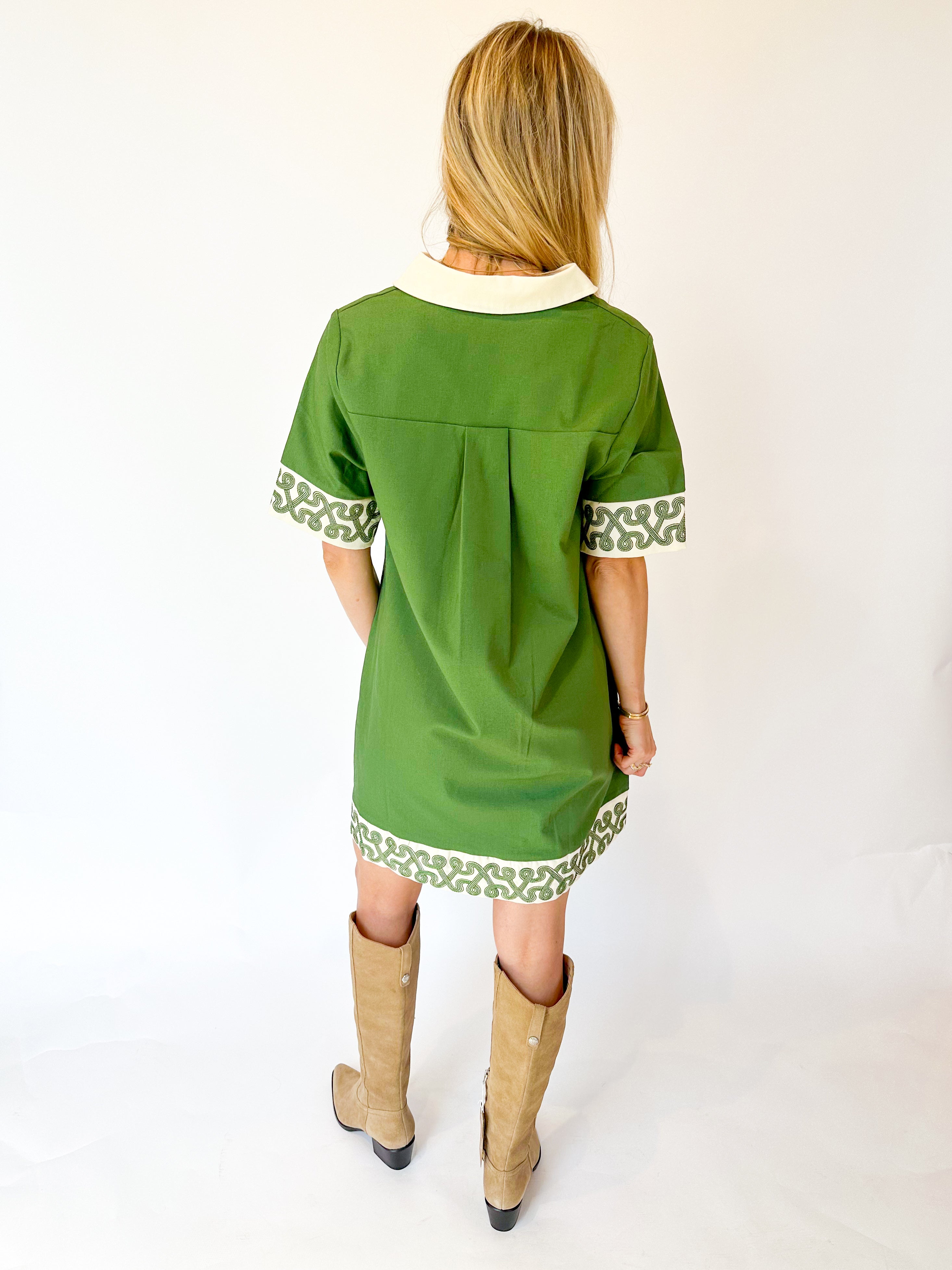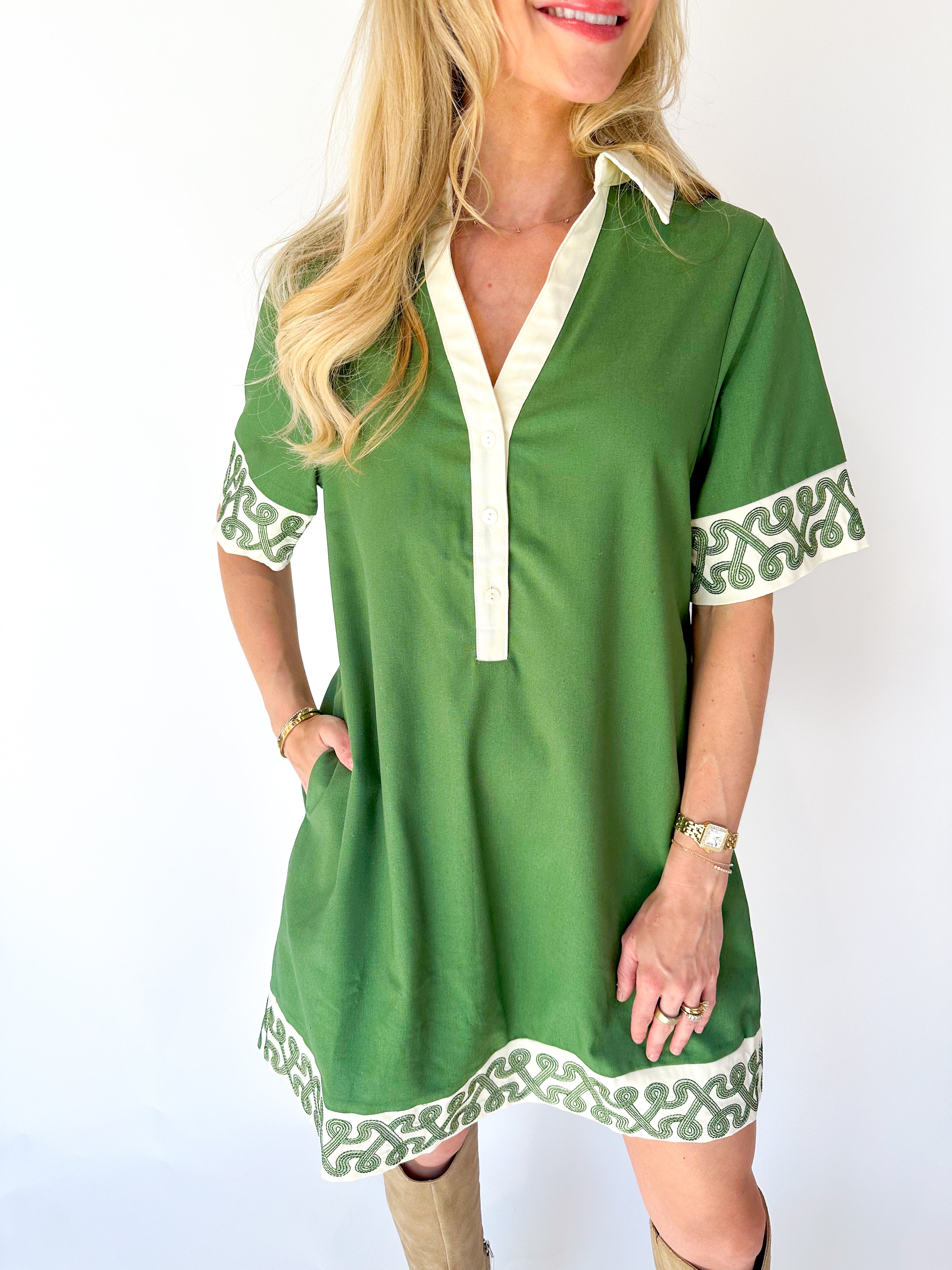 This solid short sleeve mini dress features a delicate embroidered accent band along the hem, adding subtle sophistication. Its spread collar and button closure offer a polished yet effortless look. Easily transition from day to night by pairing it with heels or embrace fall style with boots for versatile wear all season long.