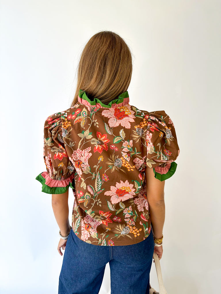 This short sleeve button-down top features charming ruffle details on the sleeves and collar, adding a feminine touch to your look. Set against a warm brown backdrop, its pink and green floral pattern brings vibrant elegance to any outfit. Perfect for effortless style that stands out.