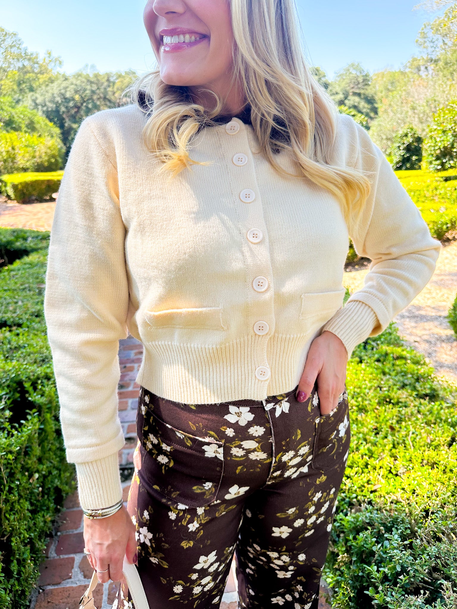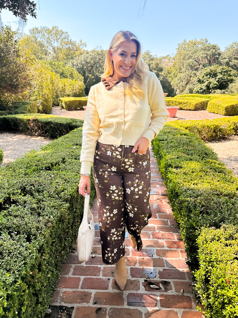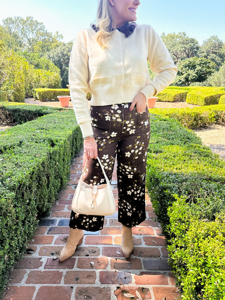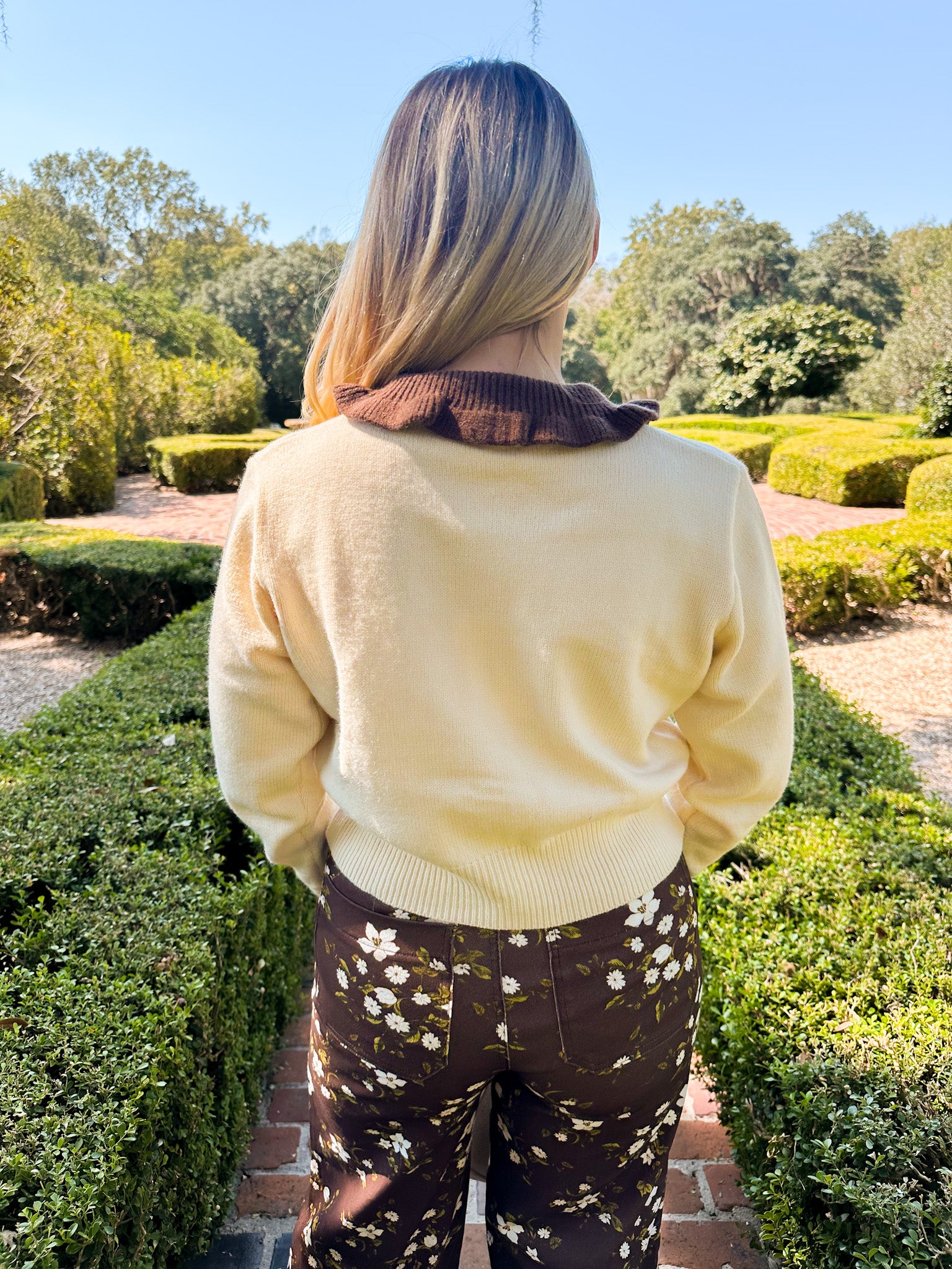 Elevate your wardrobe with this ivory sweater featuring a charming brown ruffled Peter Pan collar. Its delicate contrast adds a feminine touch, perfect for pairing with floral pants or a denim skirt and knee-high boots. This versatile collared sweater is the stylish staple you didn’t know your closet needed.