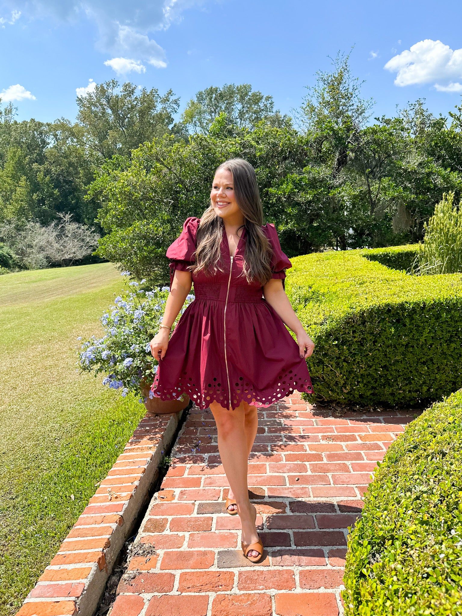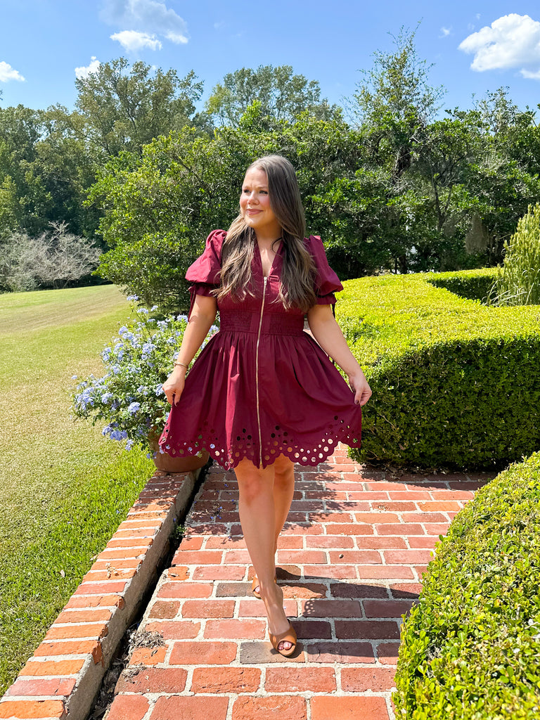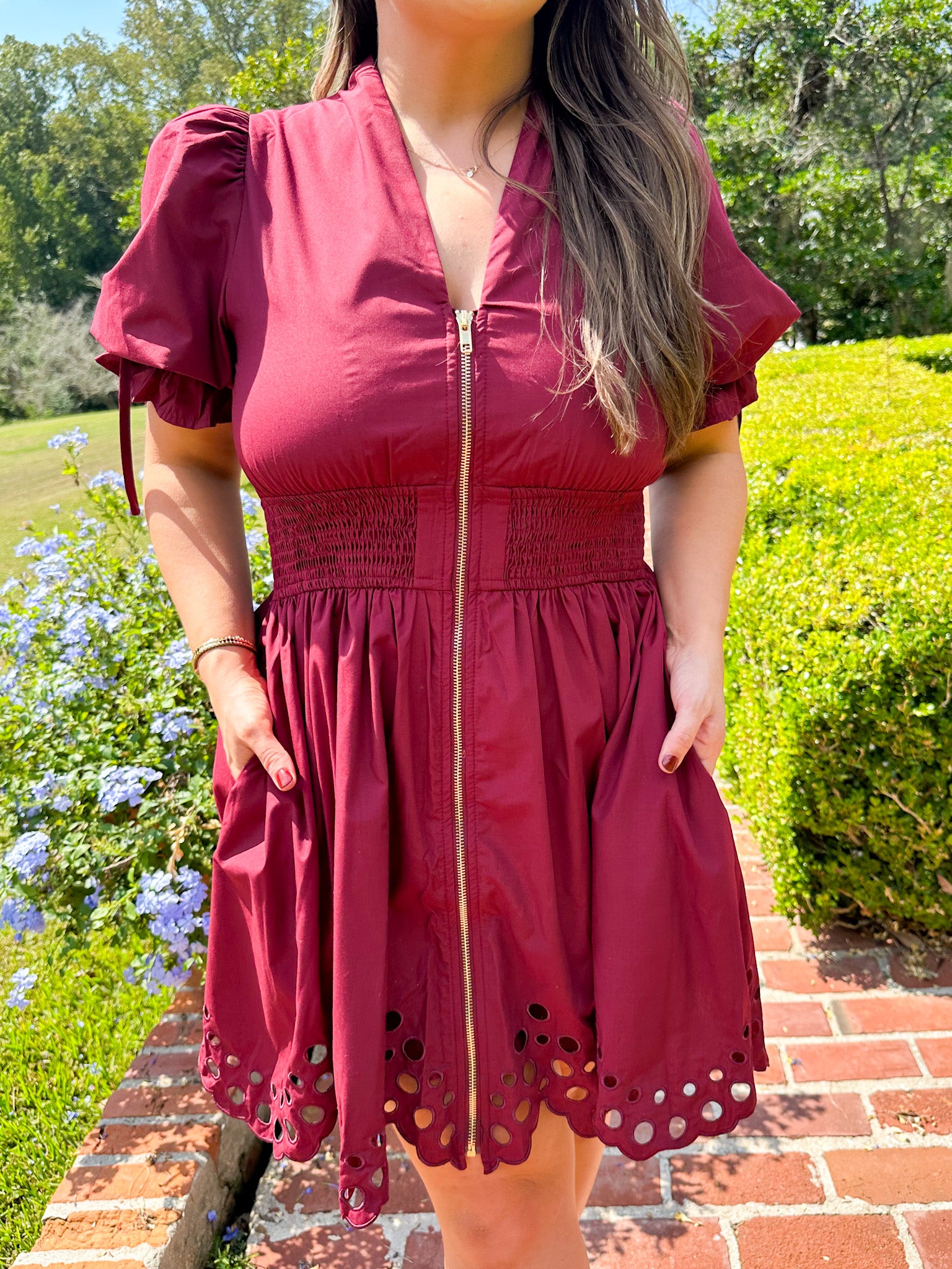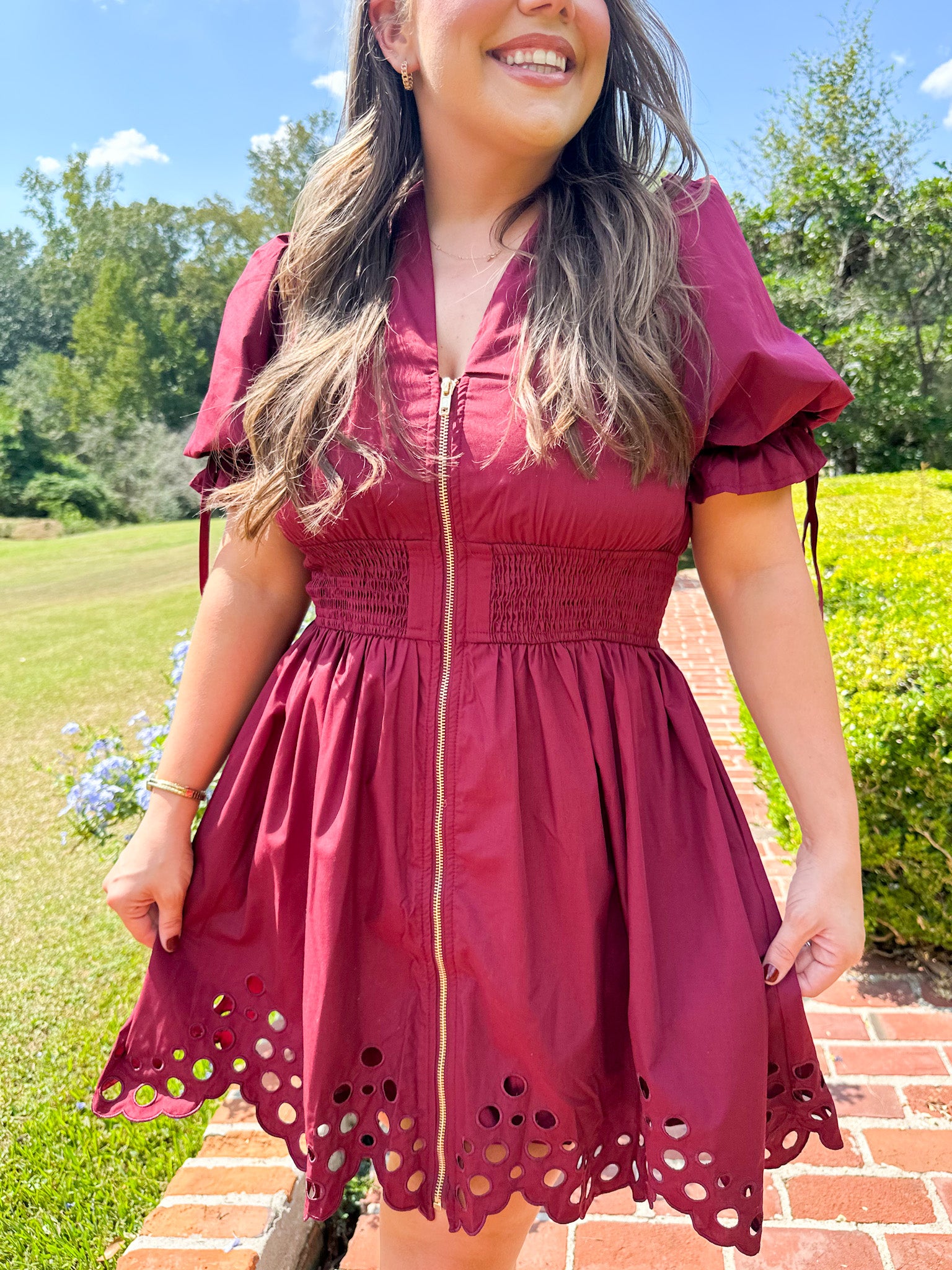This burgundy mini dress features a bold front zipper for easy wear and a touch of modern edge. The short puff sleeves add a playful, feminine flair, while delicate eyelet detailing at the hem offers subtle charm. Perfect for making a statement, this dress effortlessly blends style and comfort for any occasion.