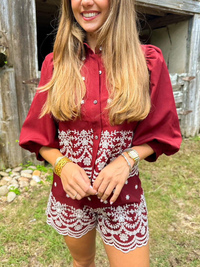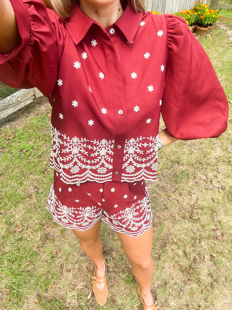 Elevate your wardrobe with this Eyelet Button Top, featuring delicate embroidery and chic balloon sleeves. The scalloped hem adds a feminine touch, making it perfect for both casual and dressier occasions. Pair it effortlessly with matching shorts for a coordinated look or style with dark wash denim and heels for an unforgettable date night outfit.