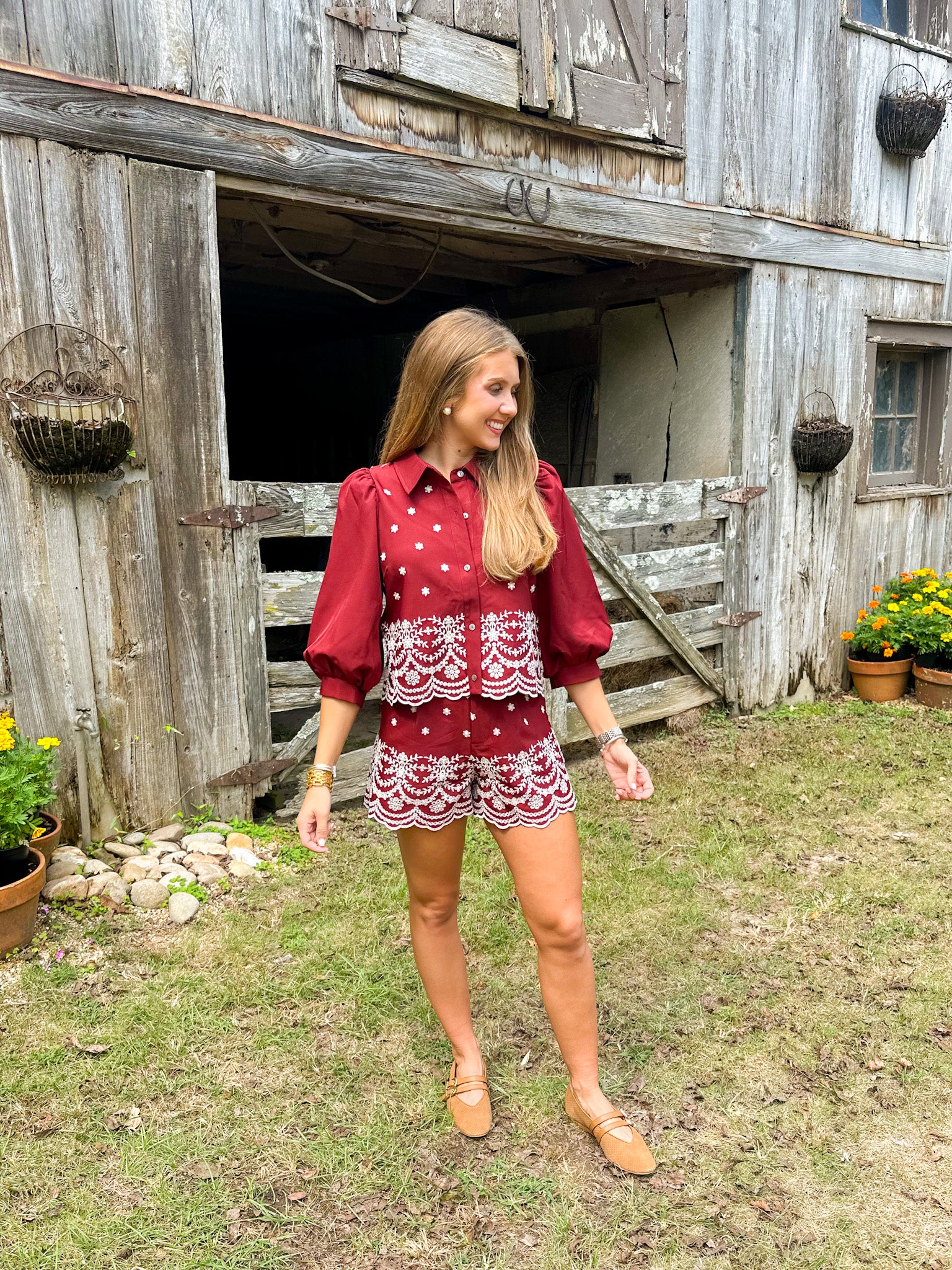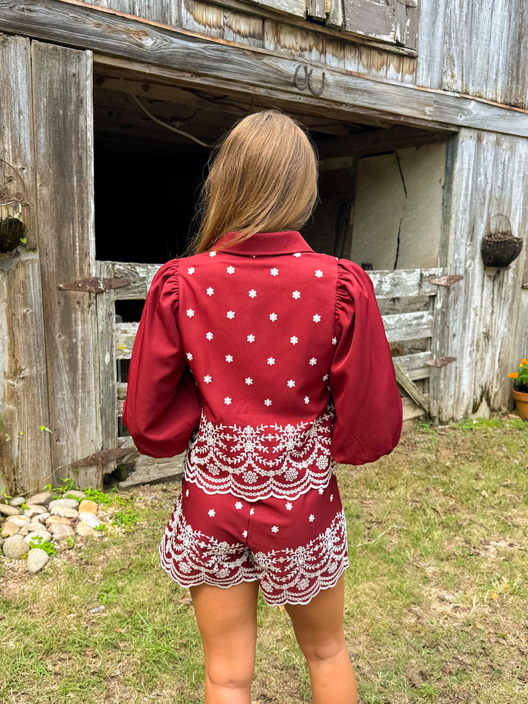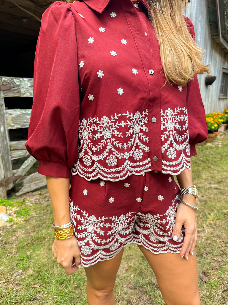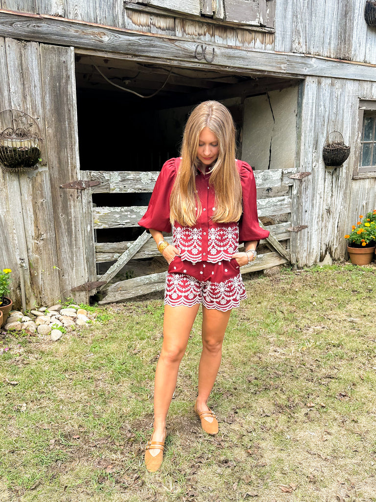 These embroidered woven shorts with a delicate scallop hem bring a fresh, feminine touch to your Fall wardrobe. Perfect for effortless, chic Fall looks. Pair it with the matching top or wear it with a knit and knee high boots!