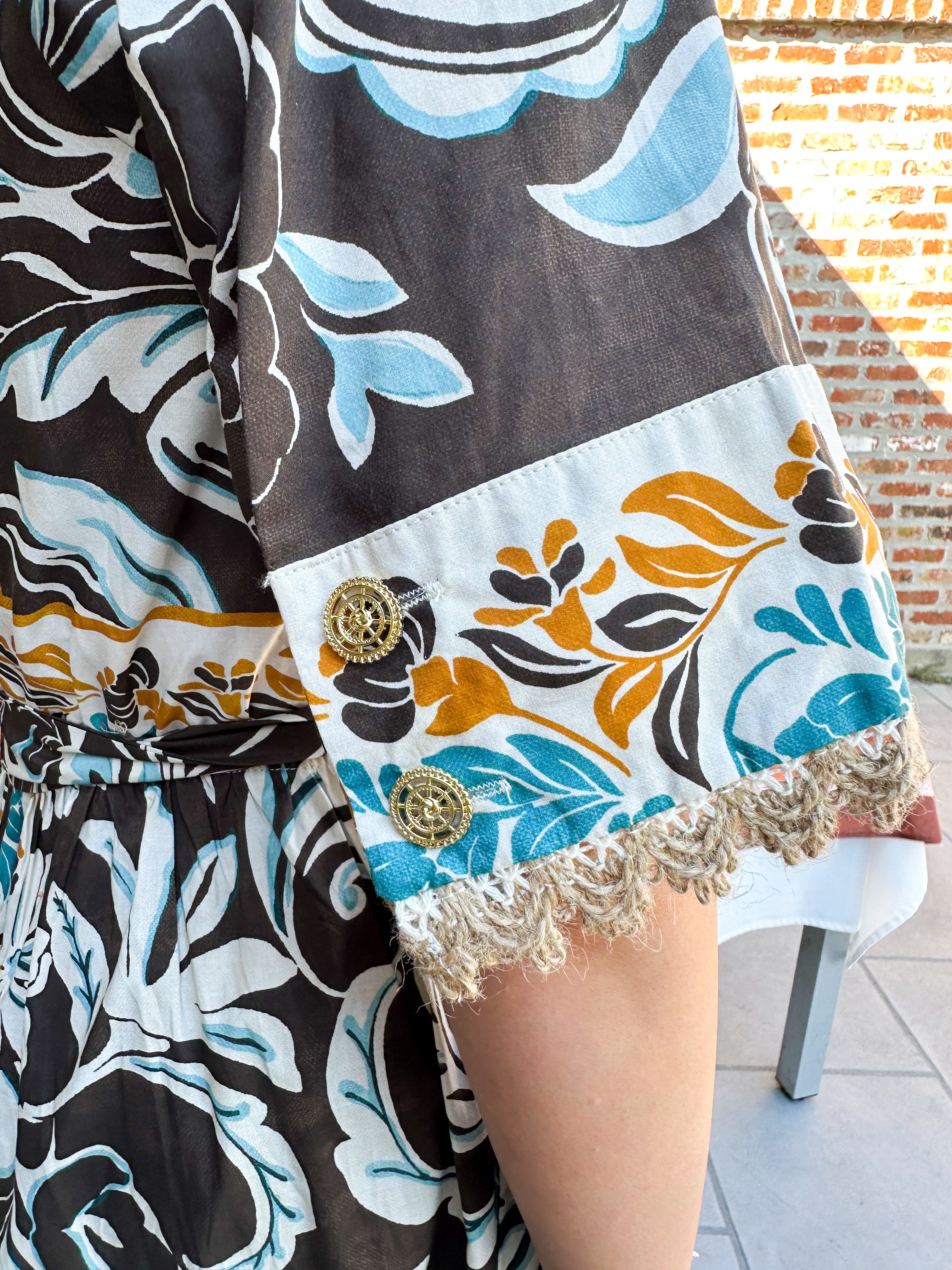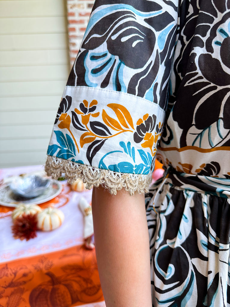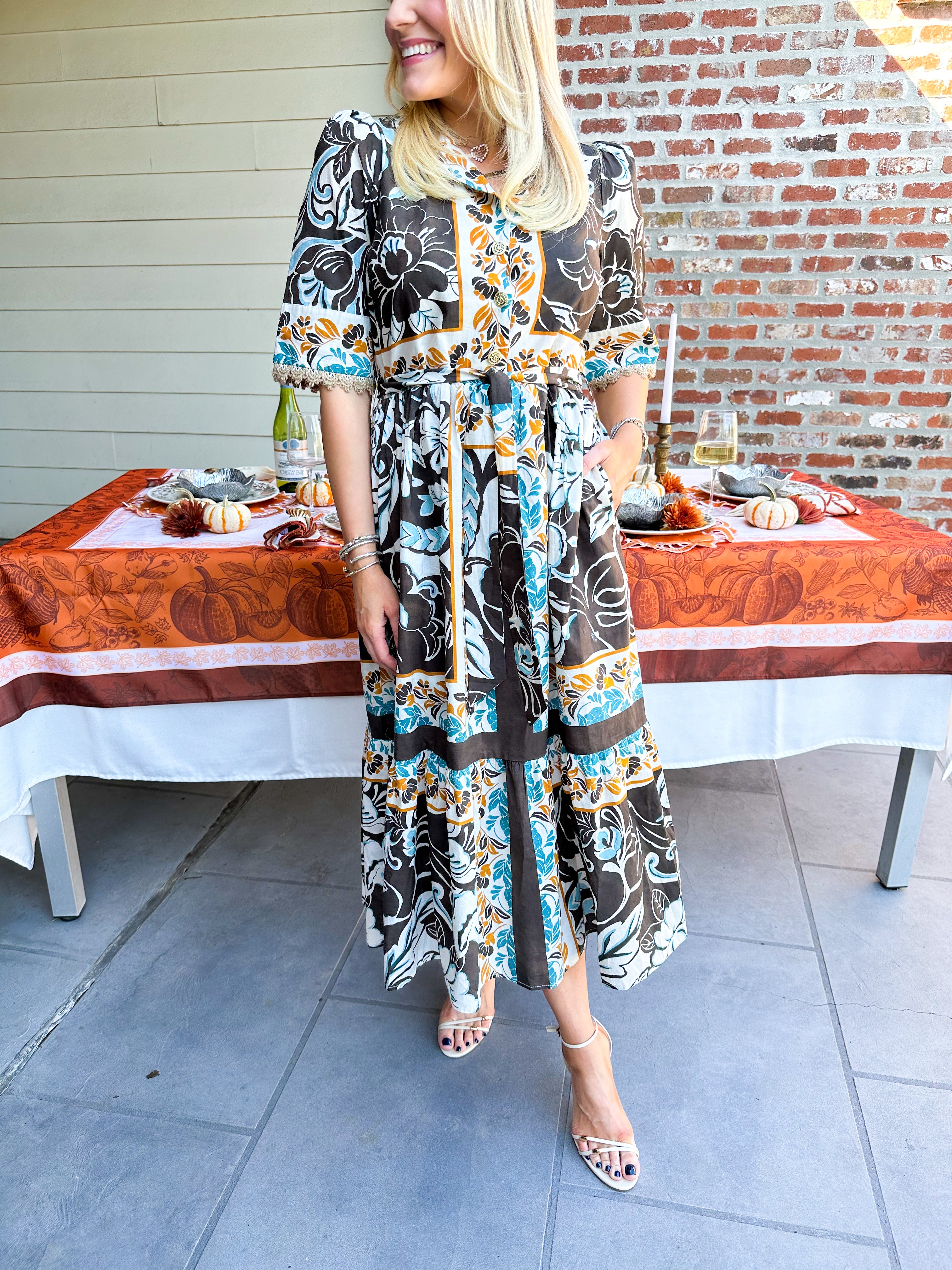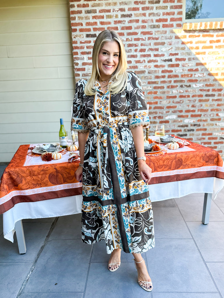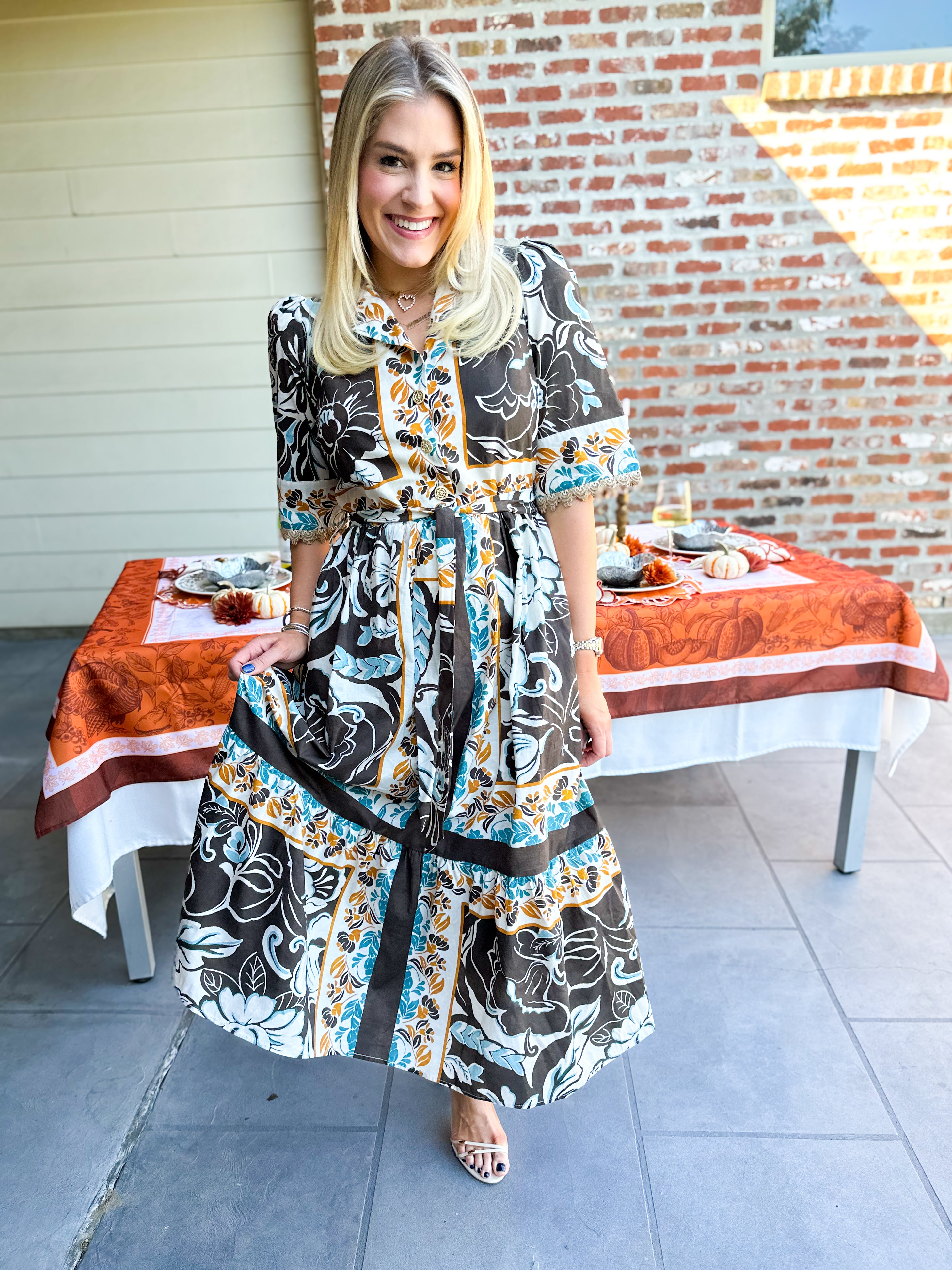 The Laynee Midi Dress combines timeless elegance with modern charm. This stunning piece features a rich brown mustard base adorned with delicate blue florals, creating a color palette that transitions through seasons. The adjustable self-tie waist flatters your silhouette while three gold buttons add a polished finishing touch. Intricate lace detailing on the sleeves brings an air of refinement and femininity. Perfect for elevating your everyday style or making an impression at special occasions.