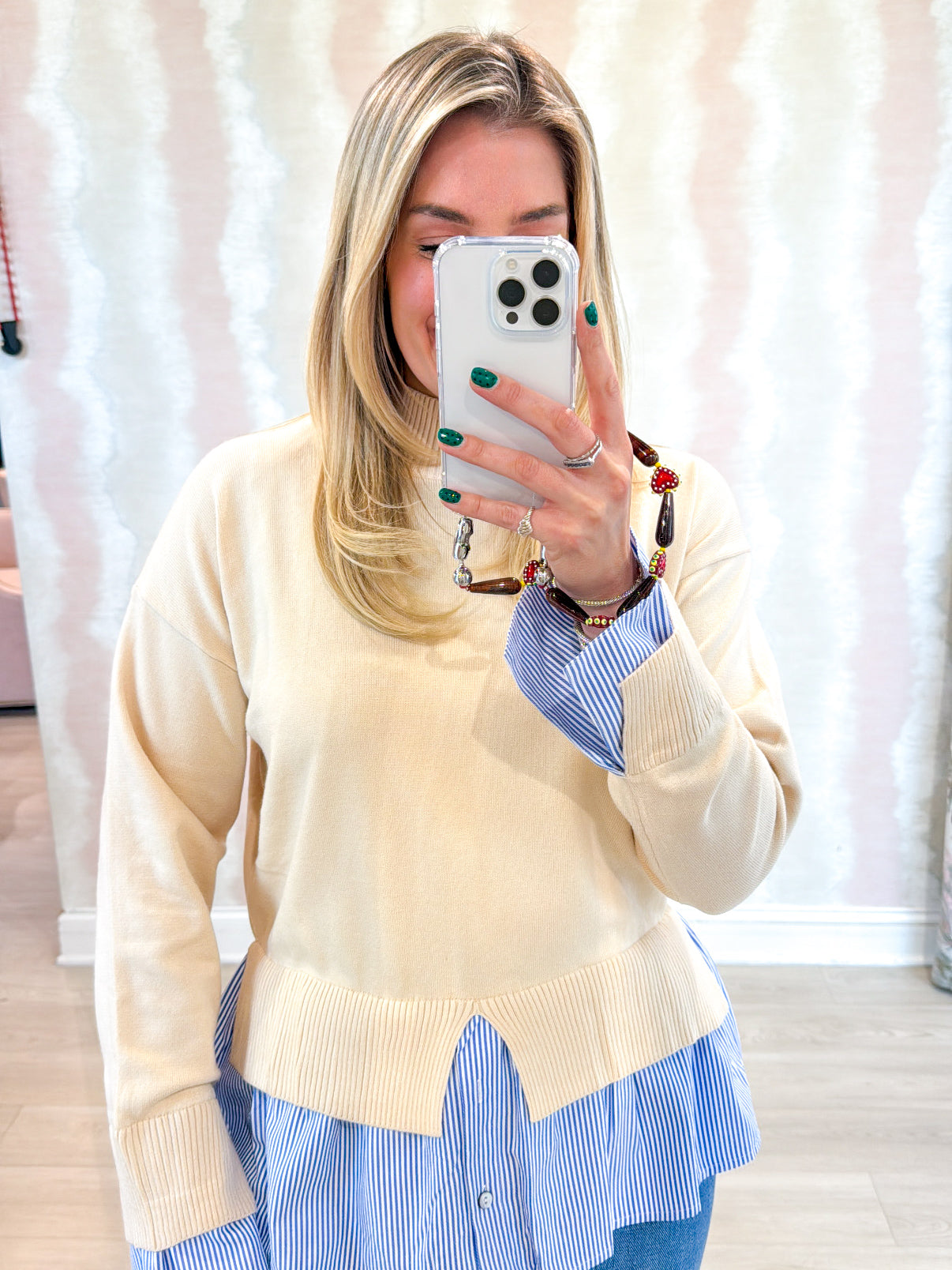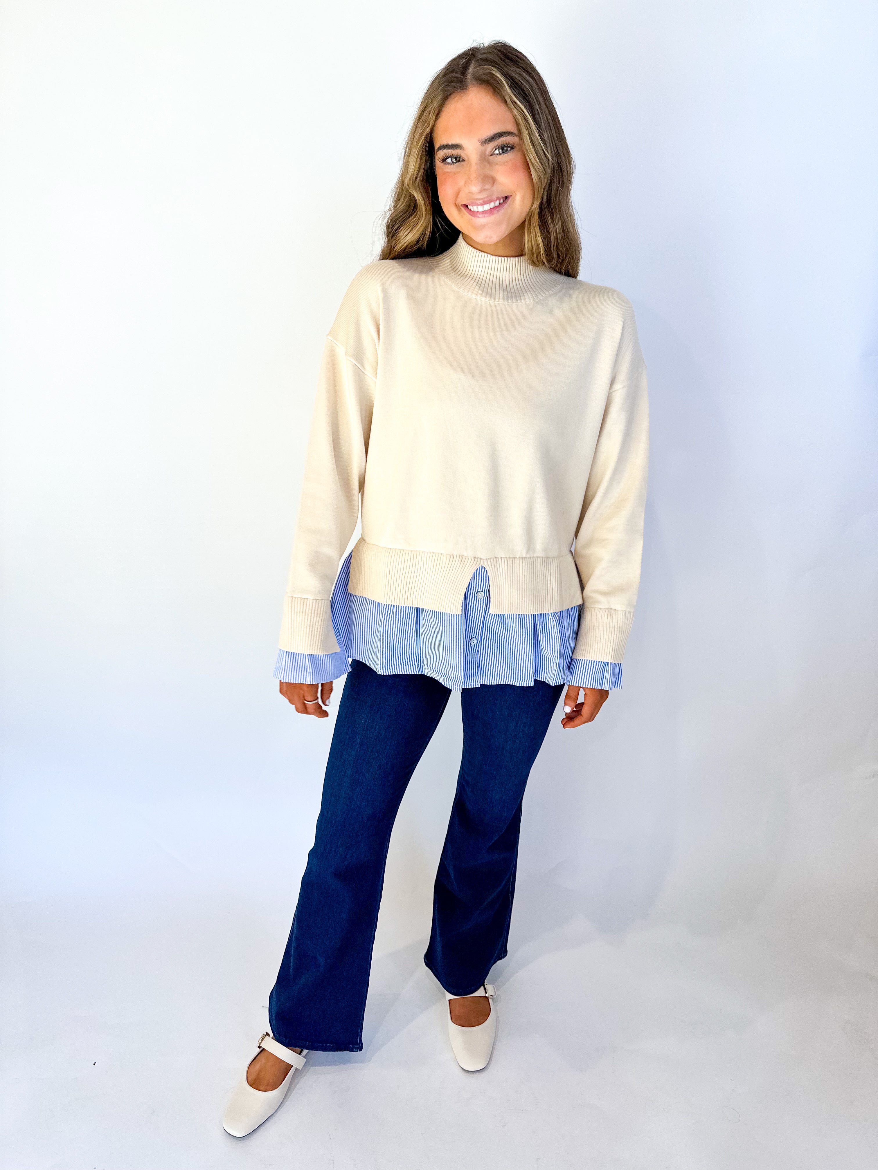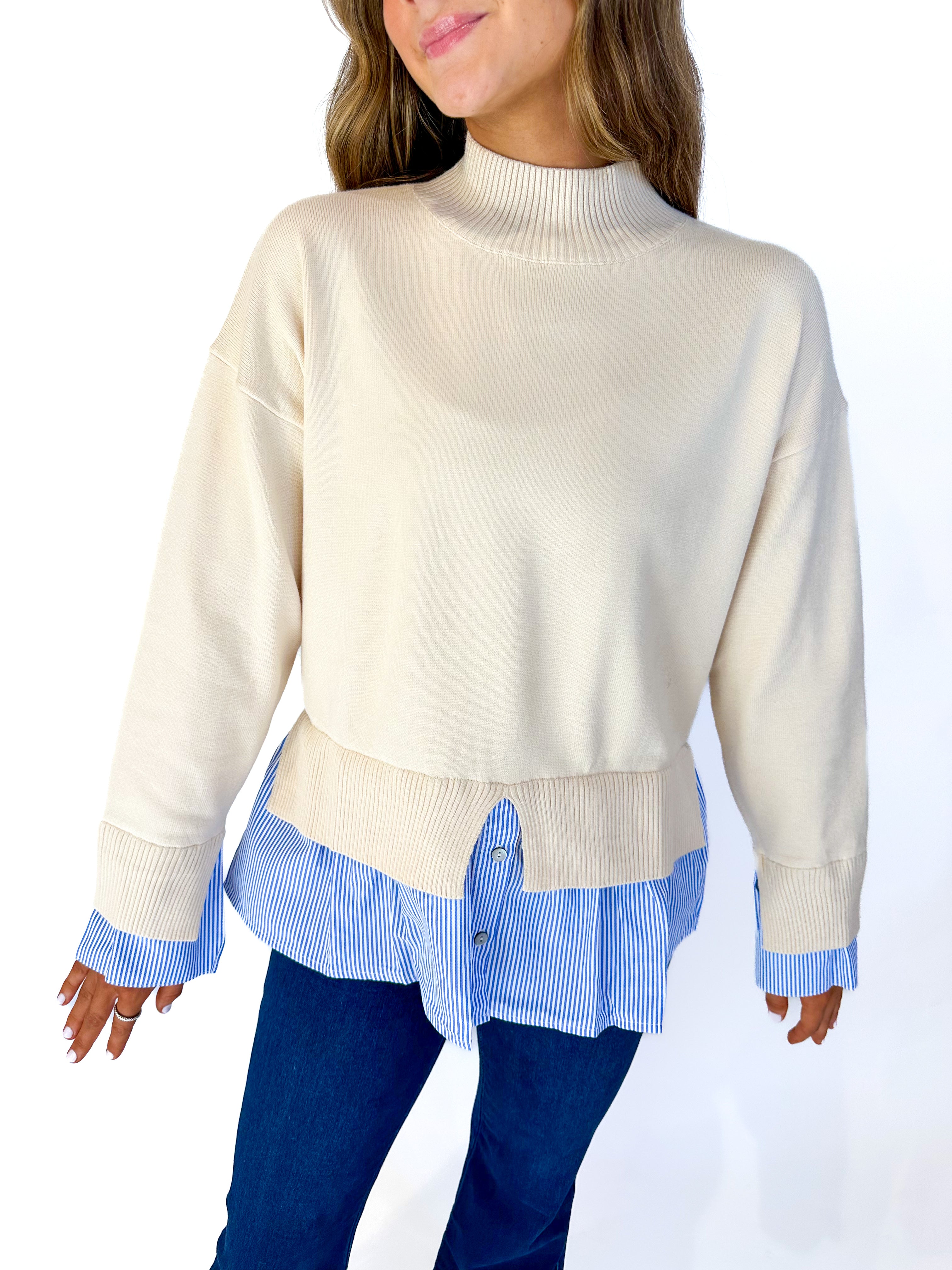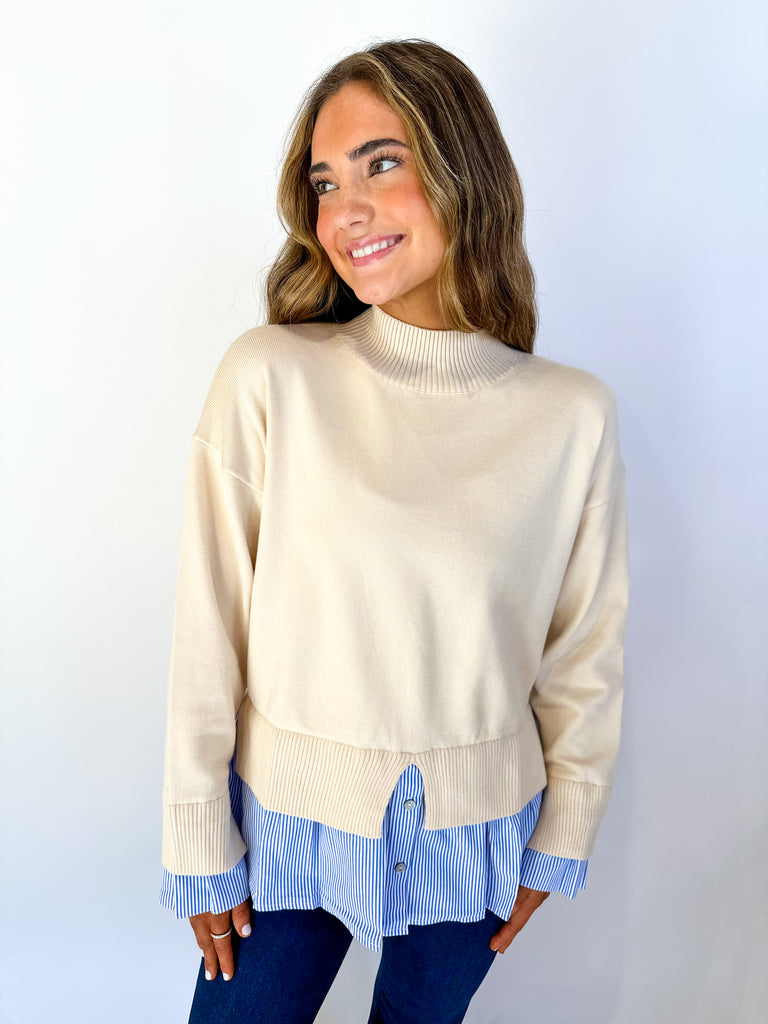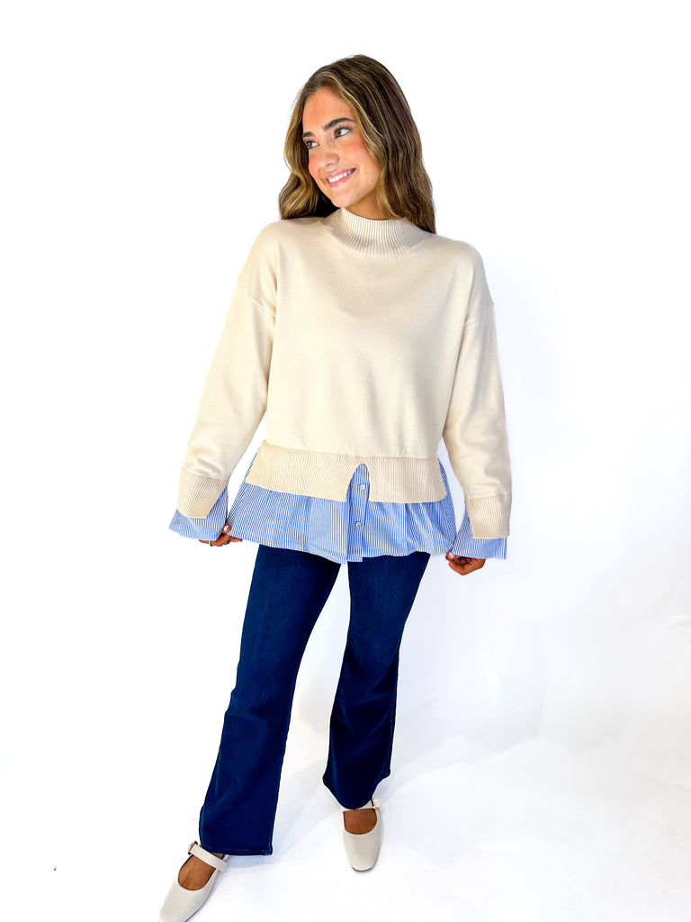 The Natalie Layered Sweater Top offers a chic cream sweater with a blue and white striped layer peeking out at the hem. Lightweight and comfortable, it creates a stylish layered look without adding bulk—perfect for effortless, everyday wear.