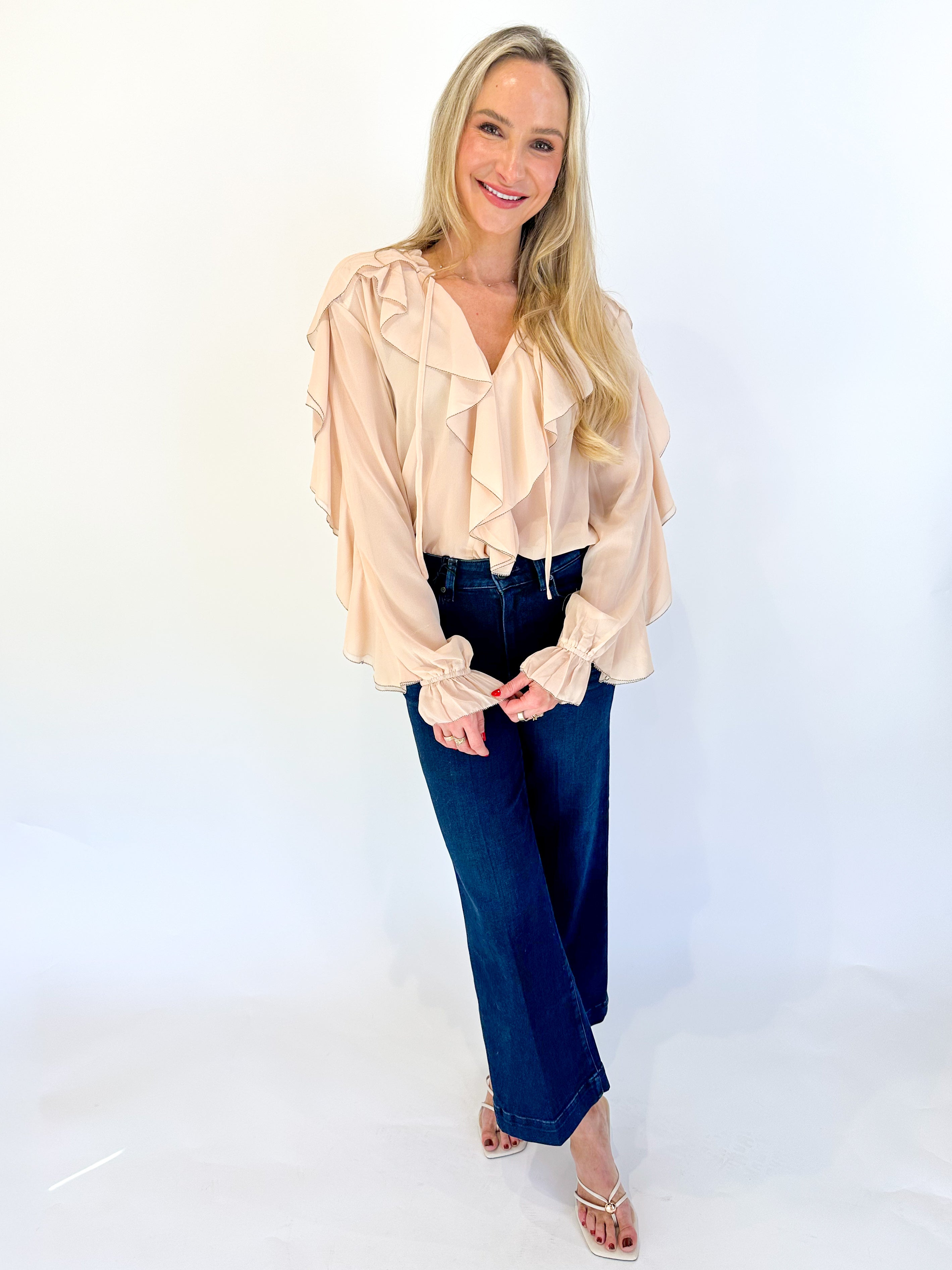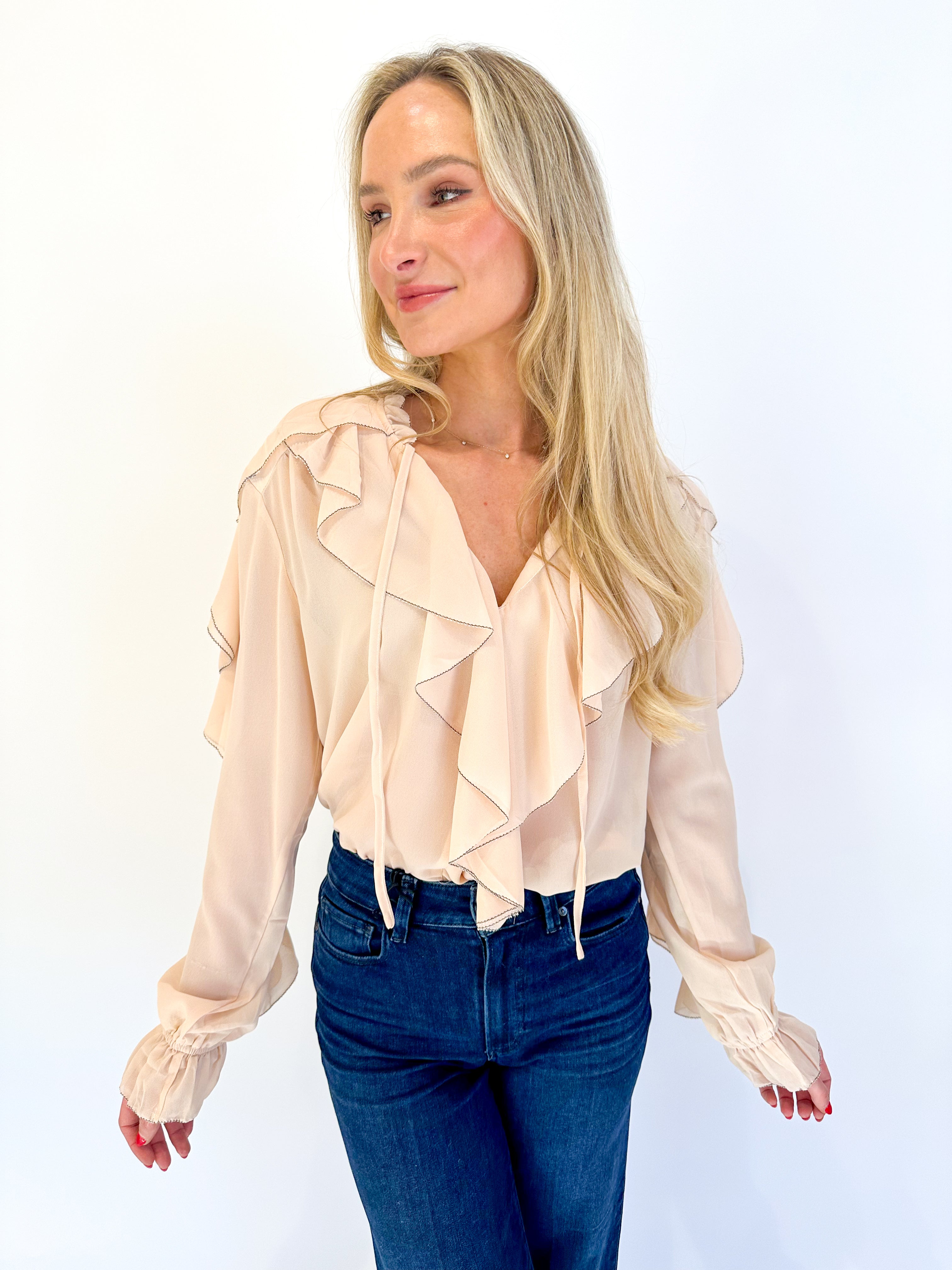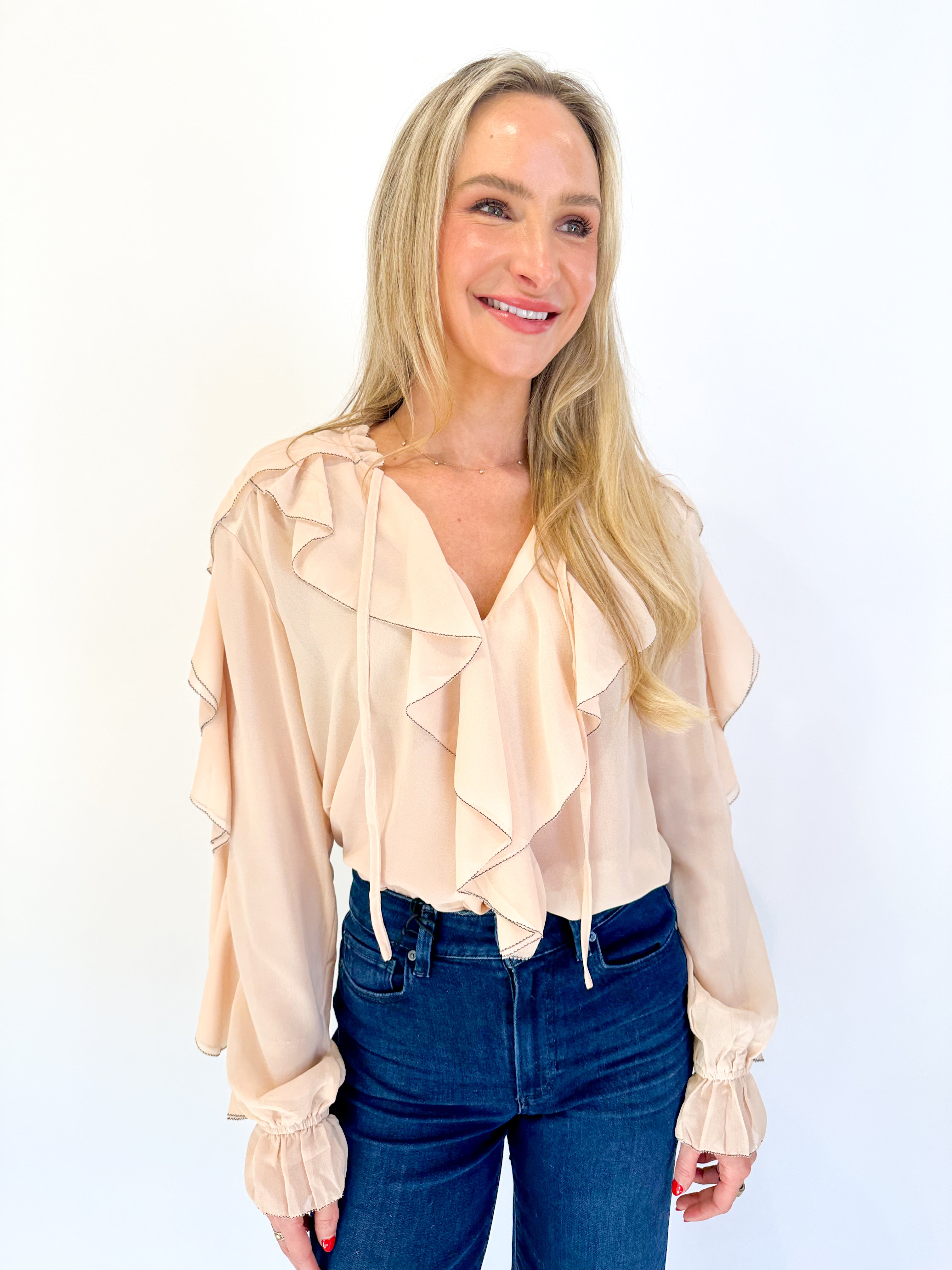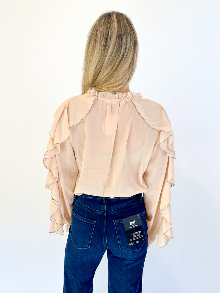 Twirl into elegance with this charming chiffon top featuring cascading ruffles down the long sleeves. The lightweight, flowy fabric moves beautifully with you, while the delicate ruffle details add a touch of romantic flair. Perfect for dressing up casual outfits or layering over basics. A versatile piece that brings instant sophistication and whimsy to your wardrobe.