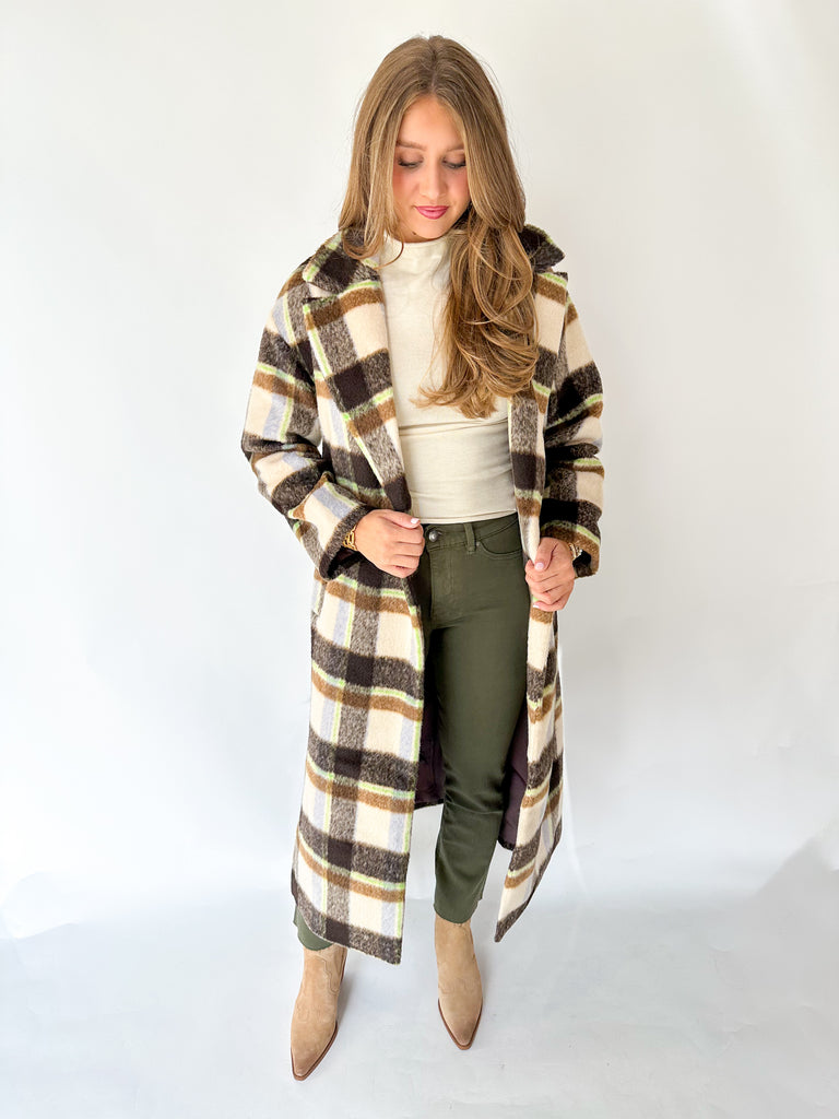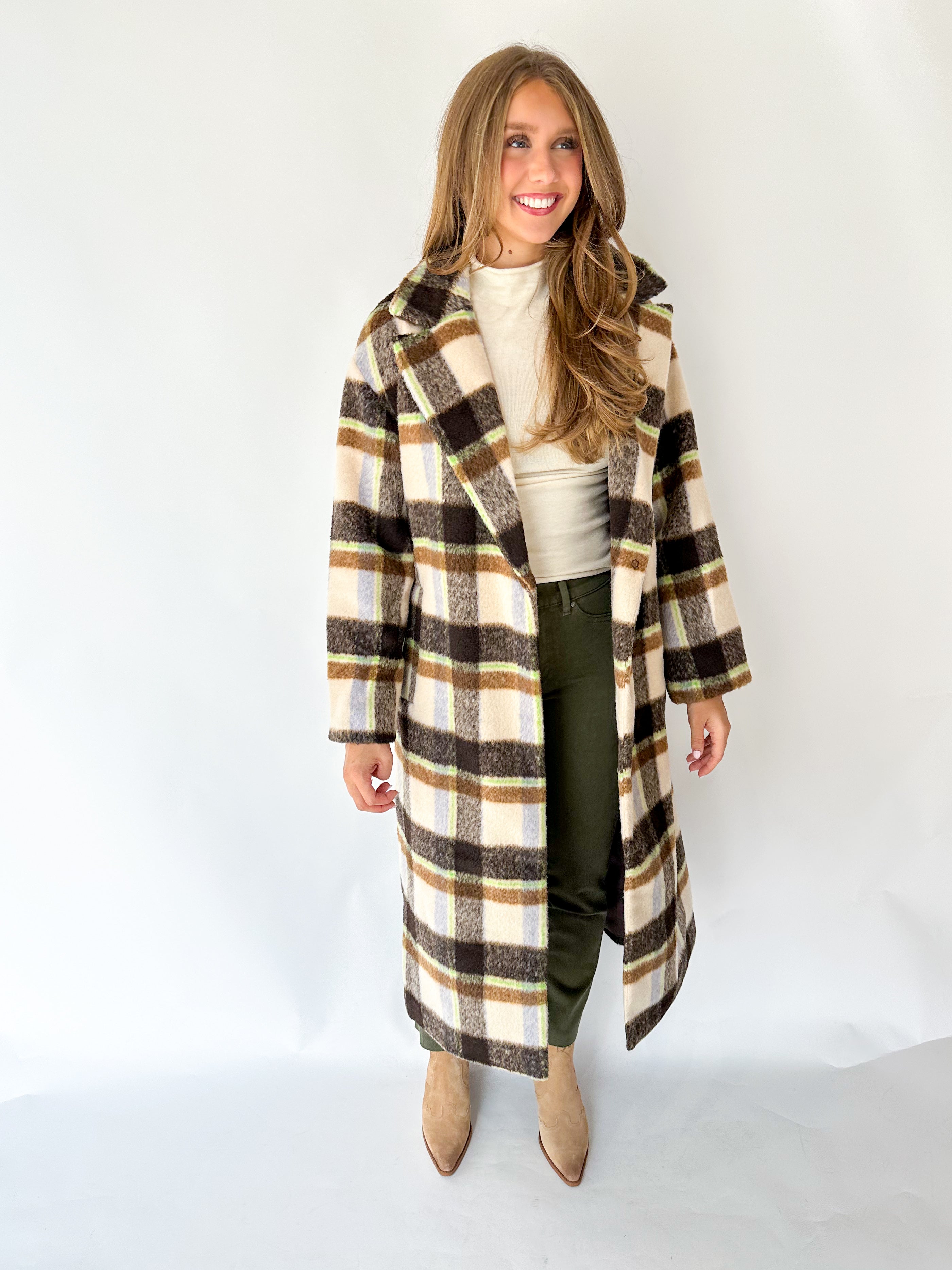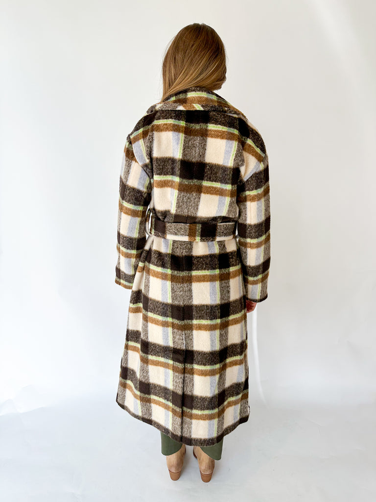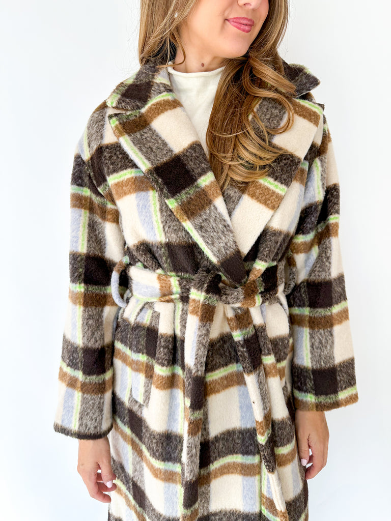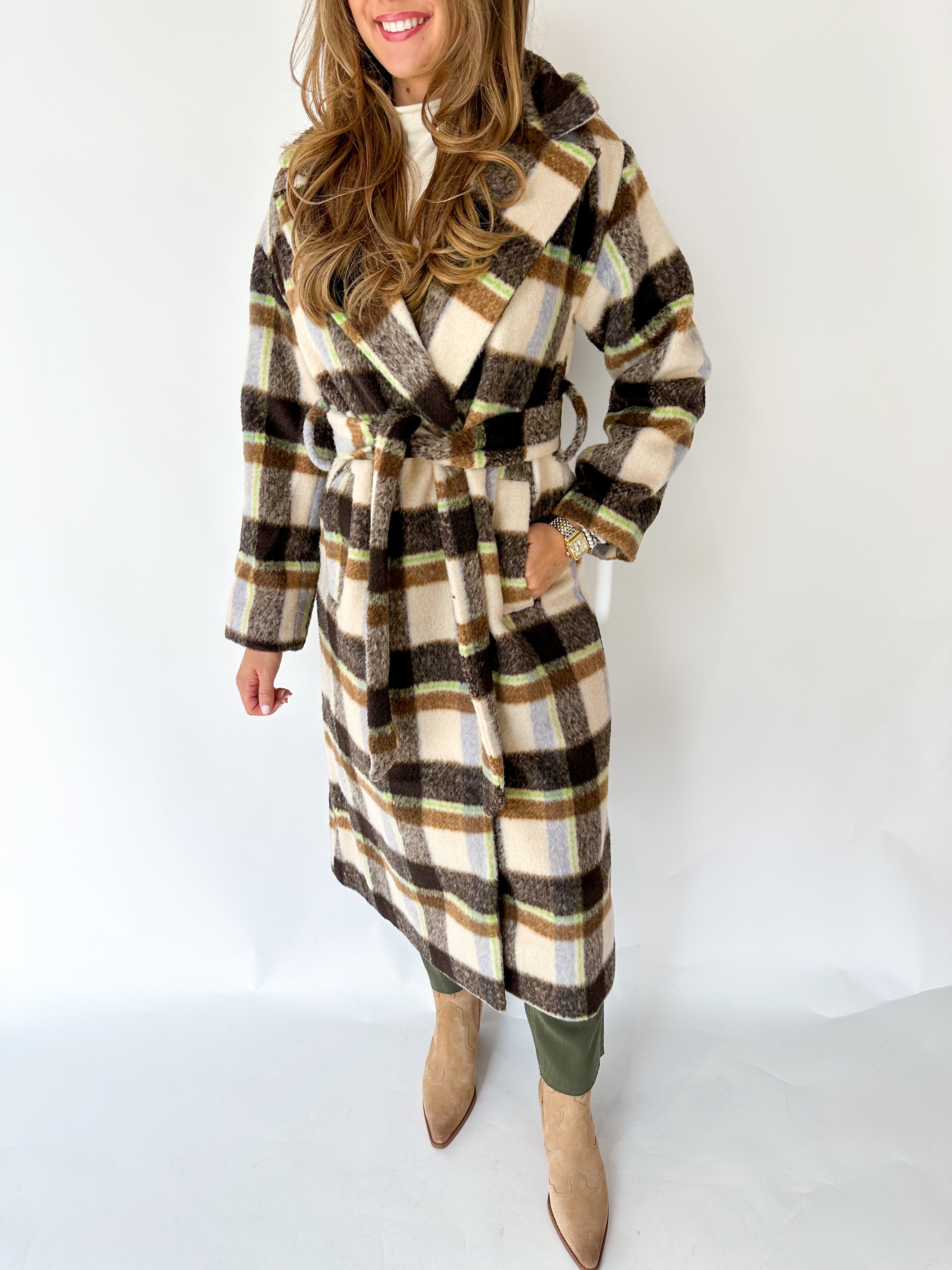 For when your coat is the outfit. The Remi Belted Coat delivers standout style in a rich brown plaid with a jolt of lime green. It’s made from a wool-look fabric with a notched collar and a self-tie belt to pull it all together. Equal parts statement and staple.
