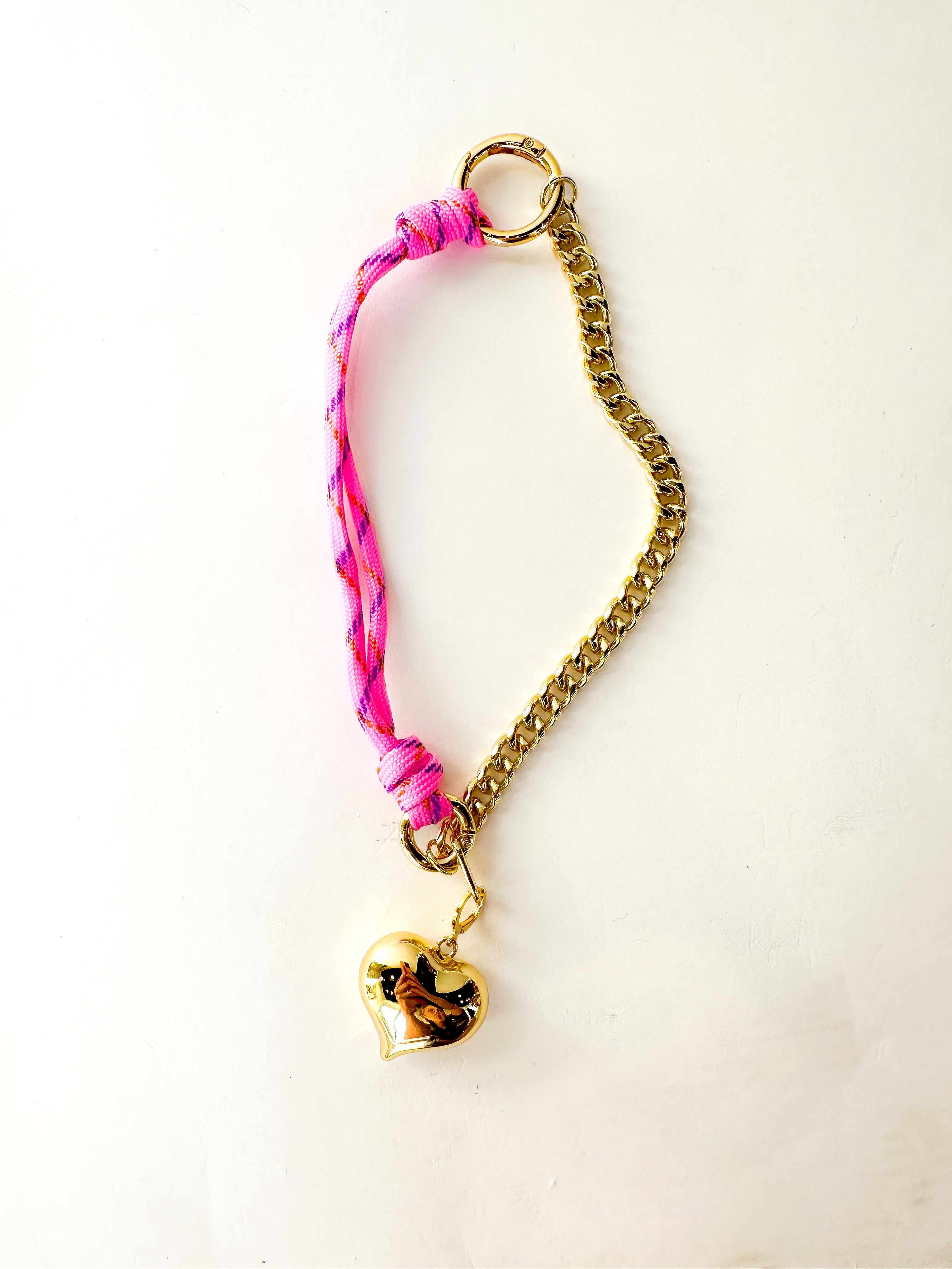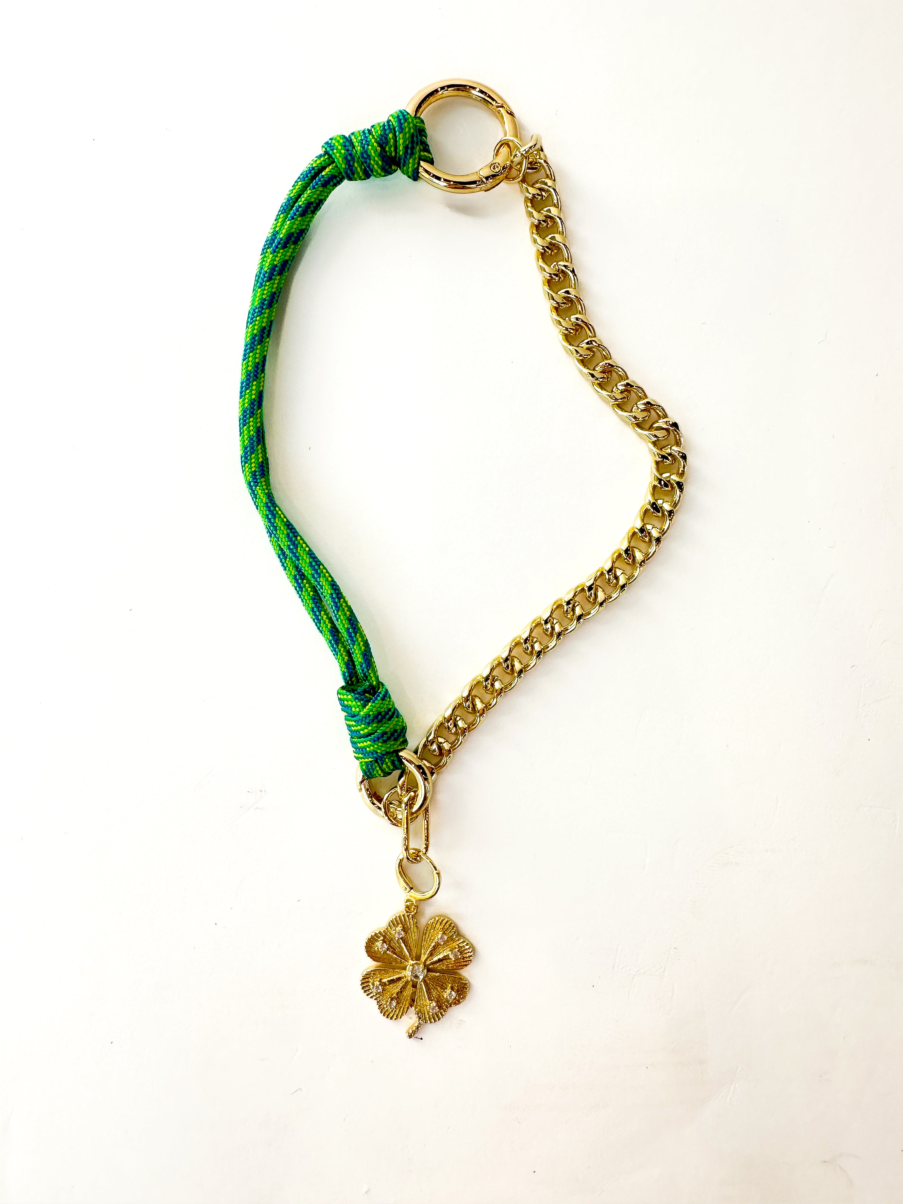 Elevate your style with the Felicity Bag Chain, featuring a unique blend of rope and gold chain adorned with charming details. Choose from a delicate pink version with a heart charm or a vibrant green option paired with a lucky clover charm. This versatile accessory adds a touch of elegance and personality to any bag, making it both stylish and meaningful.