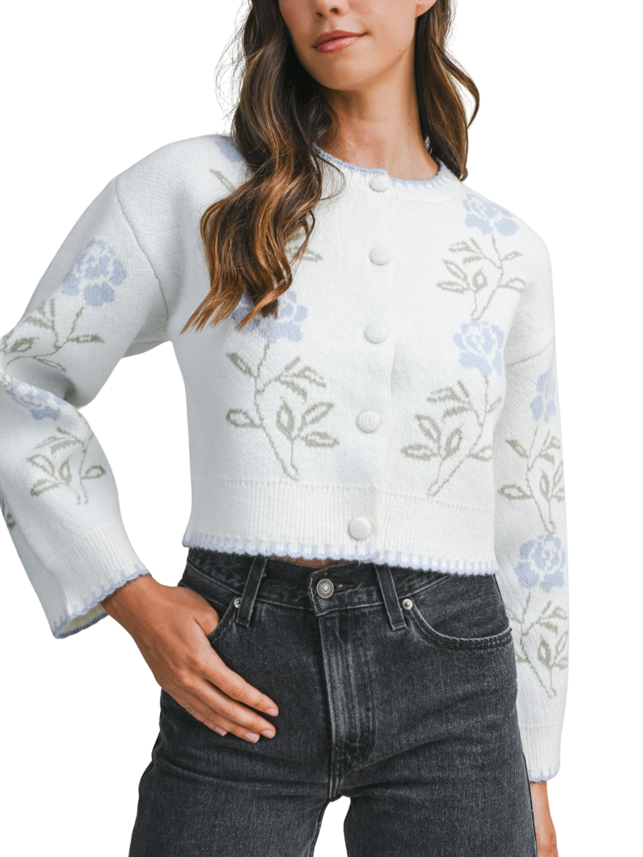 Bloom into style with this charming cropped knit cardigan, adorned with an all-over floral jacquard pattern that brings garden-fresh vibes to any outfit. The round neckline and full button-front closure offer effortless layering, while delicate scalloped trim at the edges adds a sweet, feminine touch. Perfect for pairing with your favorite dresses or high-waisted bottoms for a look that's equal parts cozy and chic.