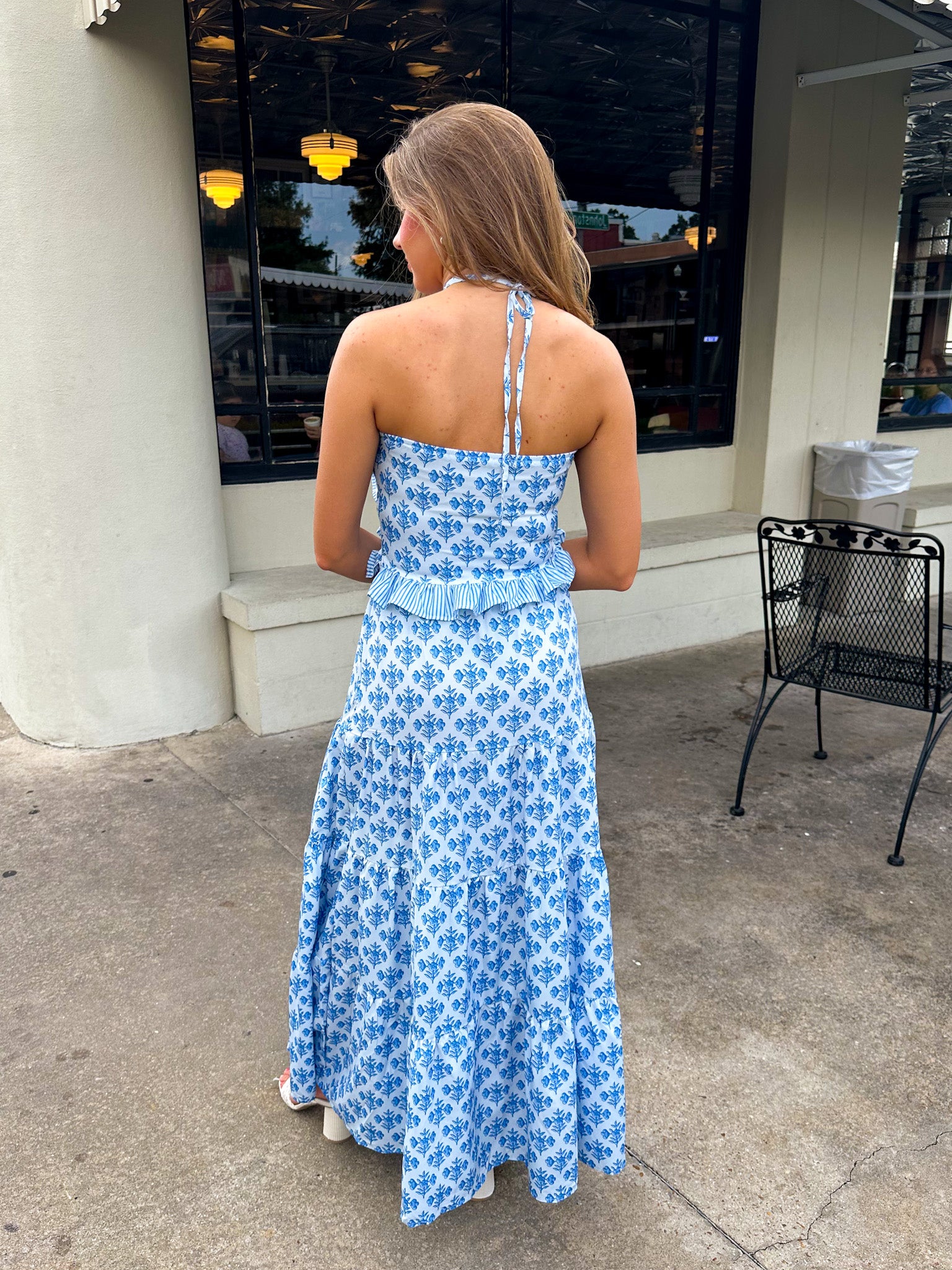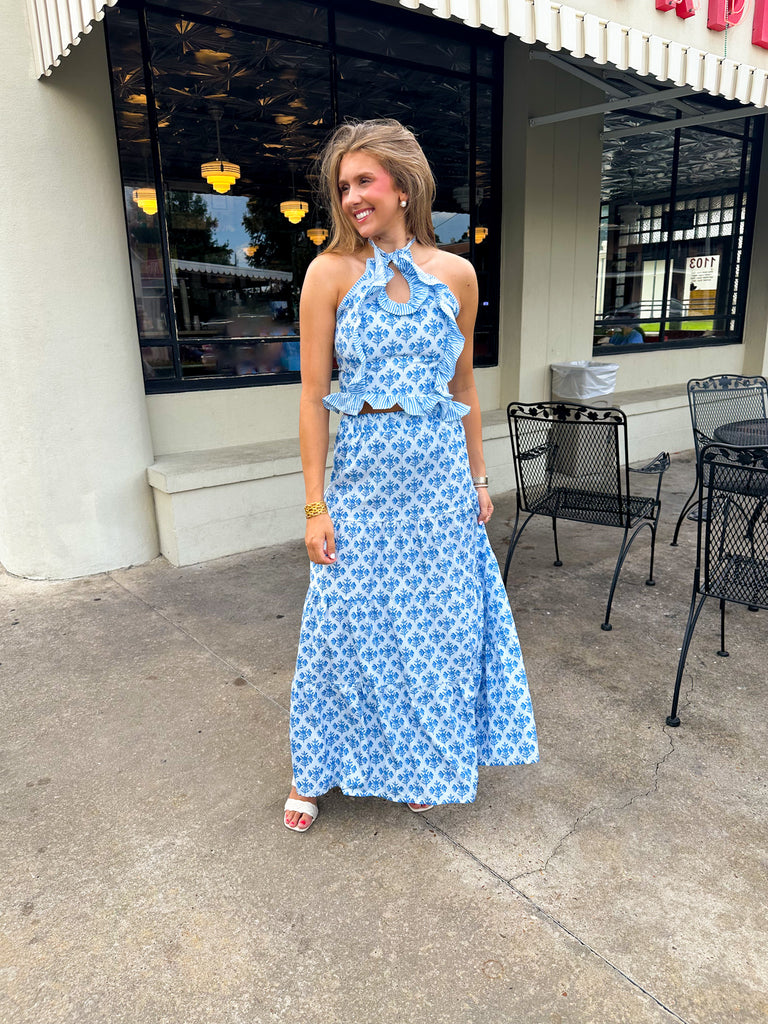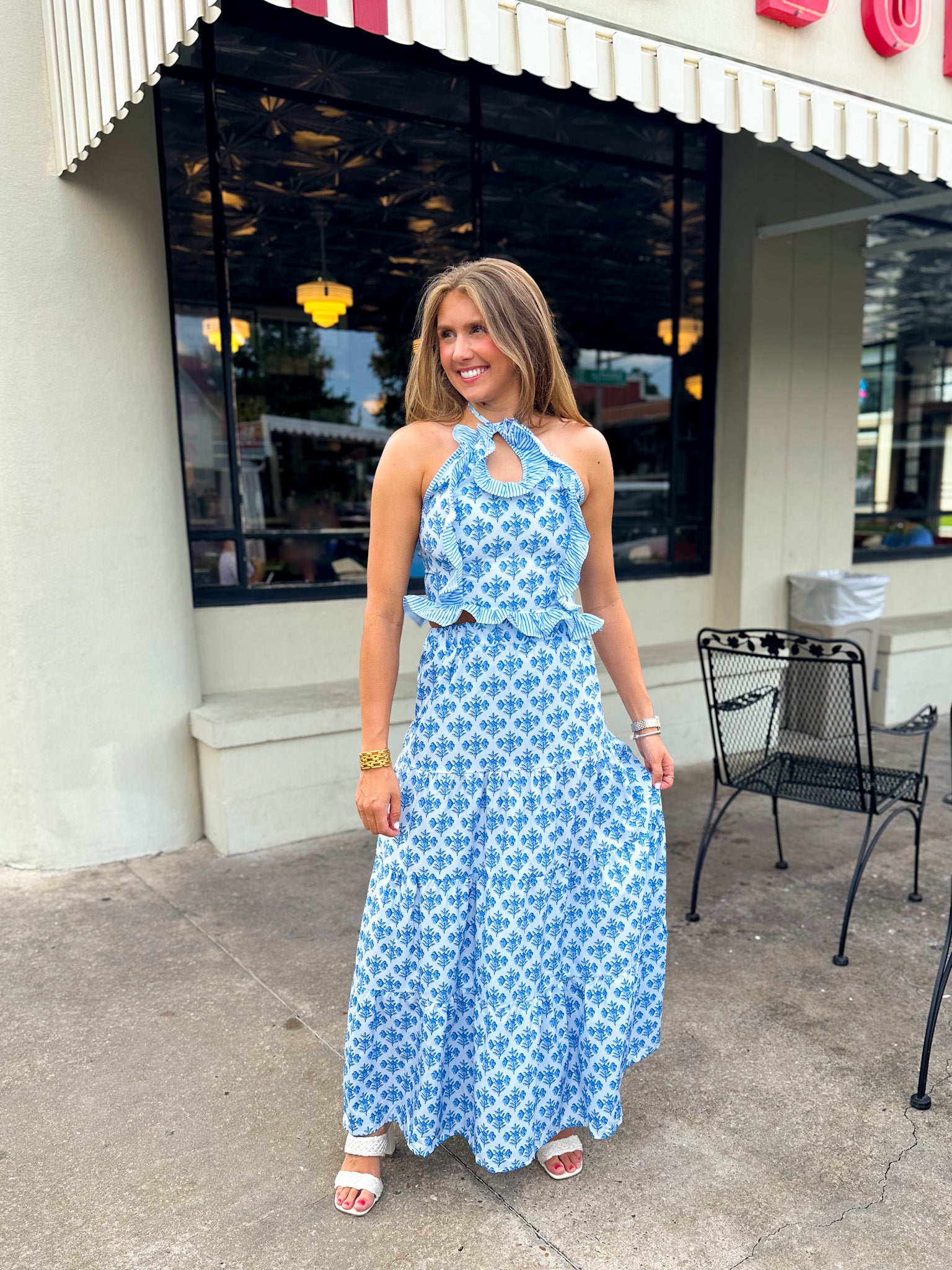 Stylish floral print top with ruffled neckline. Matching flared skirt for comfortable movement. Perfect for spring and summer outings.