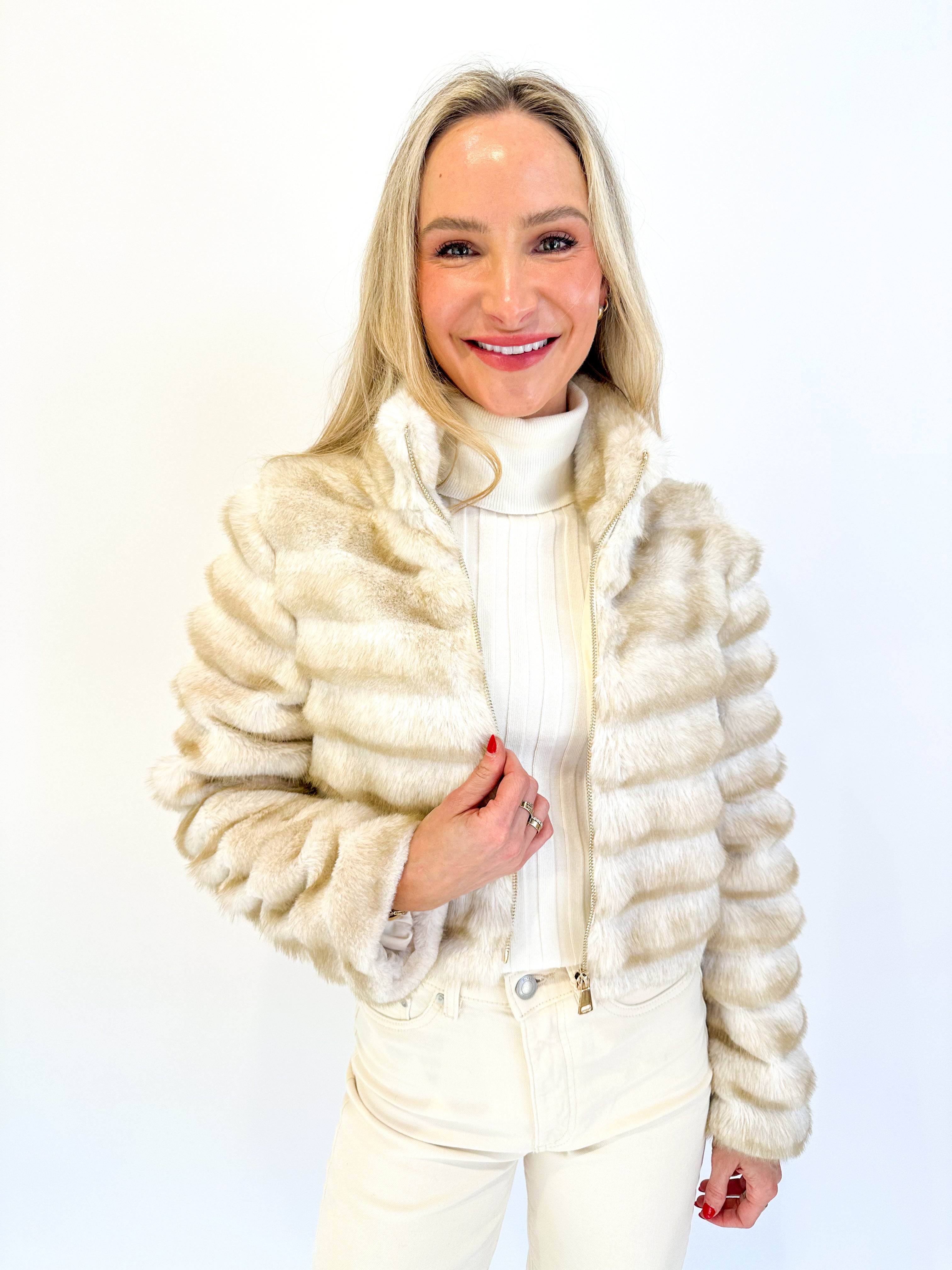 Layer up in style with this grooved faux fur zip front jacket—your new go-to neutral that plays well with everything. Whether you're dressing up or keeping it casual, this cozy piece adds instant texture and warmth to any outfit. The easy zip front makes it effortless to slip on and off, making it the perfect companion for the season ahead.
