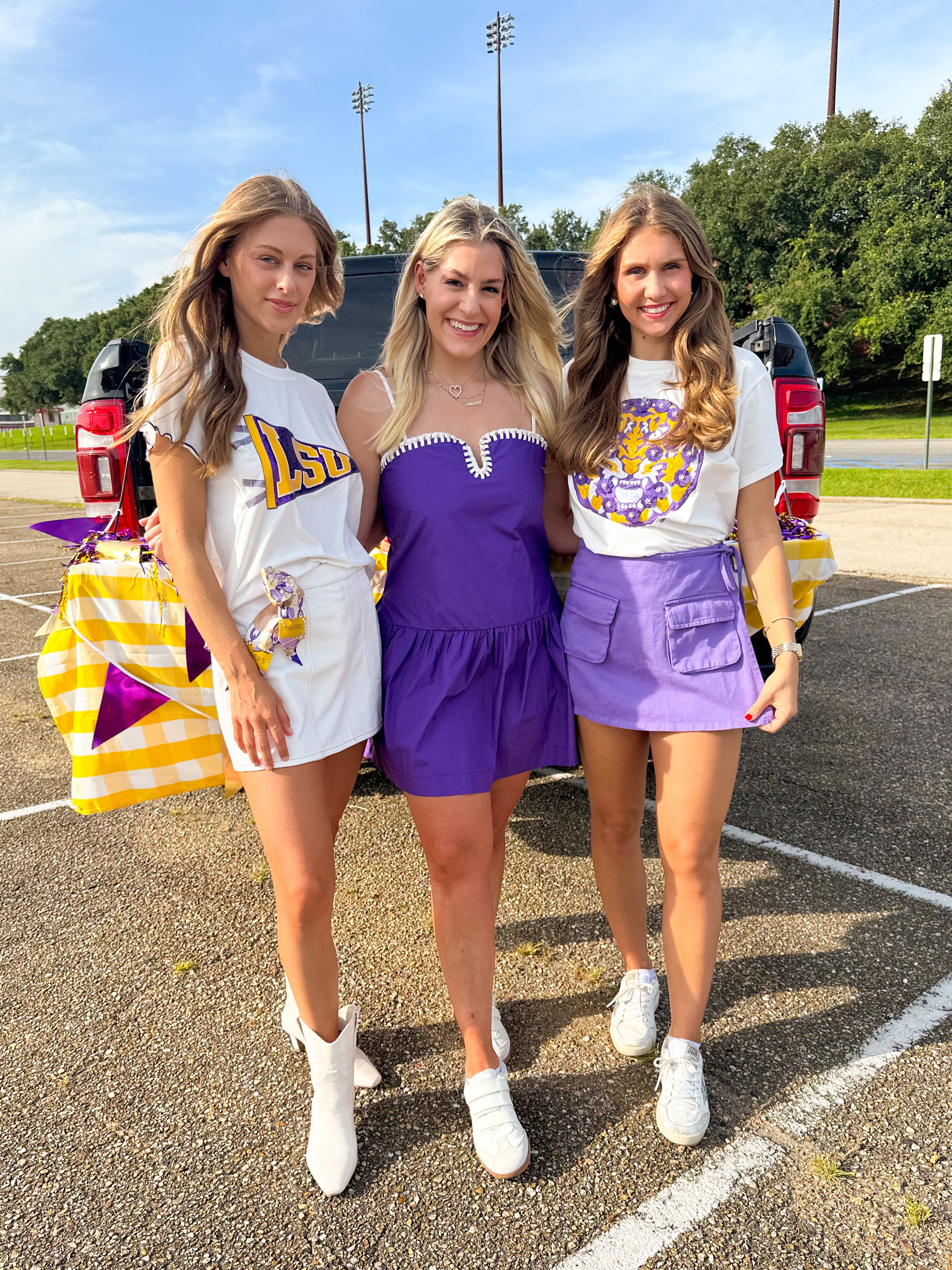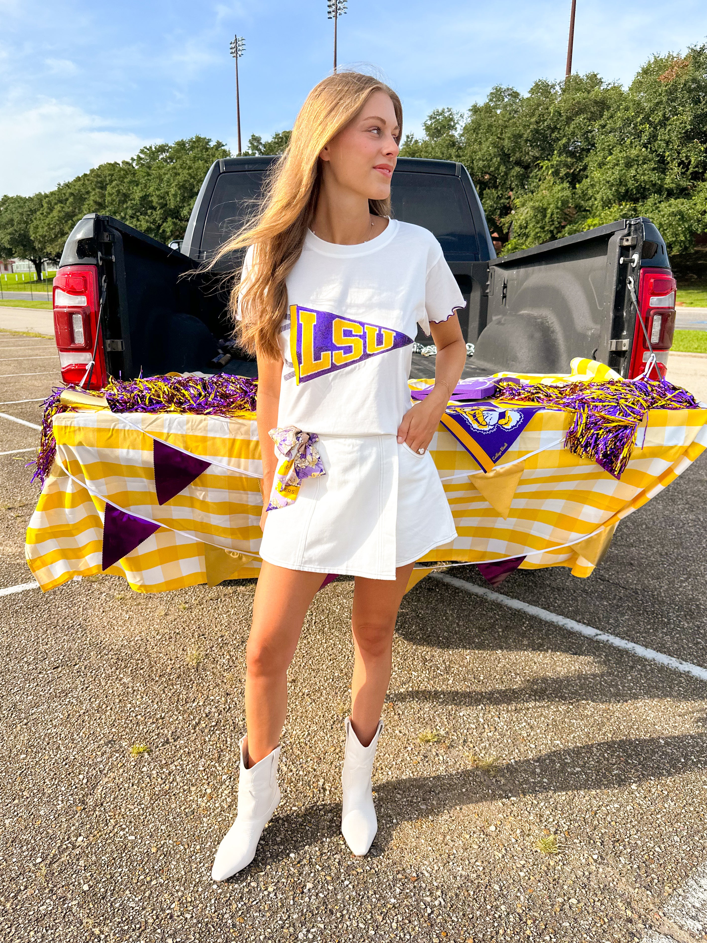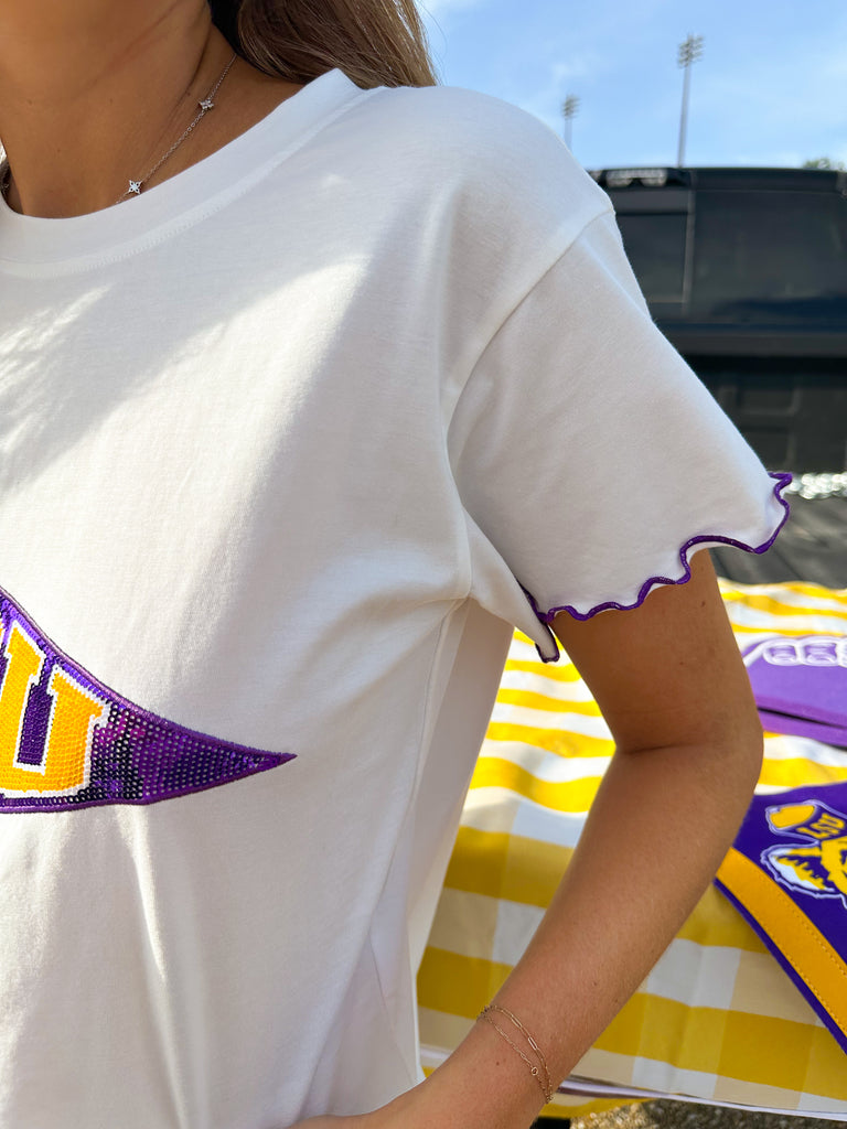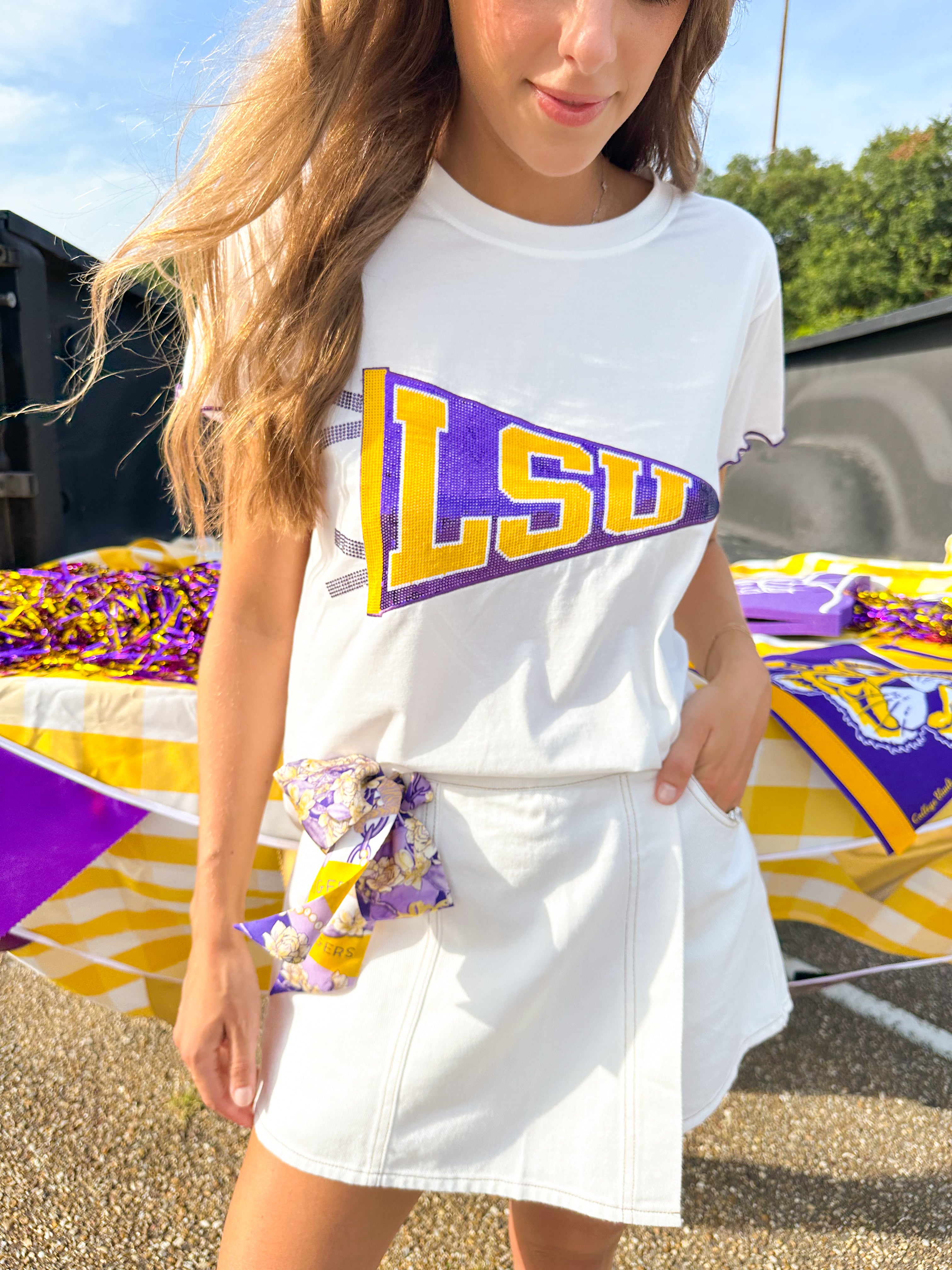 Show your LSU pride in style with the QOS LSU Pennant Frill Tee. Featuring vibrant purple and gold colors and a playful frill design, this tee combines team spirit with a trendy look. Perfect for game days or casual wear! Can we get a Geaux Tigers?