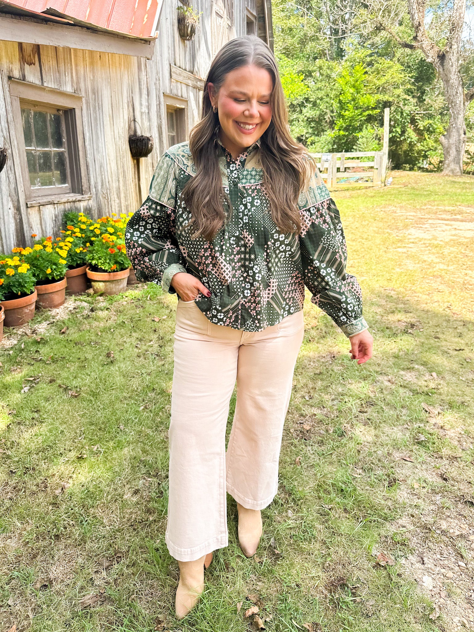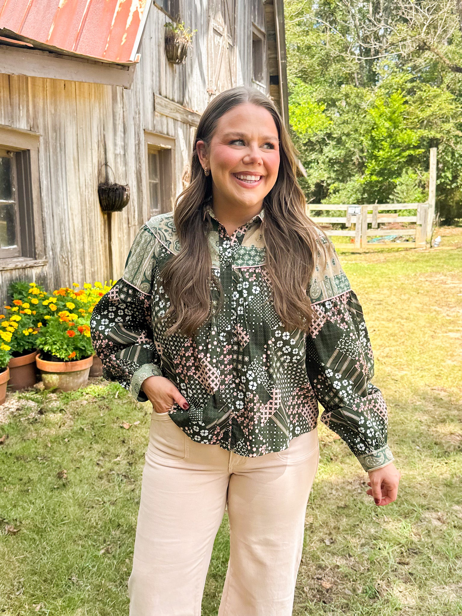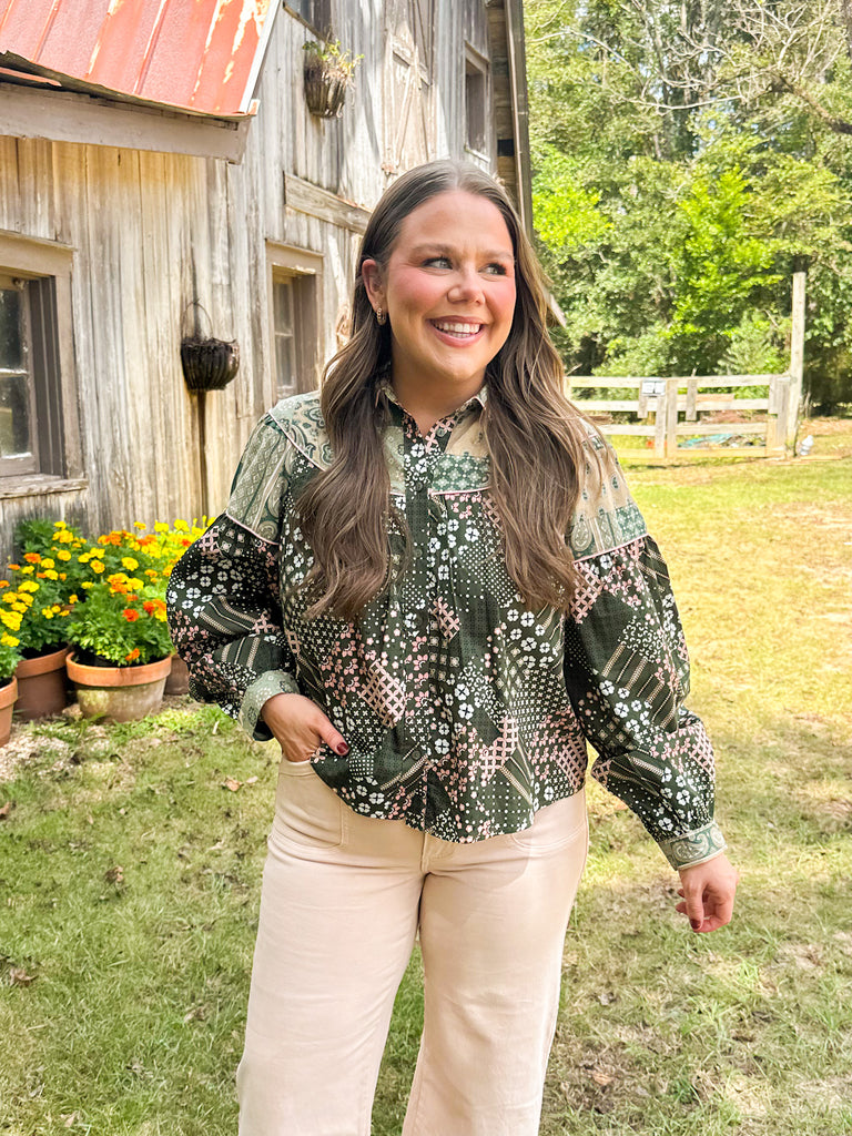 Elevate your wardrobe with this Mixed Patchwork Print Button Down Top. Featuring a classic collared neckline and button-down placket, it offers a polished look infused with bold style. Contrast piping along the neckline, yoke, and shoulders adds a refined touch, while the drop shoulder long puff sleeves with buttoned cuffs create a flattering, modern silhouette.
