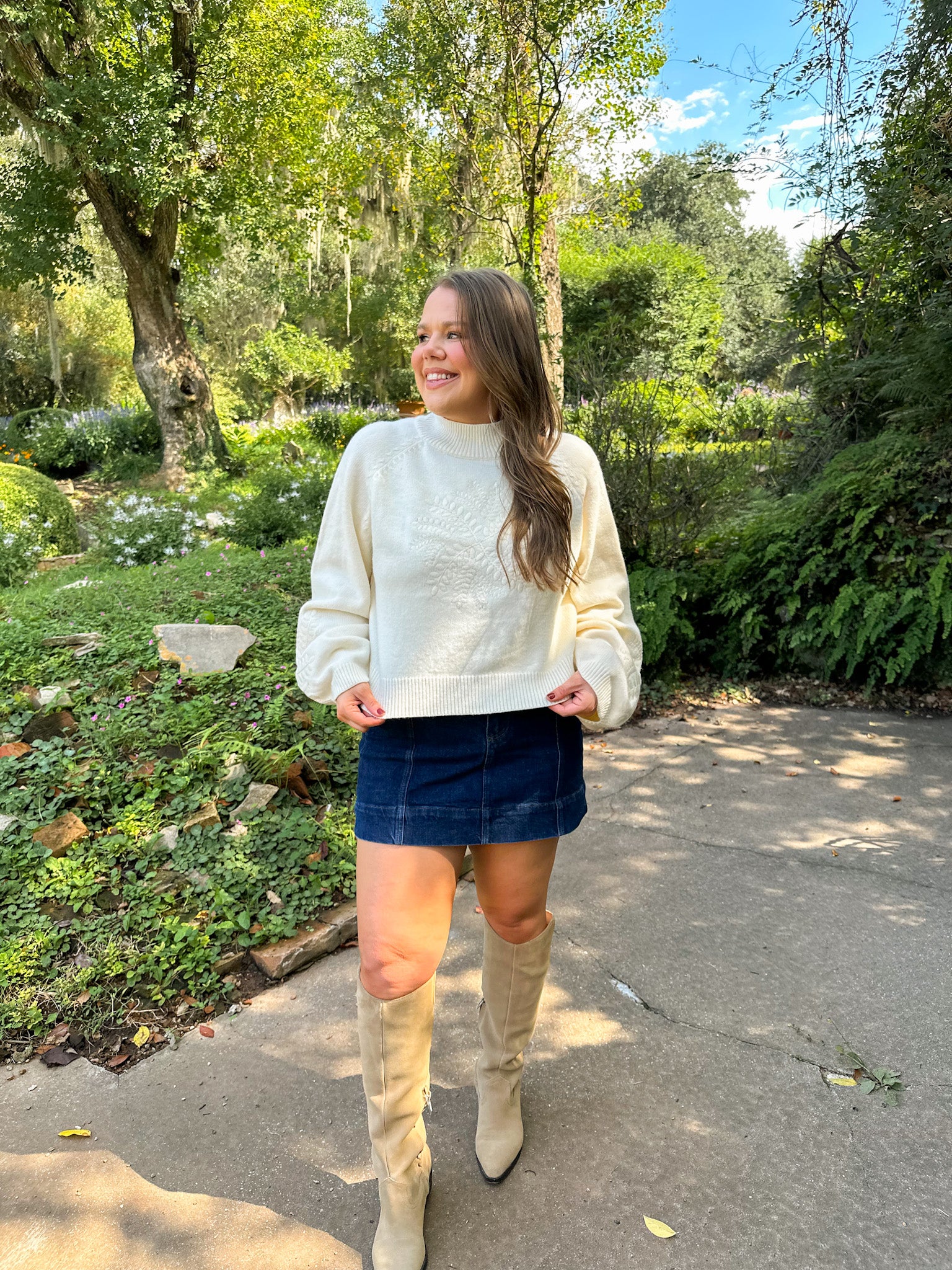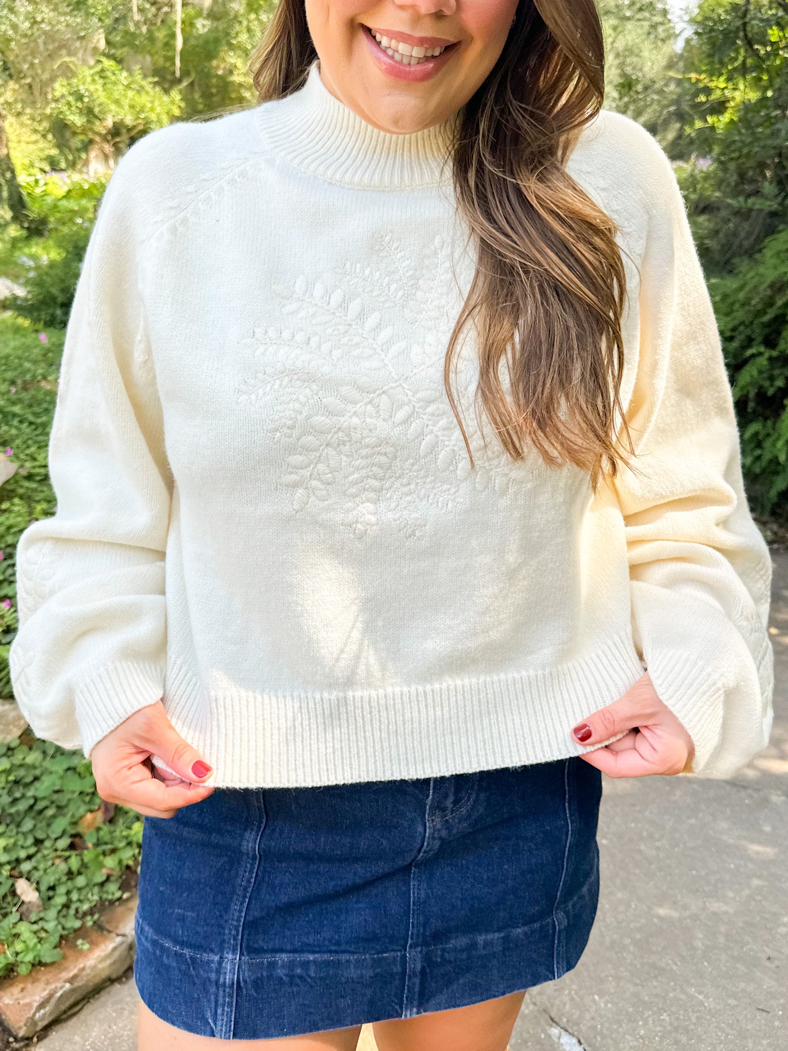 Mock Neck Balloon Sleeve Embroidered Sweater