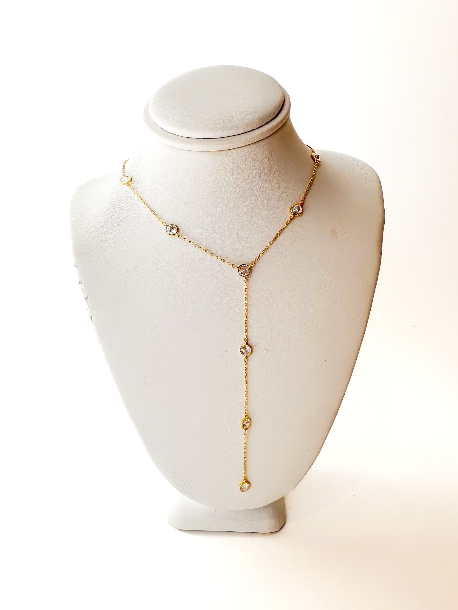 The Abby Drop Necklace features a delicate gold chain adorned with sparkling CZ stones along the length and a charming drop detail. Perfect for layering or worn solo, it adds an elegant touch to any outfit with ease.
