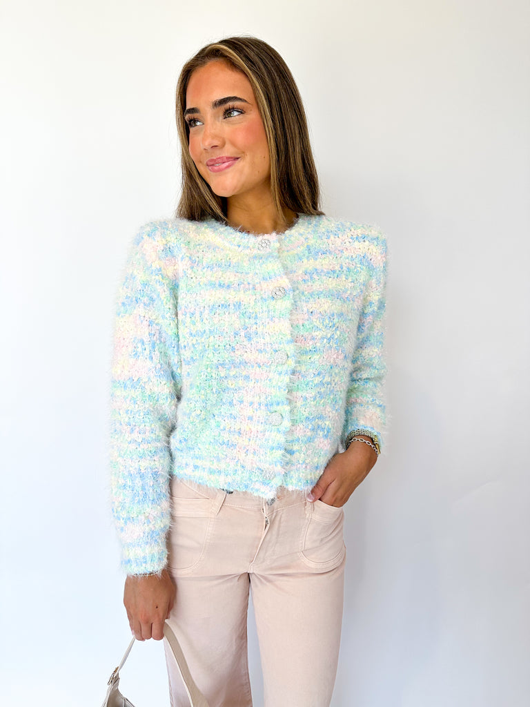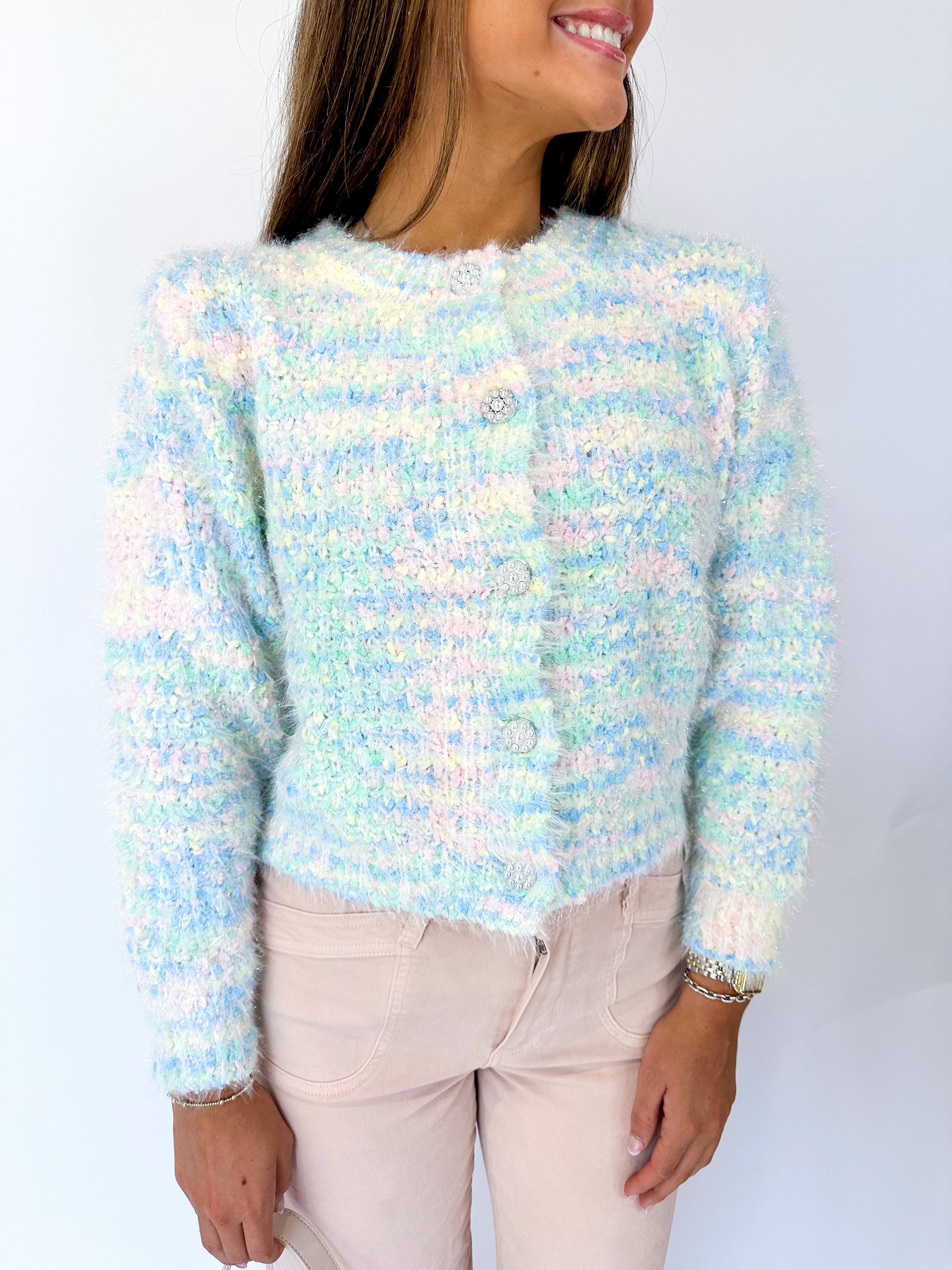 Elevate your wardrobe with this multicolor long sleeve knit cardigan featuring elegant pearl jewel buttons. Its soft, breathable fabric offers cozy comfort while the vibrant hues add a stylish pop to any outfit. Perfect for layering, this cardigan combines classic charm with modern flair to keep you warm and polished throughout the day.