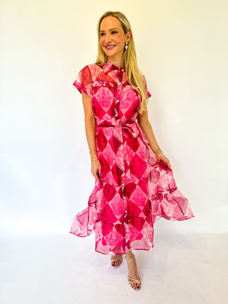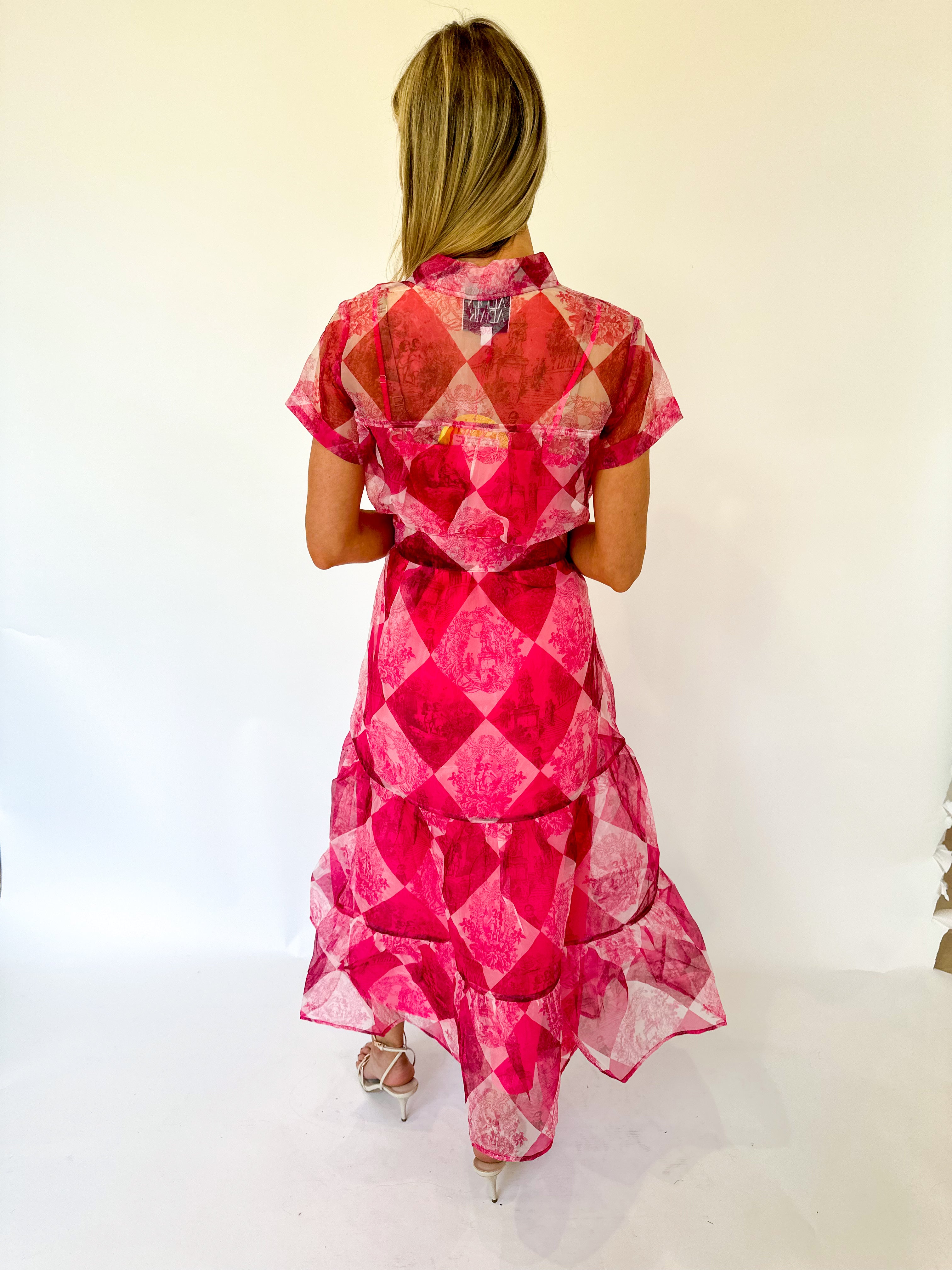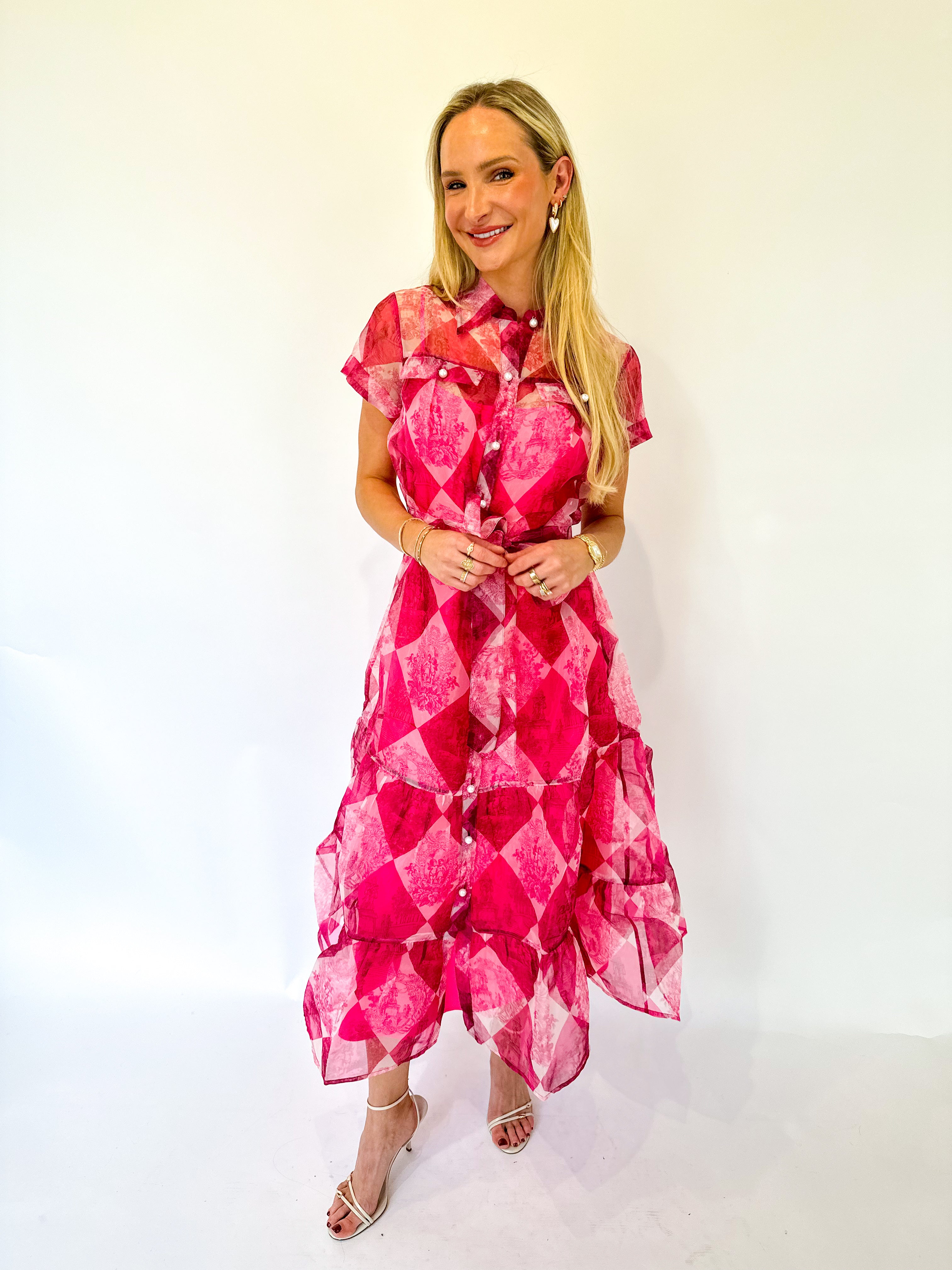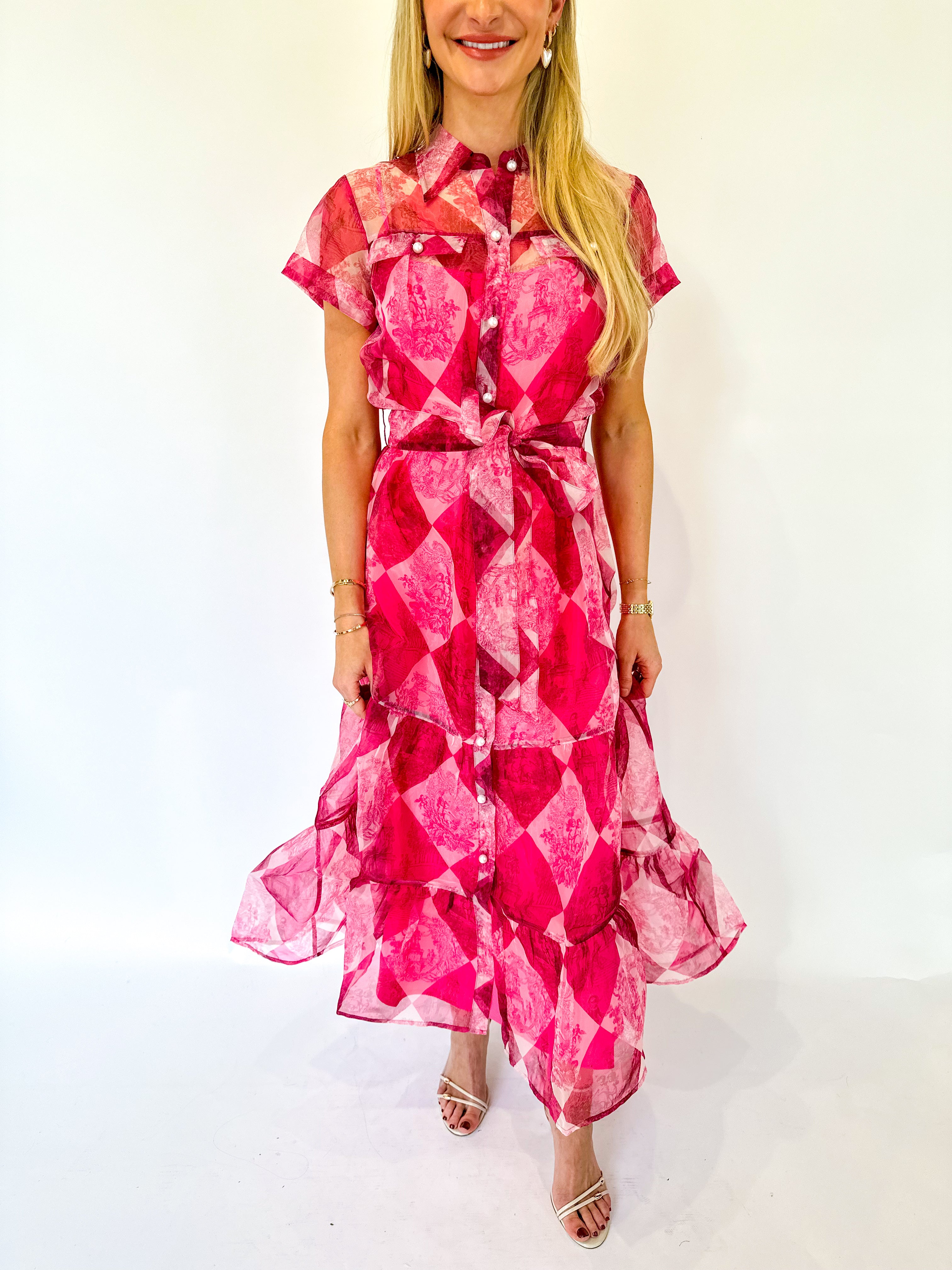 This dress is perfect for any occasion, offering unbeatable style that will leave you feeling confident and fabulous. The Rachel is a short sleeve button down dress with a matching adjustable belt and tiered skirt - in our toile print!