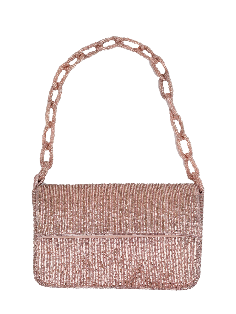 Elevate your style with this Rose Beaded Bag, featuring intricate beadwork and a matching beaded link shoulder strap for a seamless, elegant look. Its delicate rose color adds a soft, feminine touch, making it the perfect accessory for special occasions or nights out. Lightweight and eye-catching, this bag combines craftsmanship with chic design to enhance any outfit effortlessly.