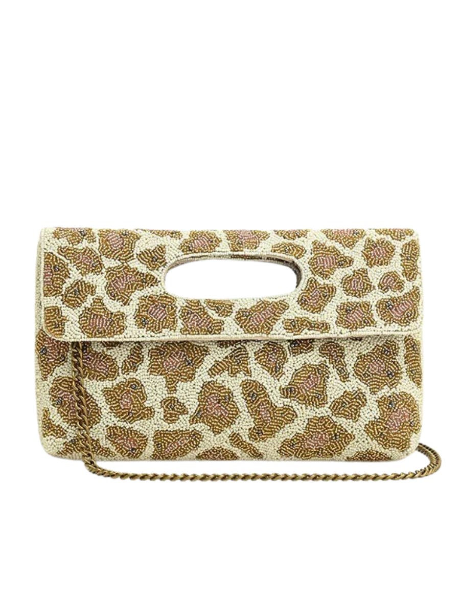 Elevate your evening look with this stunning rose gold leopard clutch, adorned with shimmering beads and sequins that catch the light beautifully. The detachable chain strap offers versatility—carry it as a handheld clutch or wear it crossbody. Inside, a fully lined interior keeps your essentials secure, while the magnetic button closure ensures nothing slips away. Perfect for nights out that demand a touch of glamour.