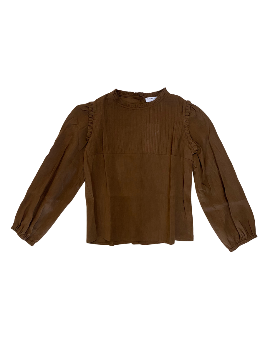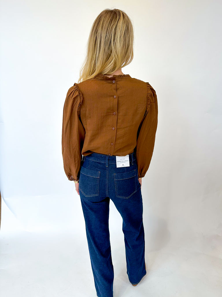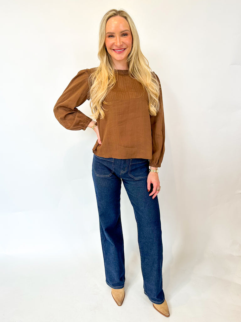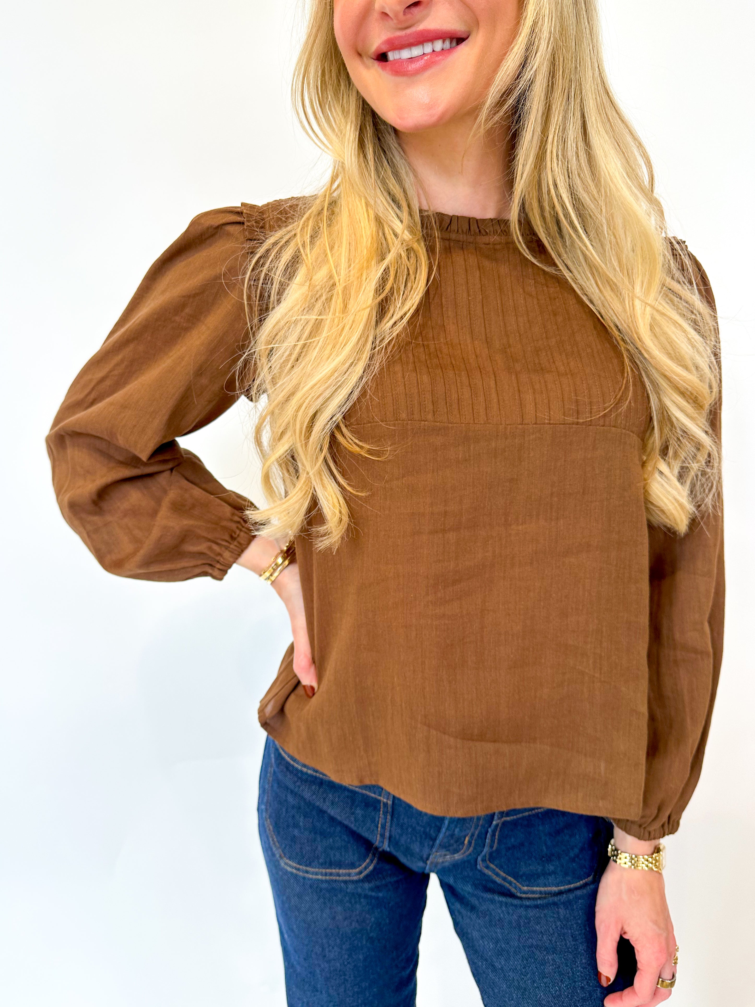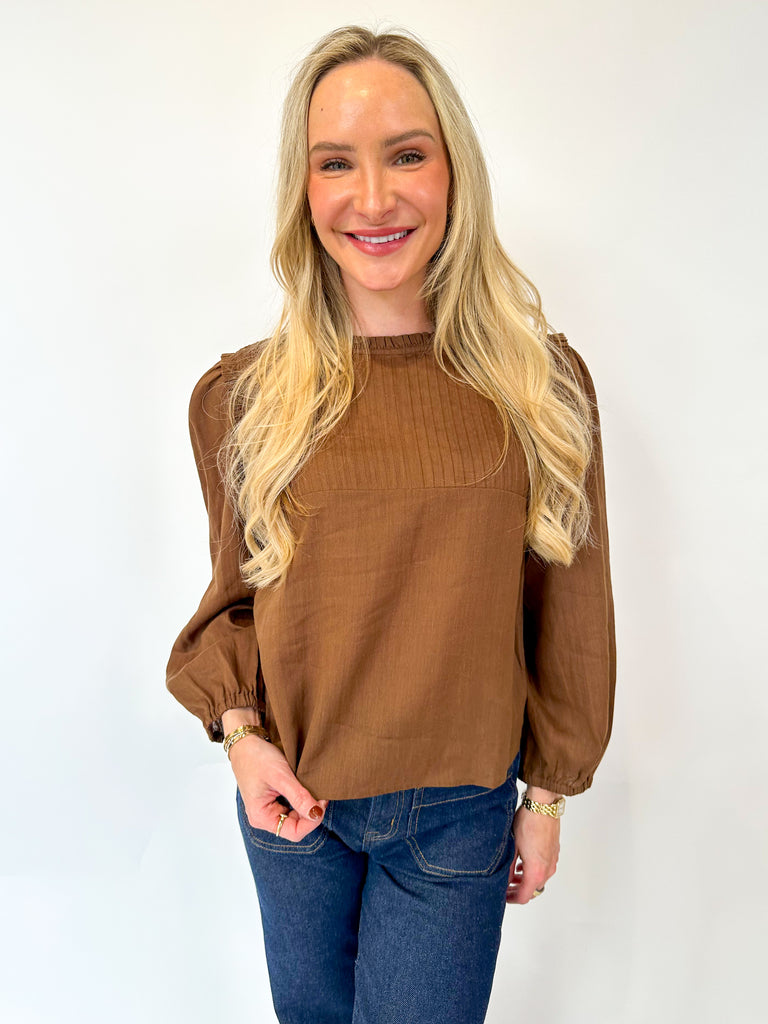 Elevate your fall essentials with this sophisticated Rose Top in Brown. Featuring a graceful high neckline adorned with delicate pleating, long sleeves, and a flowing silhouette that moves beautifully with you. This versatile staple pairs effortlessly with everything in your wardrobe—dress it up or down for endless styling possibilities. A must-have piece that brings understated elegance to every season.