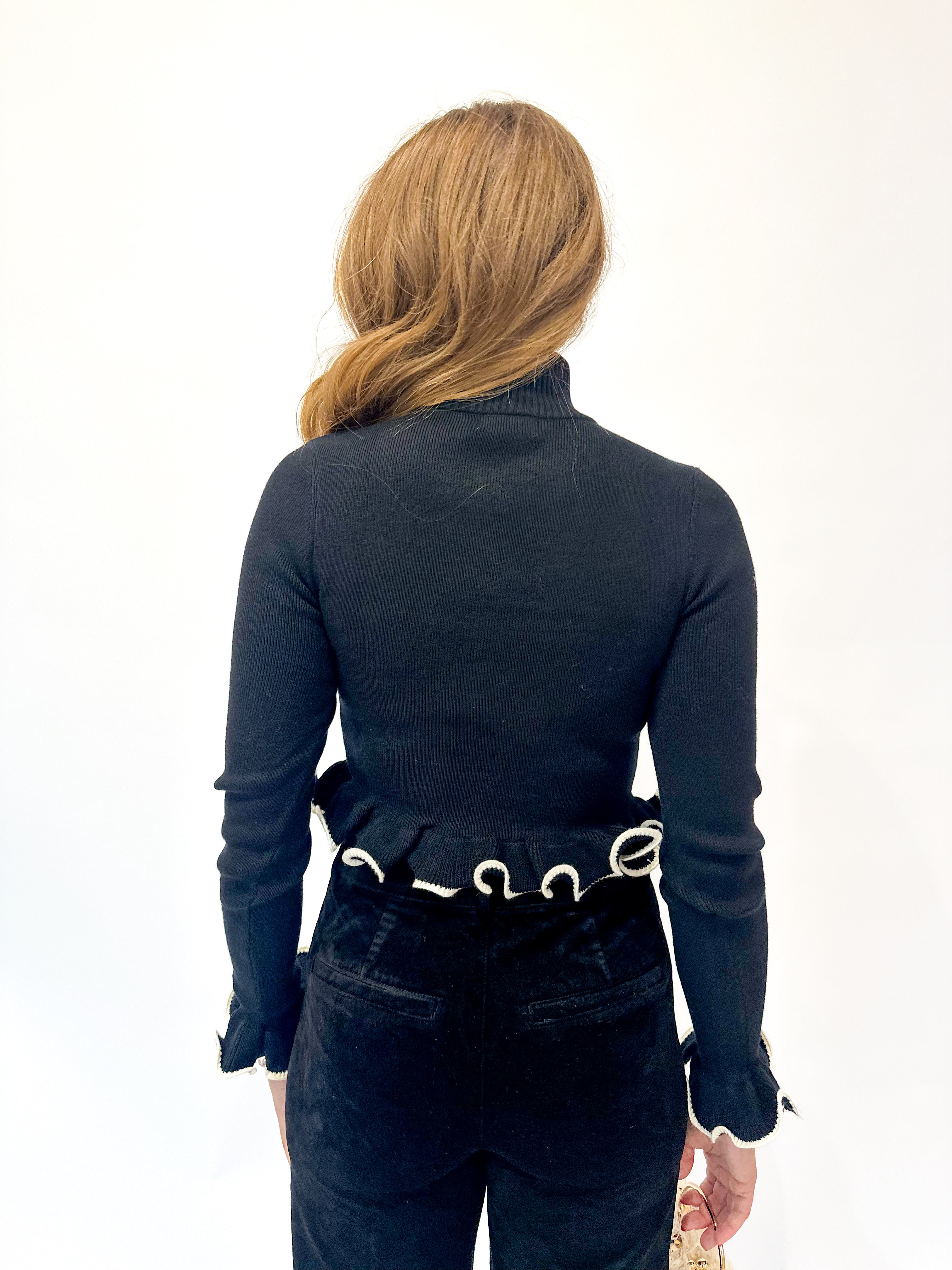 Cozy up in this adorable black knit turtleneck that's anything but basic! Featuring charming white ruffle trim at the wrists and hem, it's the perfect blend of classic and cute. The cropped silhouette pairs effortlessly with high-waisted jeans or skirts for a look that's totally on-trend. Soft, stretchy knit keeps you comfortable all day long, while those playful ruffles add just the right amount of personality to your everyday wardrobe.