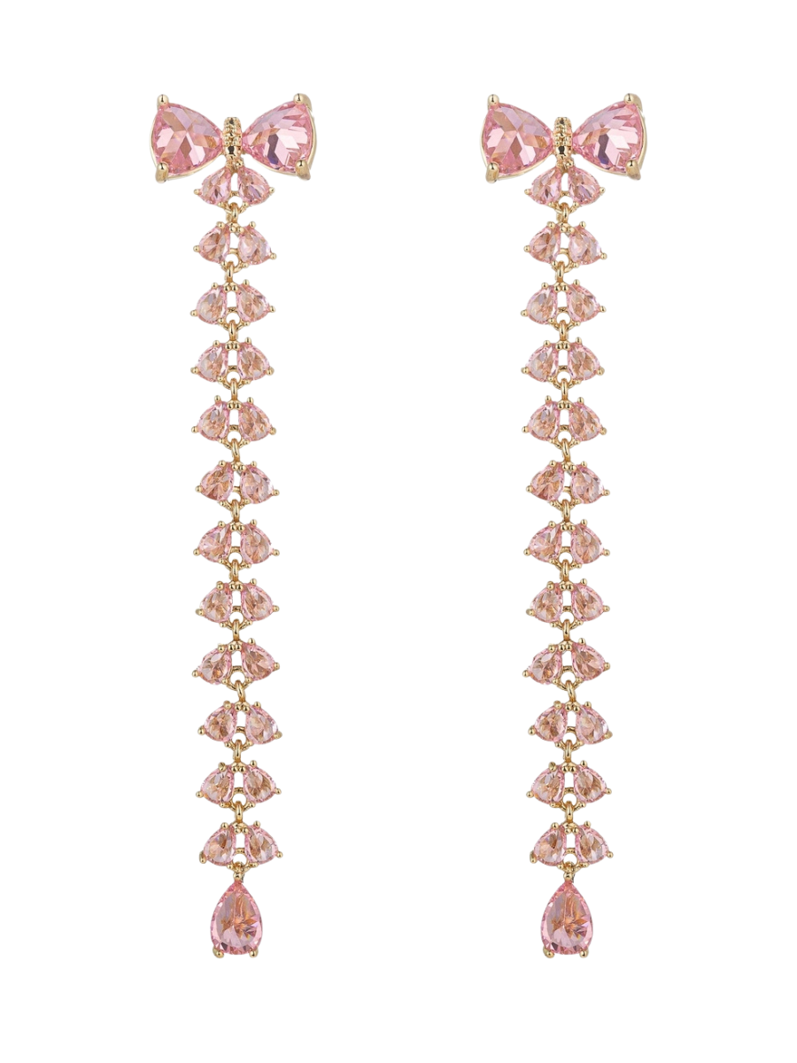 Garner a new glamorous look with these bright pink bow earrings! These bow earrings boast shining pink zirconia crystals that are further complimented by a gold brass base to really let their beauty shine through. Pair these long earrings with a gold necklace to complete the jewelry set!