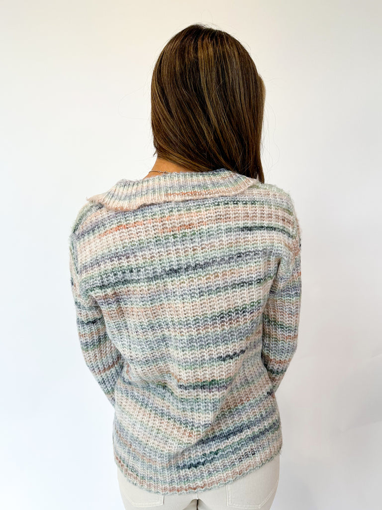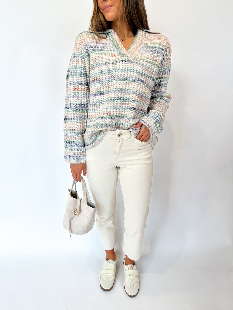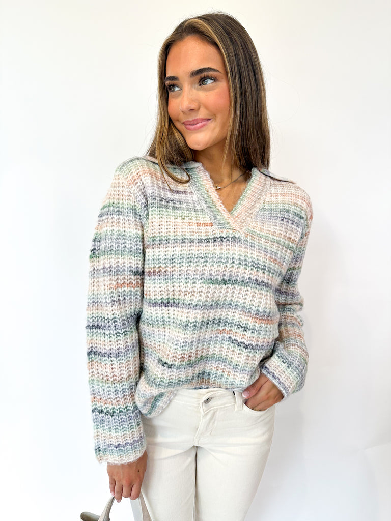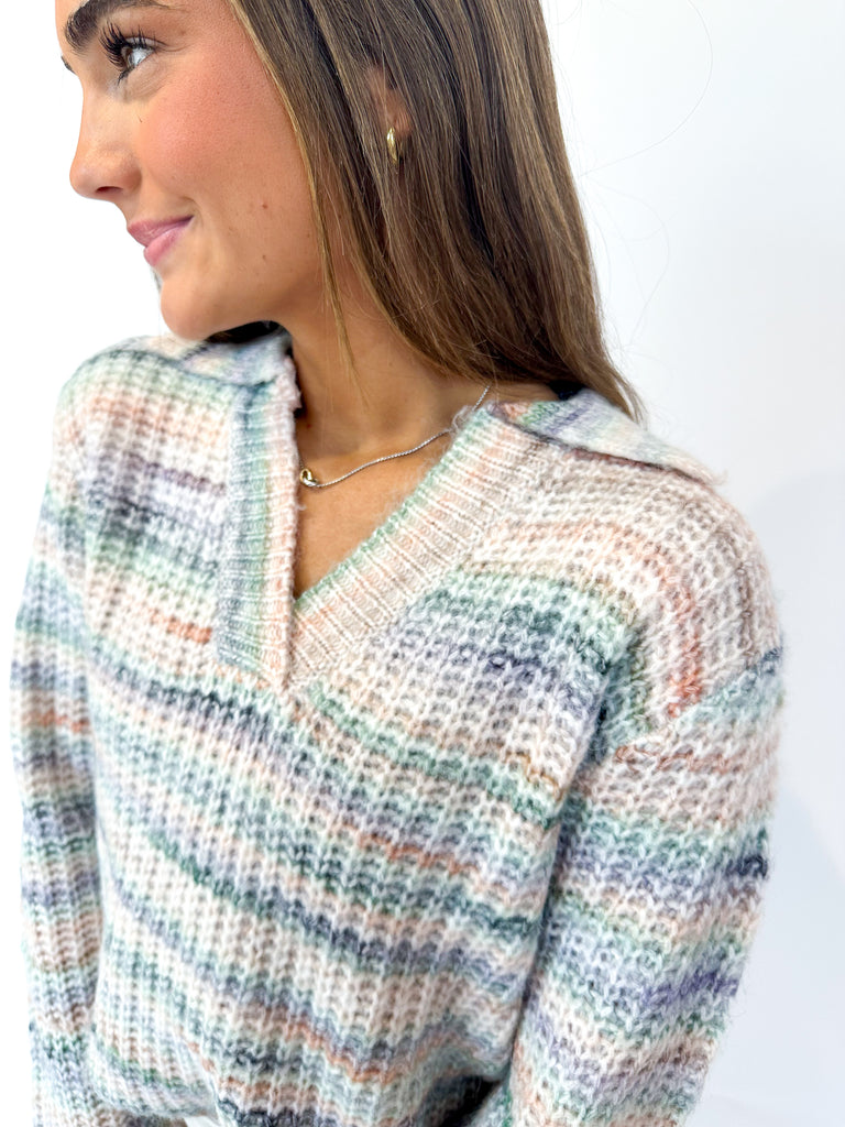 Elevate your wardrobe with this Space Dye Collar Pullover Knit Sweater. Featuring a vibrant multicolor space dye pattern, a flattering V-neck collar, and cozy long sleeves, it combines style and comfort effortlessly. Perfect for layering or wearing on its own, this sweater adds a chic, eye-catching touch to any outfit.