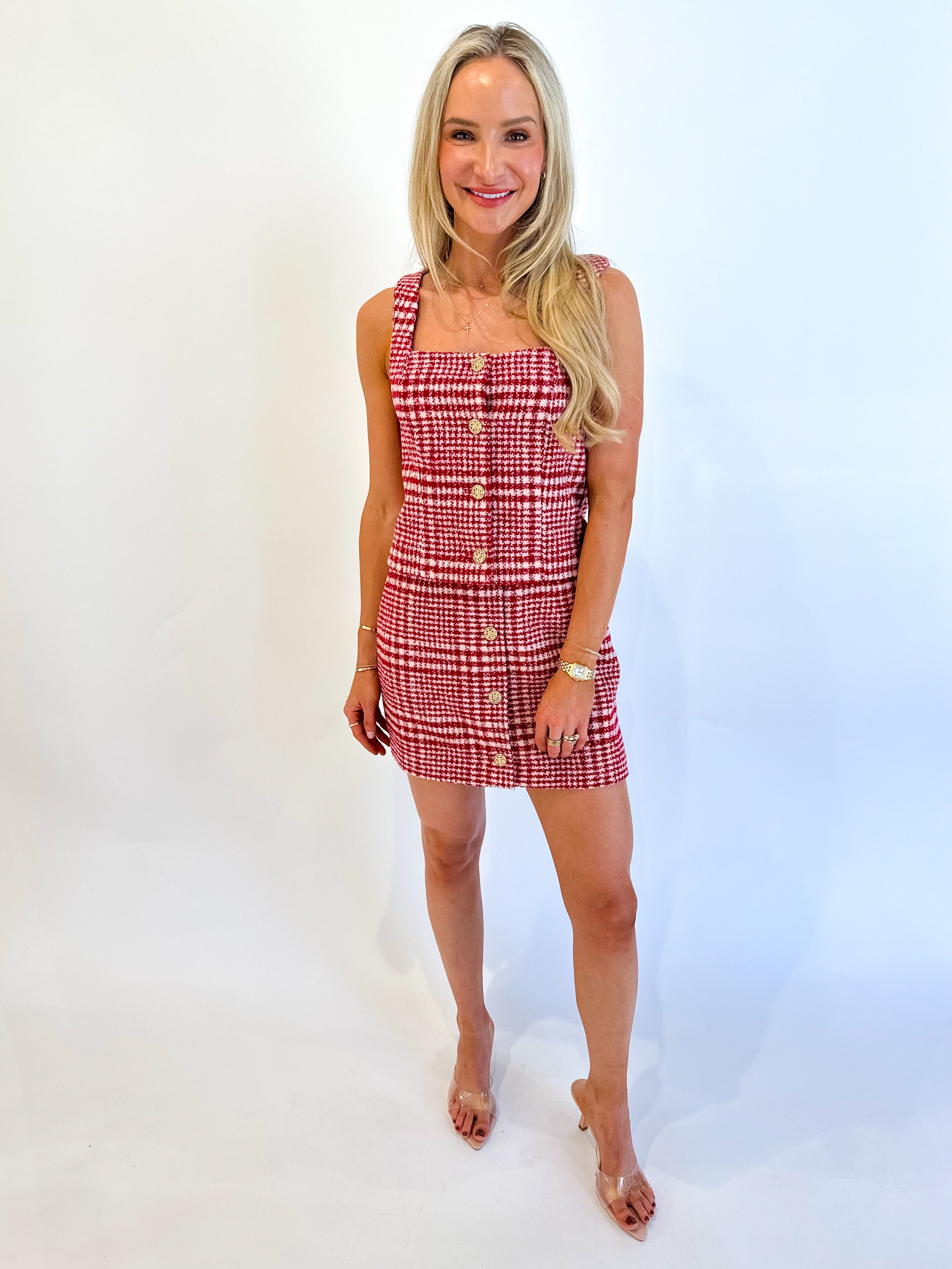Gives “put-together” without trying too hard. With a structured fit, square neckline, and chunky gold buttons, the Brushed Houndstooth Sleeveless Top is as polished as it is wearable. Match it with the coordinating mini skirt, or tone it down with vintage denim.