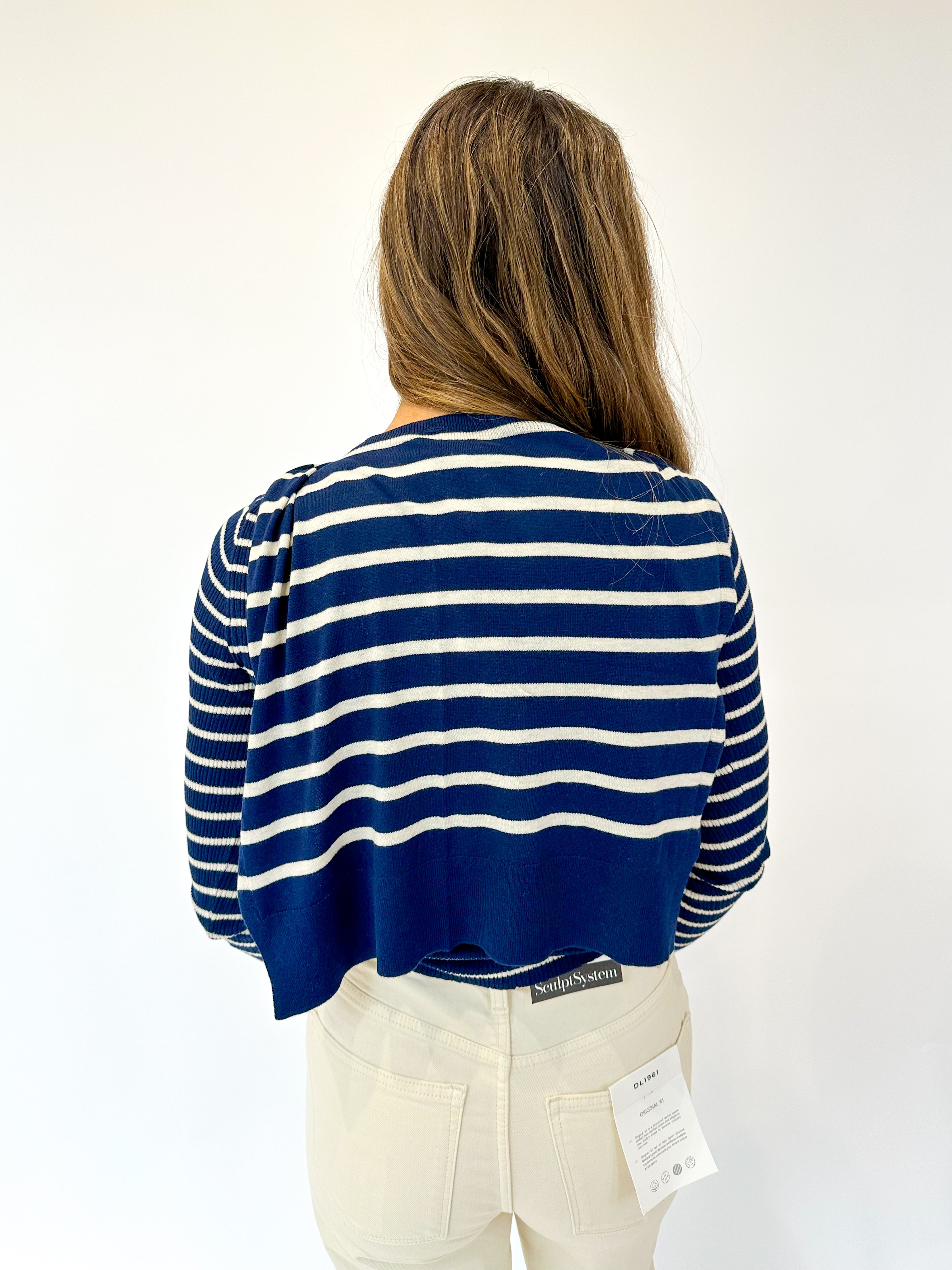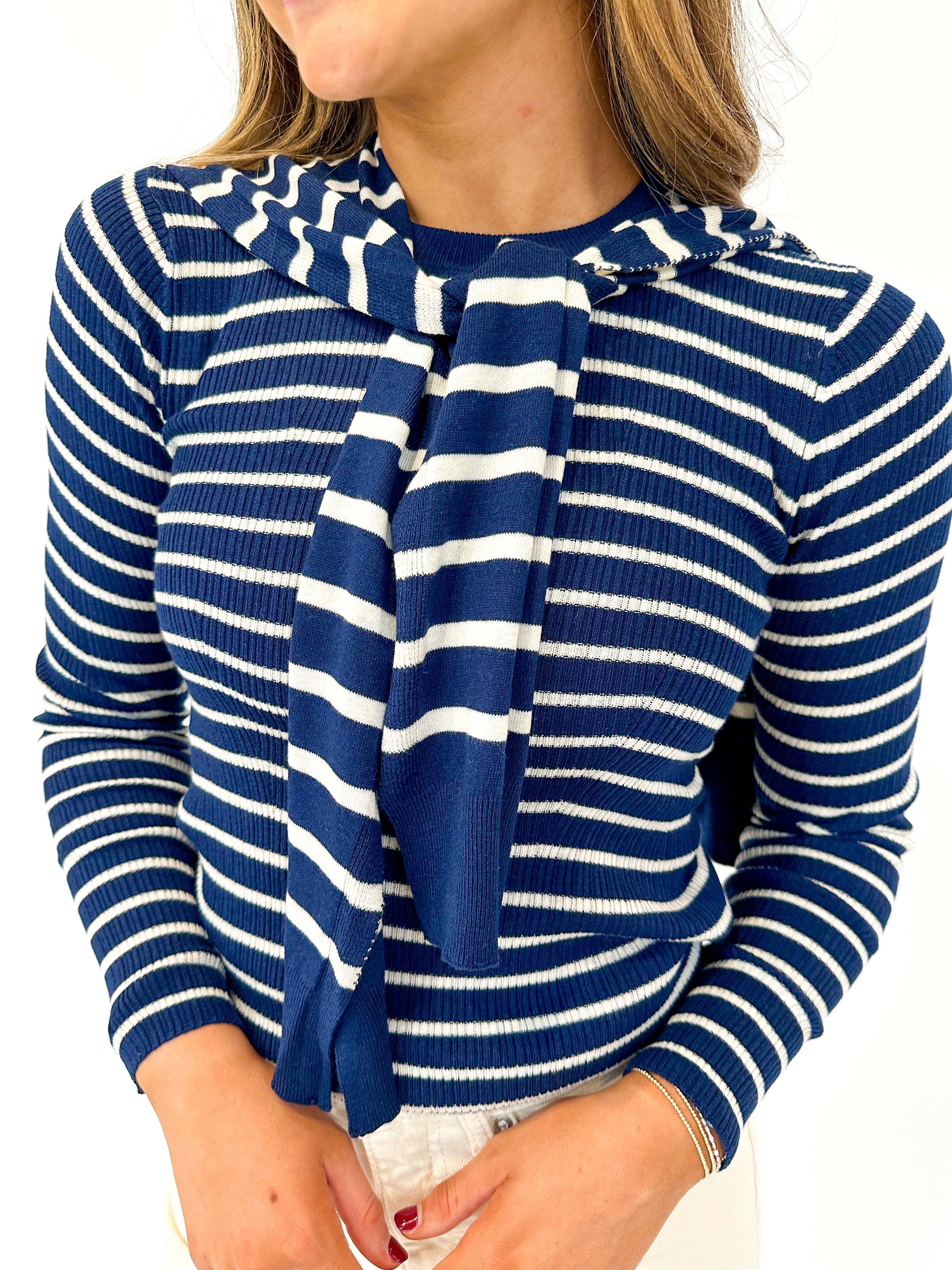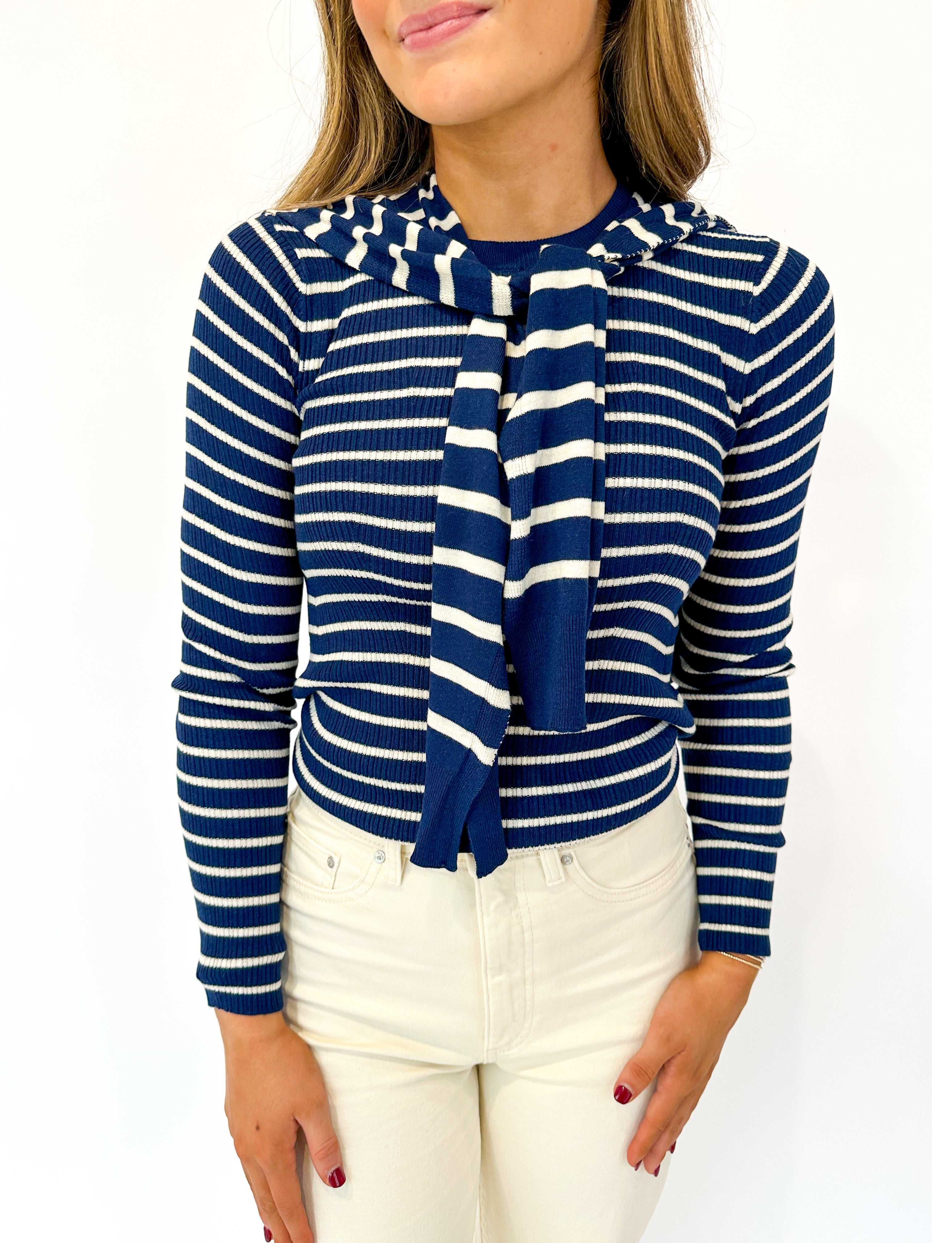 Effortless layering meets timeless style with this navy and ivory striped sweater. The faux cardigan overlay draped across the shoulders adds instant polish without the bulk, making it your go-to piece for casual days that need a touch of chic. Simple, versatile, and always in rotation.