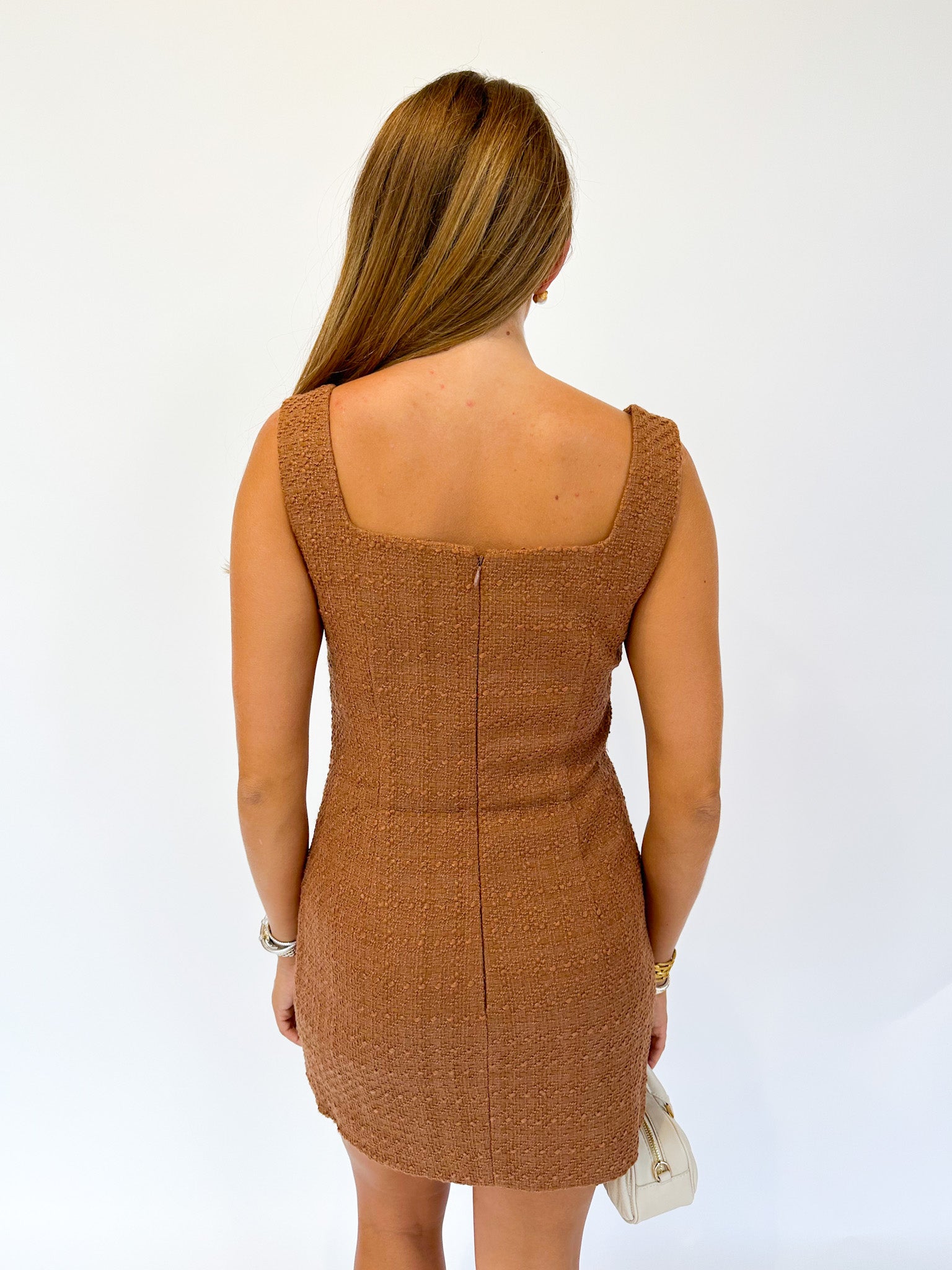 Structured Tweed Square Neck Mini Dress in Cafe Brown