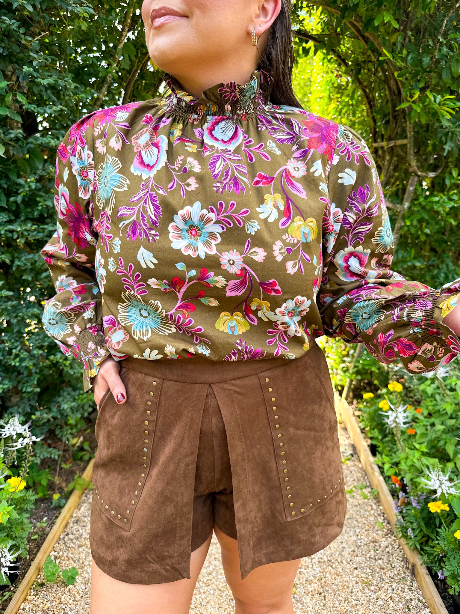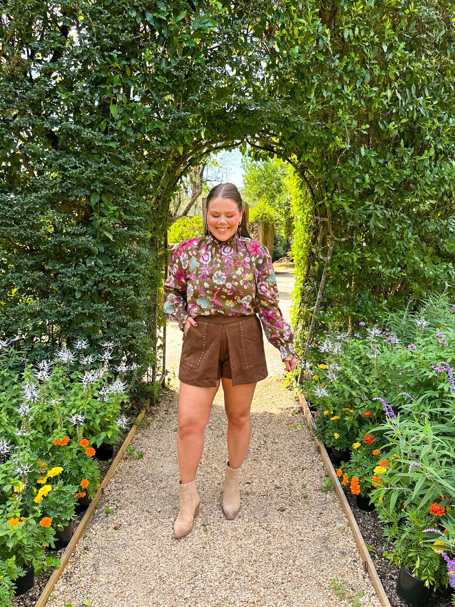 Elevate your style with this Studded High Waist Skort, crafted from soft suede for a luxurious feel. The high-rise waist with elastic back ensures a comfortable, flattering fit, while the shorts beneath provide ease of movement. Featuring an open front skort layer and studded pockets, it combines edgy details with practical design. Perfect for bold, confident looks that don’t compromise on comfort.