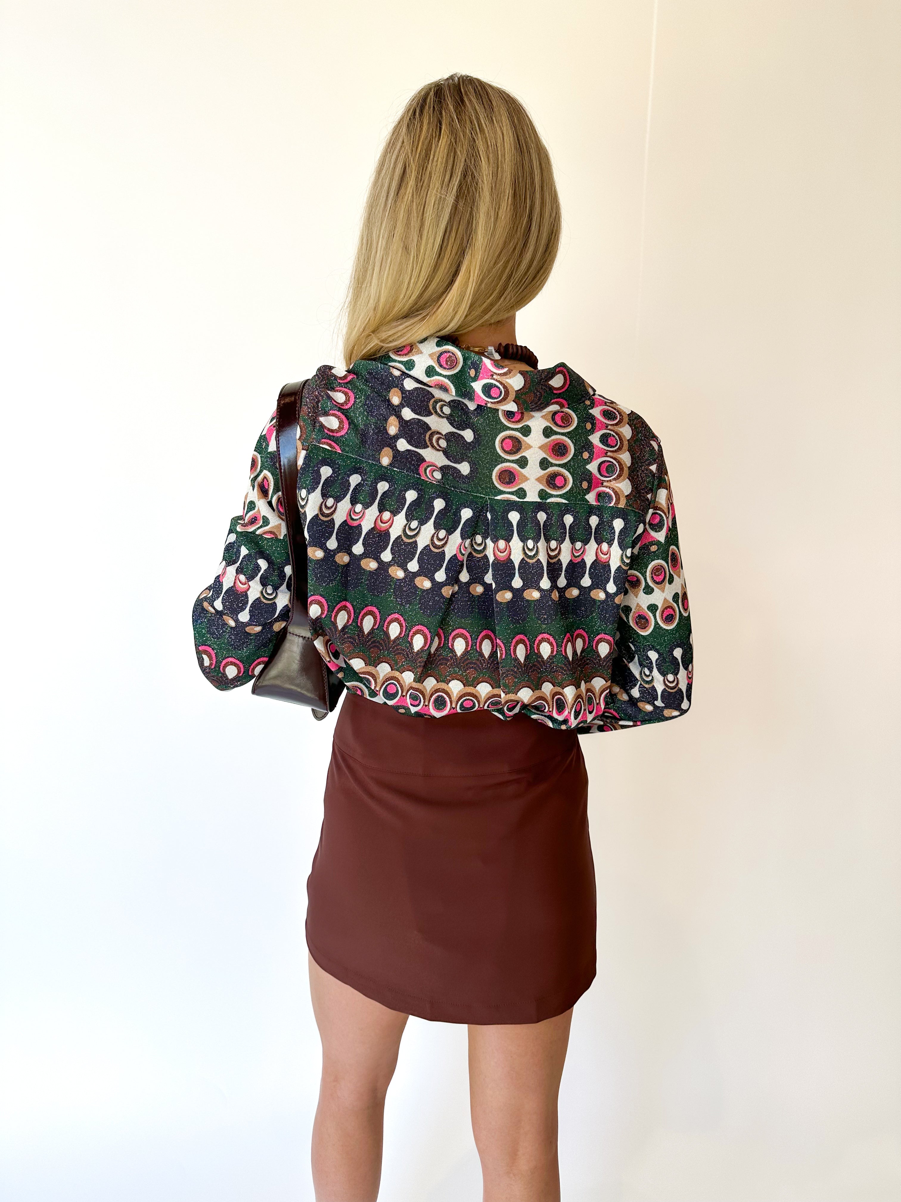 Elevate your wardrobe with this tailored A-line mini skirt, designed to flatter every silhouette. Its clean lines and structured fit offer a polished look perfect for both casual outings and dressier occasions. Crafted for comfort and style, this skirt effortlessly enhances your everyday elegance. Perfectly paired with the matching top for a fall date night!