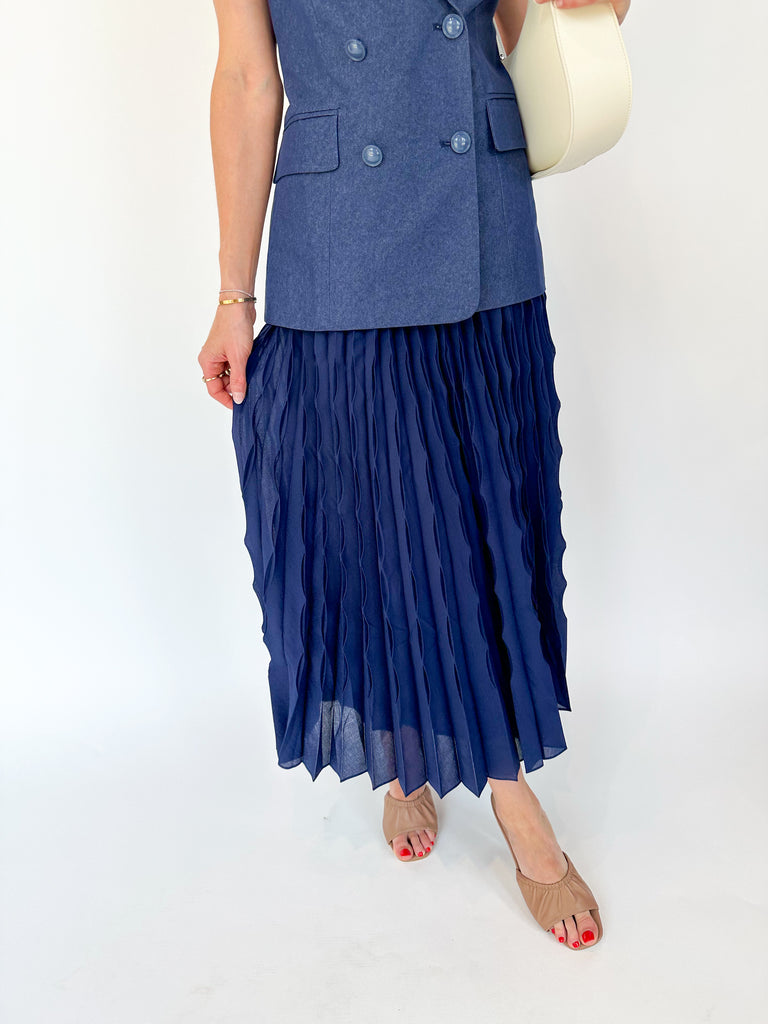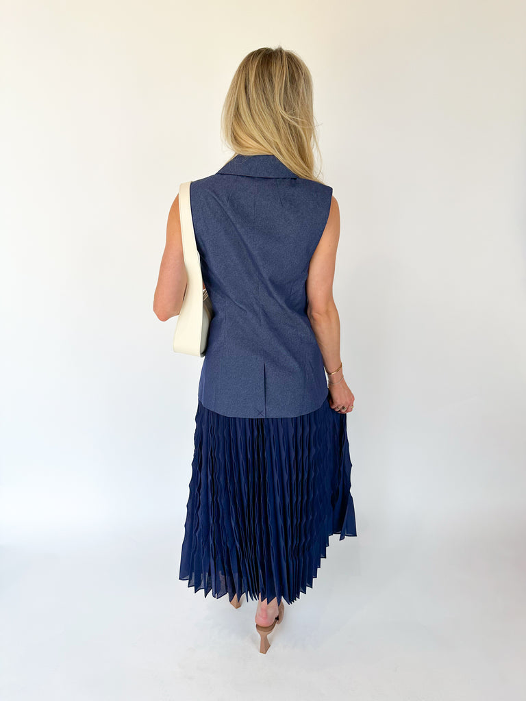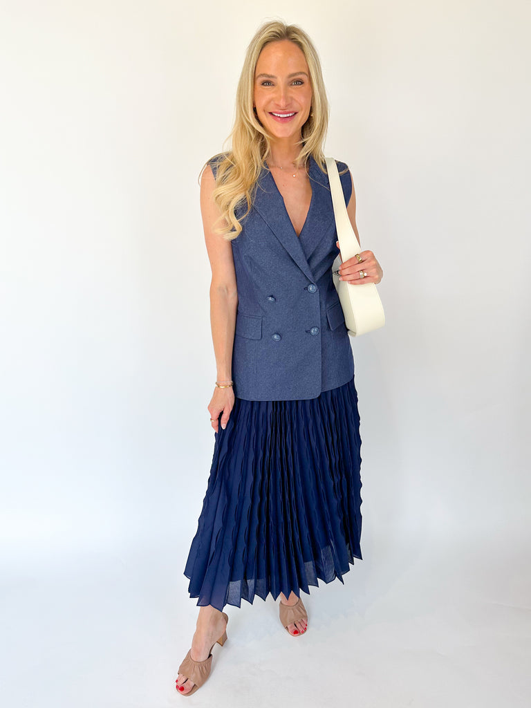 Embrace effortless style with the Tailored Vest Pleated Midi Dress. Designed to mimic the chic look of a two-piece, this dress offers the ease and comfort of a single midi silhouette. Its tailored vest top and flowing pleated skirt create a polished yet relaxed outfit perfect for any occasion. Elevate your wardrobe with this versatile piece that combines sophistication and comfort seamlessly.