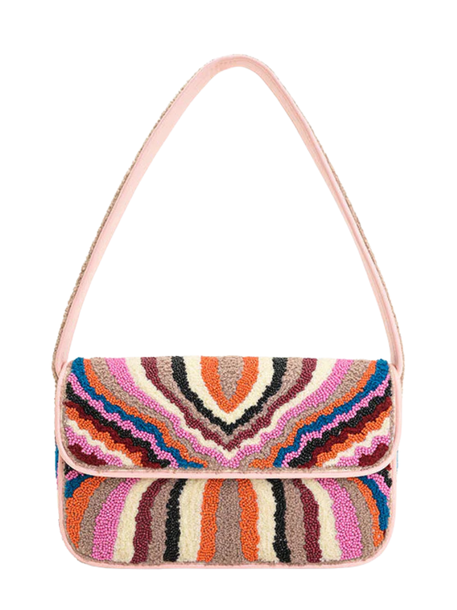 This structured shoulder bag is a vibrant work of art, showcasing a multicolored abstract pattern skillfully crafted with tufting and beading techniques. Designed to turn heads, it features a flap closure with dual magnets for both style and security. The elegant pink PU binding gives it a polished, refined touch, while the luxurious pink satin lining inside elevates the experience.