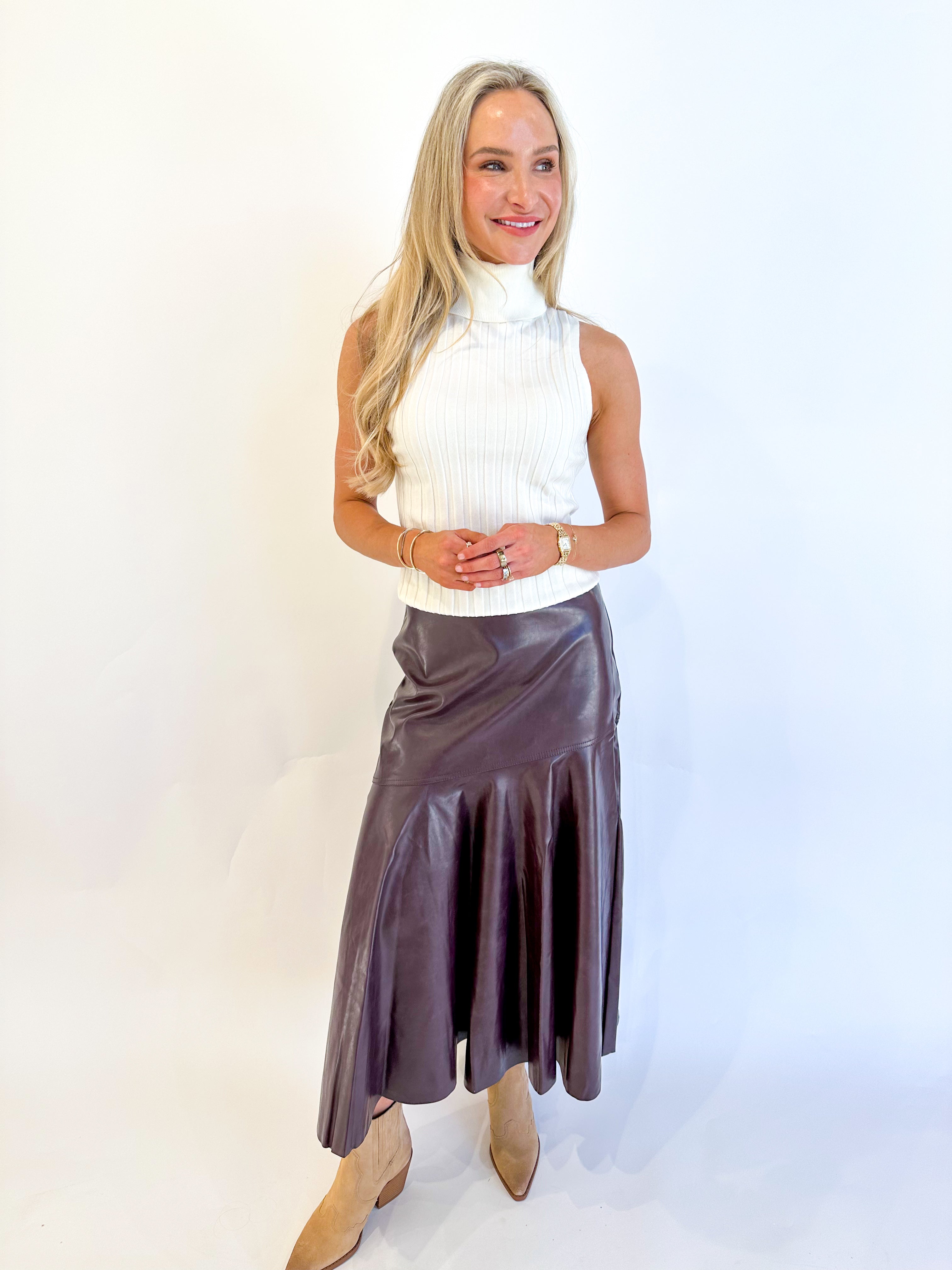 This ivory sleeveless turtleneck sweater features chic ribbed detailing, making it a versatile essential. Wear it alone for a sleek look or layer it effortlessly all season long. Elevate your wardrobe with this timeless staple.