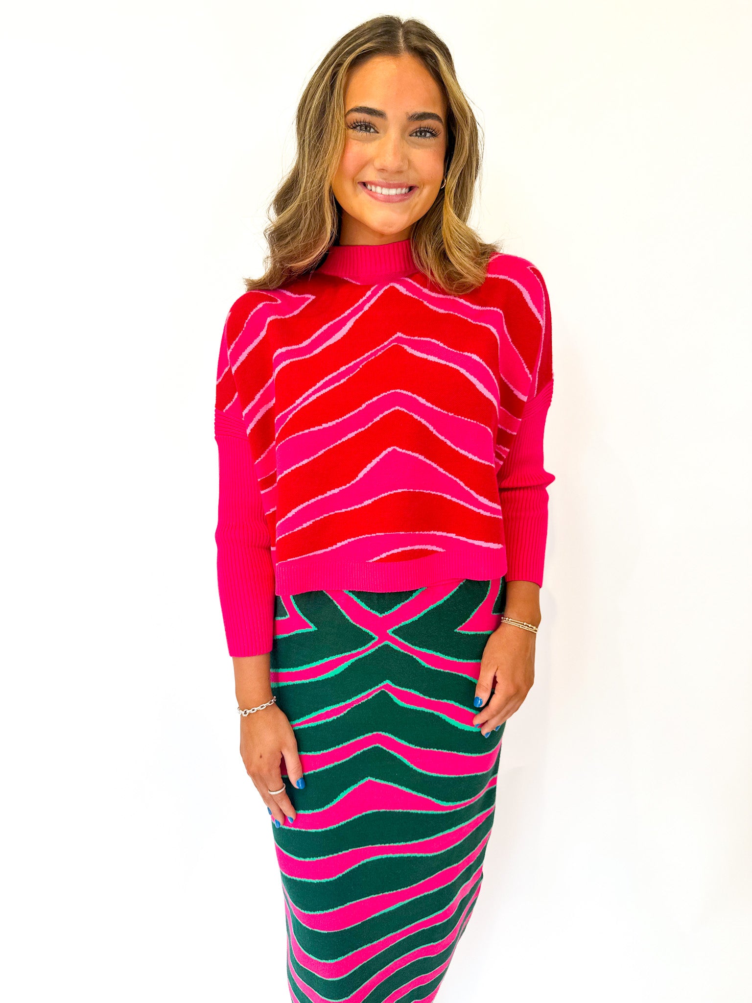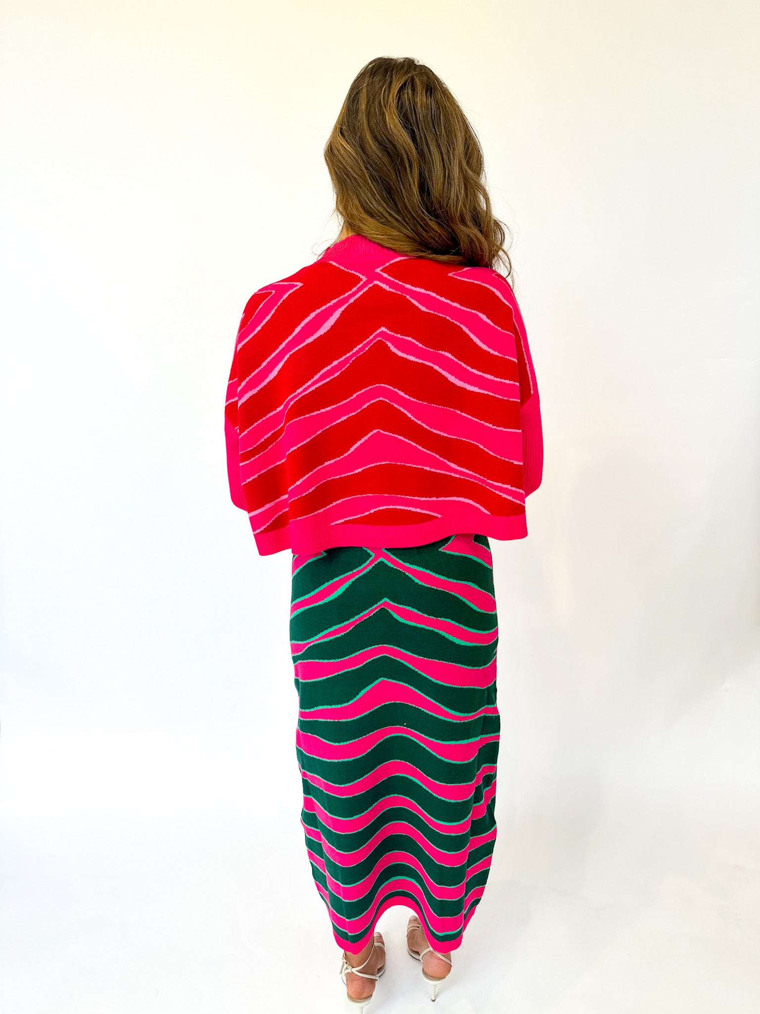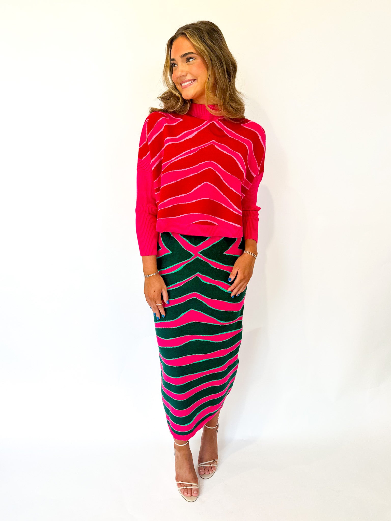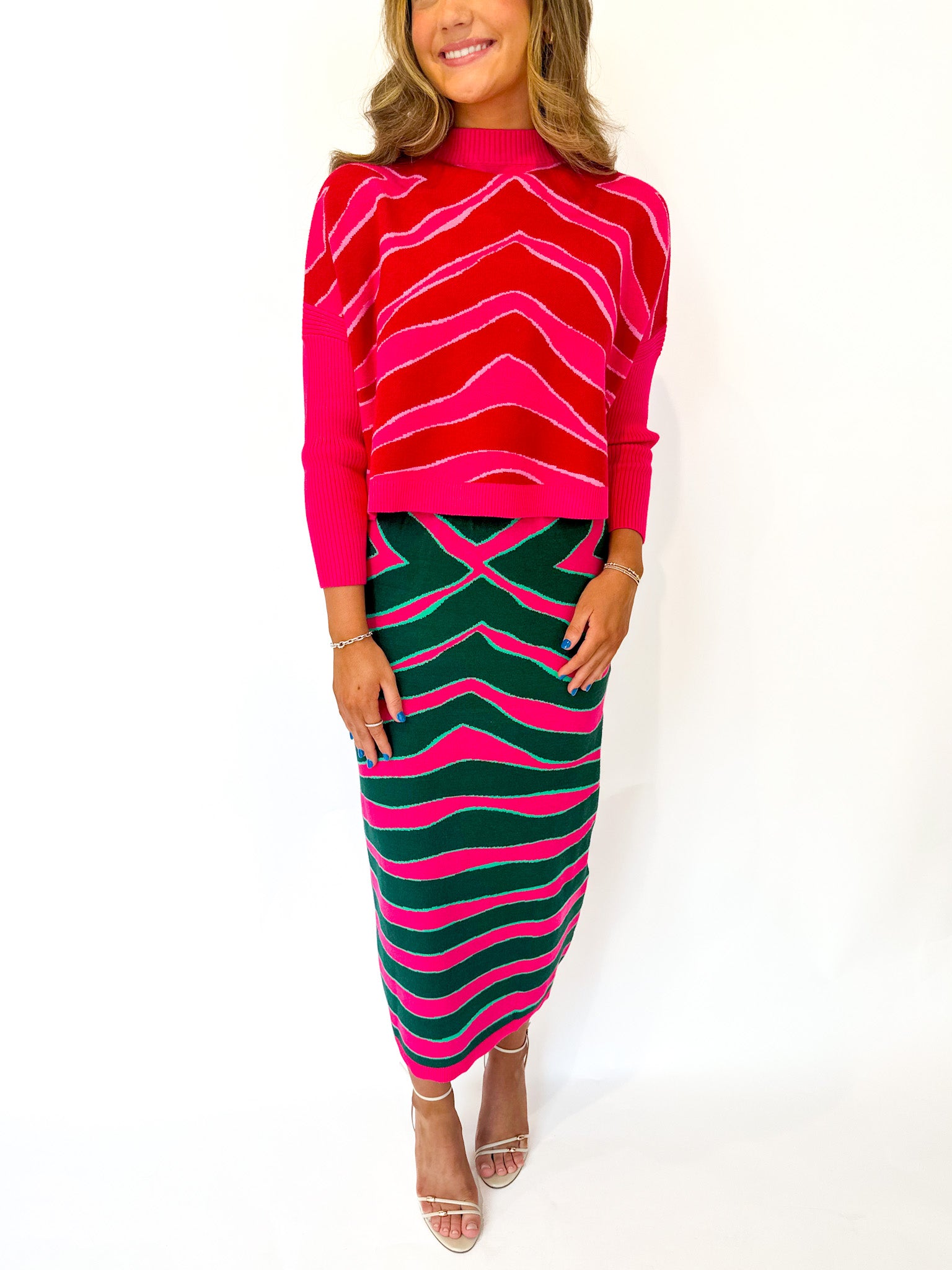 The Vivian Skirt in Ziggy Palm features a chic pink and green abstract stripe knit design. Its midi length and soft fabric combine style and comfort, making it a must-have for a vibrant, polished look. Pair it with the alternating color sweater, or a blouse to dress it up.