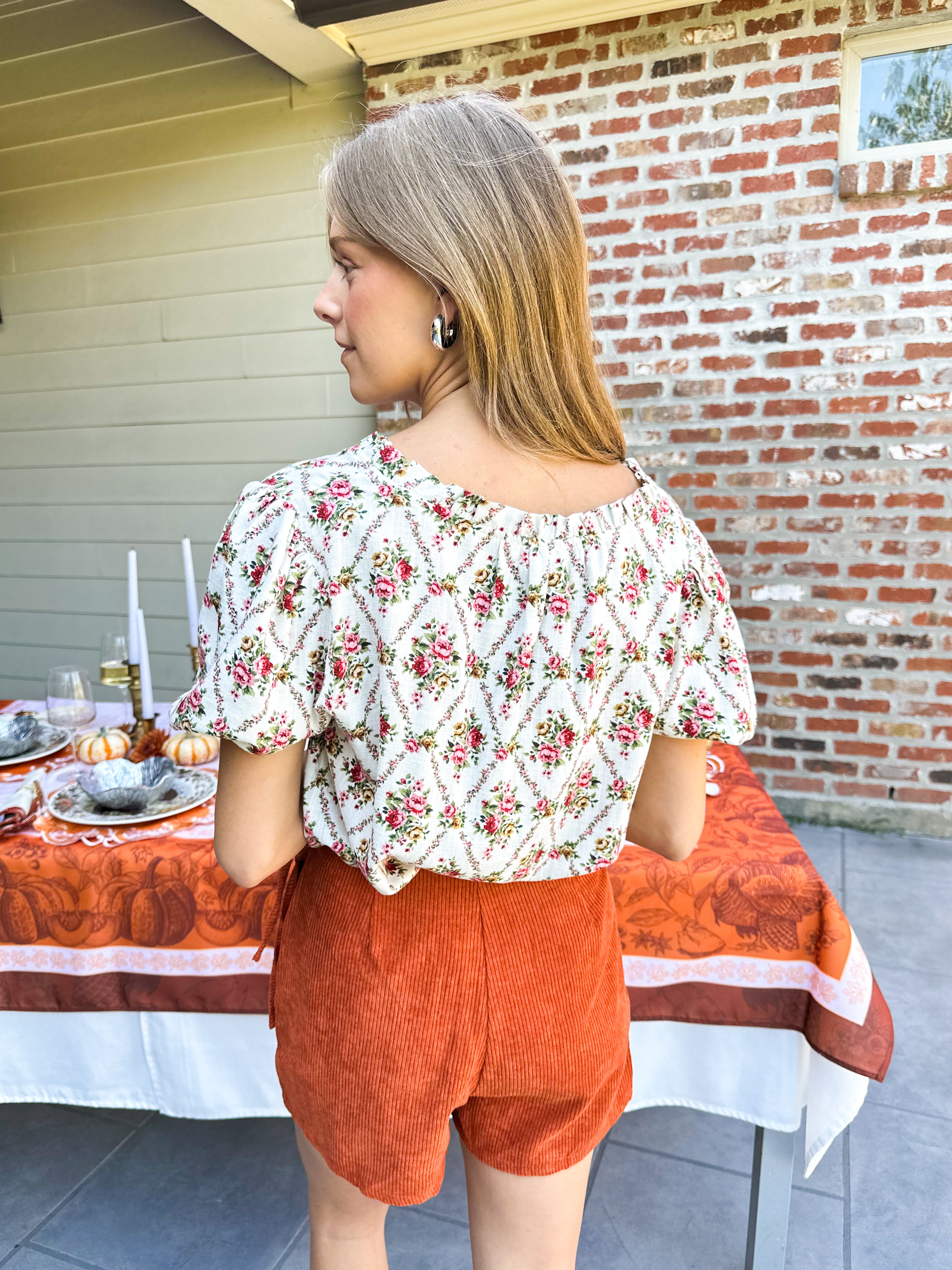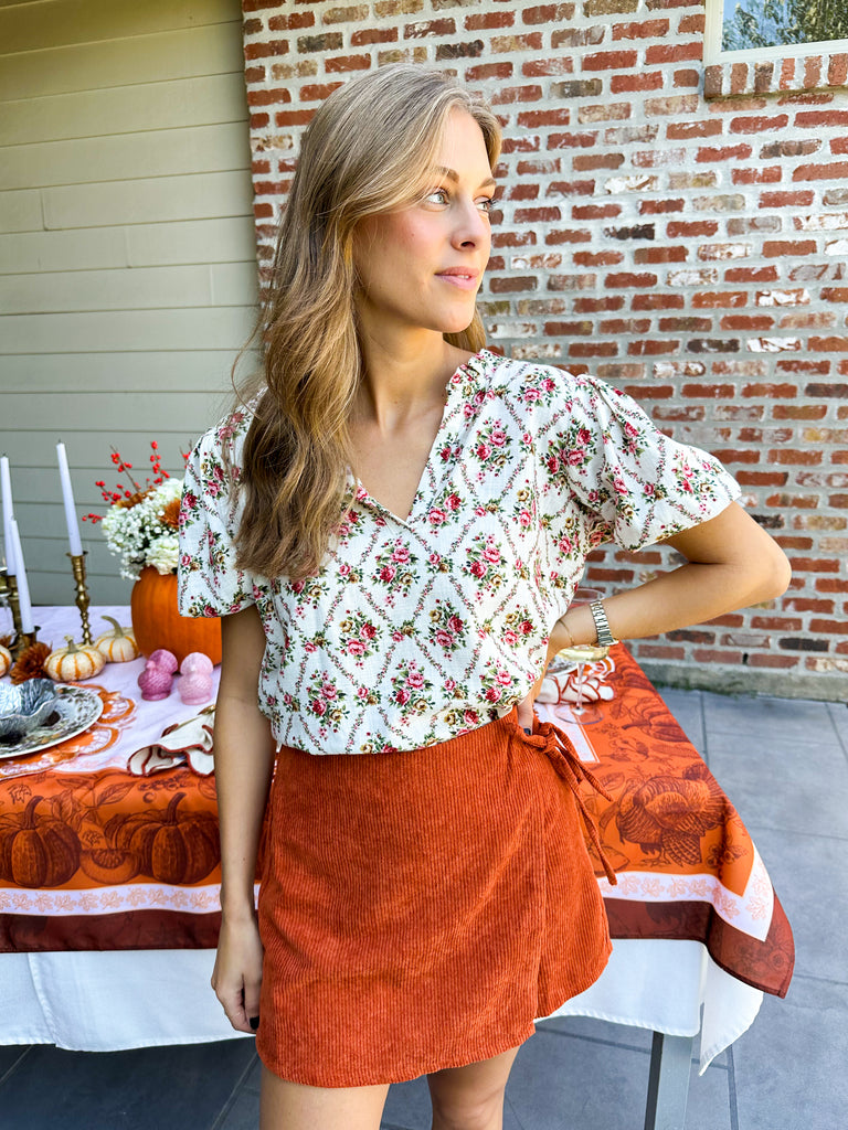 Elevate your fall wardrobe with this versatile wrap front corduroy skort in rich pumpkin spice. The flattering wrap design transitions seamlessly from casual weekend vibes to polished evening looks.